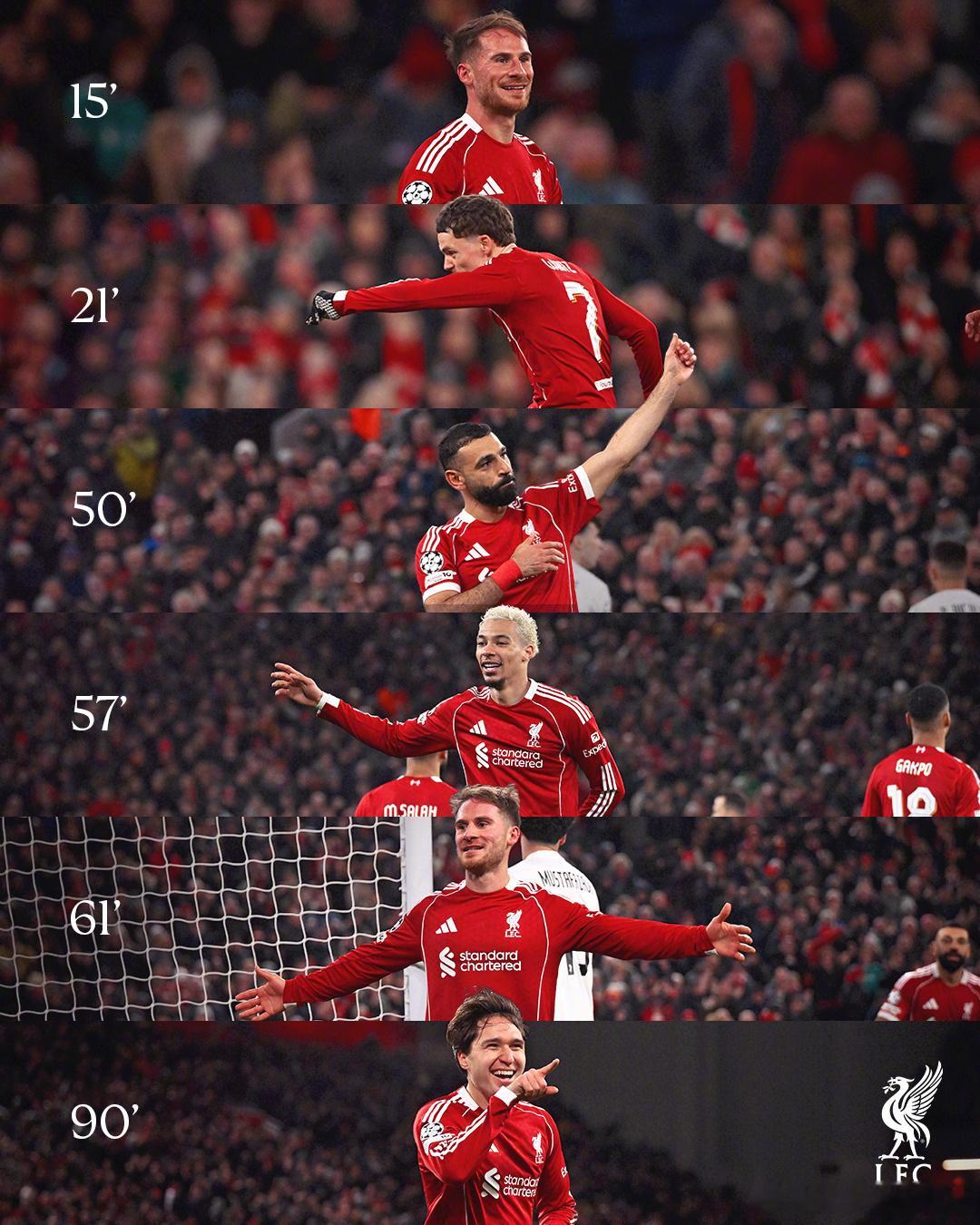 利物浦6比0卡拉巴克安菲尔德的球迷好久没有这么开心了!面对阿超劲旅卡拉巴克,范戴克上演助攻帽子戏法、麦卡利斯特梅开二度、萨拉赫打进精彩任意球、埃基蒂克长途奔袭破门、维尔茨贡献贴地斩、基耶萨推杆进洞。利物浦以欧冠联赛第三名的身份进入到下一轮,更夸张的是,前八名里多达5支英超球队......