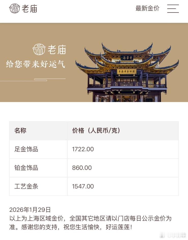 太疯狂了!一夜大涨百元,金饰克价首次站上1700元金饰克价涨至1708元29日早间,现货黄金直线拉涨,在突破5500美元后盘中一度逼近5600美元,最高报5598.750美元/盎司,随后快速回落100美元至5500美元附近。受此影响,部分国内品牌金饰价格也创历史新高,单日上涨百元左右。中新经纬29日查询发现,老庙黄金为1722元/克,单日上涨104元,周生生为1708元/克,单日上涨94元;老凤祥为1713元/克,单日上涨93元/克。个人投资方面,正信期货研究院29日早报称,需注意的是,芝商所和上期所再次上调贵金属保证金水平为当前过热的市场降温,高涨的看涨情绪使得当前价格短期内被显著高估,需谨防获利集中了结或地缘政治退潮所带来的波动风险。投资策略方面,谨慎偏多,短期内波动较大,建议观望为主或急跌轻仓试多,中长期以持多为主。