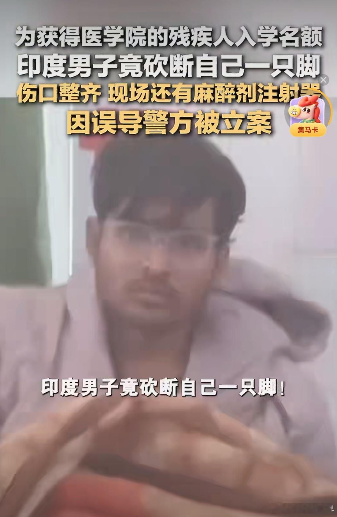 印度男子为上医学院砍断一只脚太奇葩了!正常人谁能干出这种事儿来?印度警方近日破获一起奇案:印度一名20岁左右男子在连续两次考试都未能通过印度国家医学入学考试(NEET)后,他砍断了自己的一只脚,伪装成暴力袭击的受害者,试图以此获得医学院的残疾人入学名额。 北京·梨园