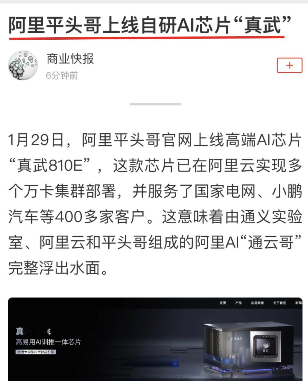 阿里“通云哥”正式亮相!自研AI芯片“真武”登场,中国AI全栈能力跻身全球顶级! 2026年刚开年,科技圈就迎来了一颗“重磅炸弹”! 今天(1月29日),阿里巴巴旗下的芯片公司“平头哥”在官网低调上线了一款名为“真武810E”的高端AI芯片,此前它已经在央视《新闻联播》中亮过相。 更关键的是,随着这款芯片的正式发布,阿里内部一个神秘的战略组织——“通云哥”黄金三角,首次完整地浮出了水面。 这个“黄金三角”由三部分组成:搞大模型的通义实验室、主攻云计算的阿里云,以及研发高端芯片的平头哥。 阿里正在把这三者打造成一台协同创新的“AI超级计算机”,目标是在阿里云上训练和调用大模型时,达到最高效率。 这意味着什么?这意味着阿里巴巴成为了继谷歌之后,全球第二家在大模型、云计算和AI芯片这三大核心领域都具备顶级自研实力的科技公司。 目前,全球范围内能做到这一点的,只有阿里和谷歌两家。 这次发布的“真武”芯片实力不俗。它采用全自研的并行计算架构,内存高达96GB,片间互联带宽达到惊人的700GB/s。 据业内人士透露,其整体性能已经超过了英伟达A800和主流国产GPU,与英伟达H20相当,甚至升级版的性能强于A100。 更重要的是,它已经不是实验室产品,而是经过了大规模实战检验——目前已在阿里云实现了多个万卡集群的部署,服务了国家电网、中国科学院、小鹏汽车、新浪微博等超过400家客户。 为了构建这套从模型、芯片到云的全栈AI能力,阿里巴巴整整布局了17年。 从2009年创立阿里云,到2018年成立平头哥,再到2019年启动大模型研究,长期的战略投入终于在今天结出了“通云哥”这颗硕果。 “通云哥”的亮相,不仅是一颗技术“炸弹”,更标志着中国科技企业在全球AI竞赛中,拥有了从底层硬件到顶层应用定义规则的完整底气。 AI竞争的下半场,单一模型或单一芯片的优势已经不够看了,“芯片+云+大模型”的全栈协同能力,正在成为衡量全球科技巨头的新标尺。