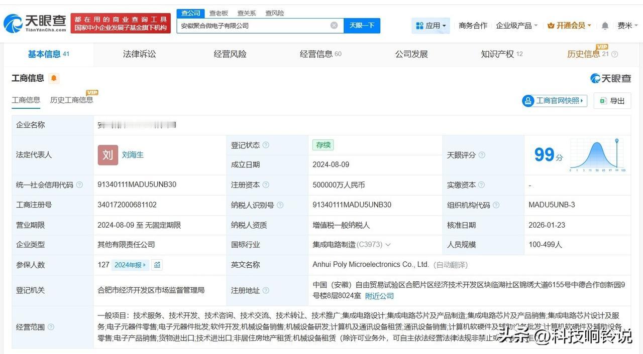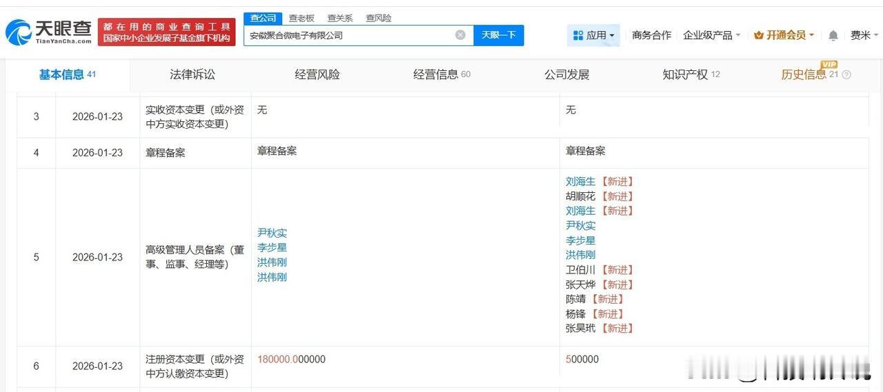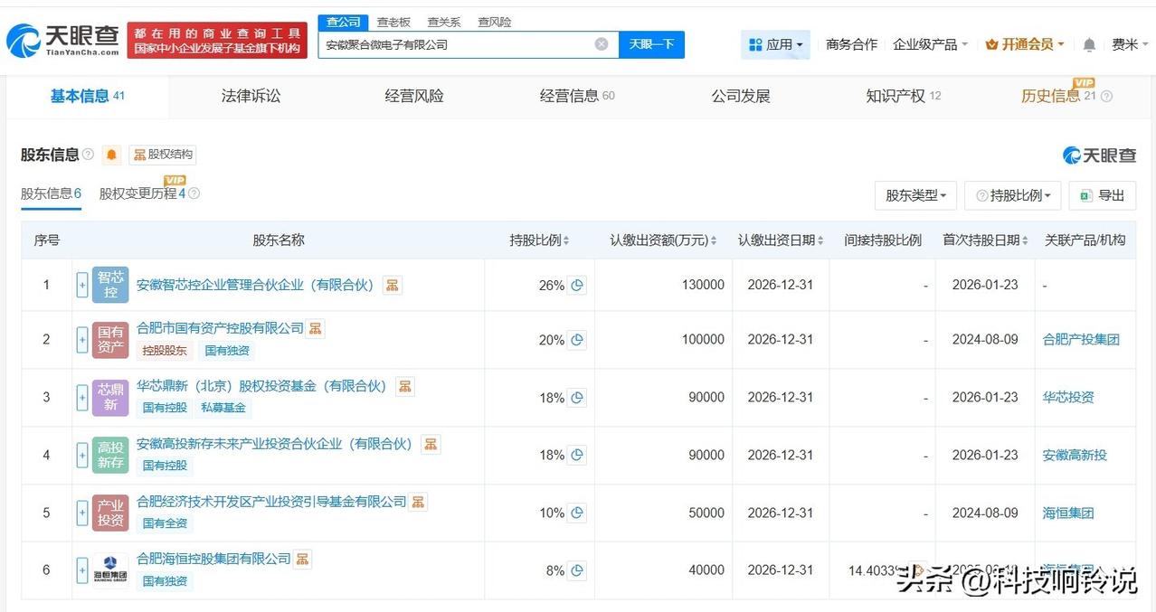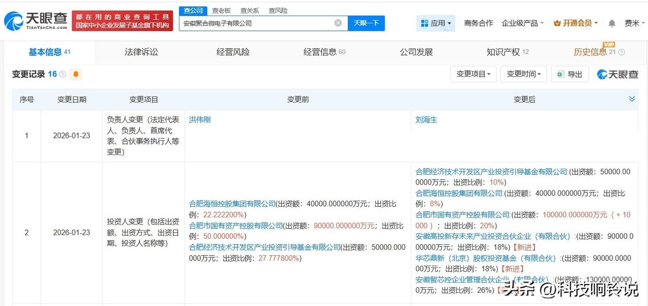 【大基金三期旗下基金等入股聚合微电子公司】 天眼查工商信息显示,近日,安徽聚合微电子有限公司发生工商变更,新增国家大基金三期旗下华芯鼎新(北京)股权投资基金(有限合伙)、安徽高投新存未来产业投资合伙企业(有限合伙)、安徽智芯控企业管理合伙企业(有限合伙)为股东,洪伟刚卸任法定代表人,由刘海生接任,注册资本由18亿人民币增至50亿人民币,同时,多位主要人员发生变更。 安徽聚合微电子有限公司成立于2024年8月,经营范围包括集成电路设计、集成电路芯片及产品制造、集成电路芯片及产品销售等。股东信息显示,该公司现由合肥市国有资产控股有限公司、合肥经济技术开发区产业投资引导基金有限公司及上述新增股东等共同持股。 天眼查信息:
