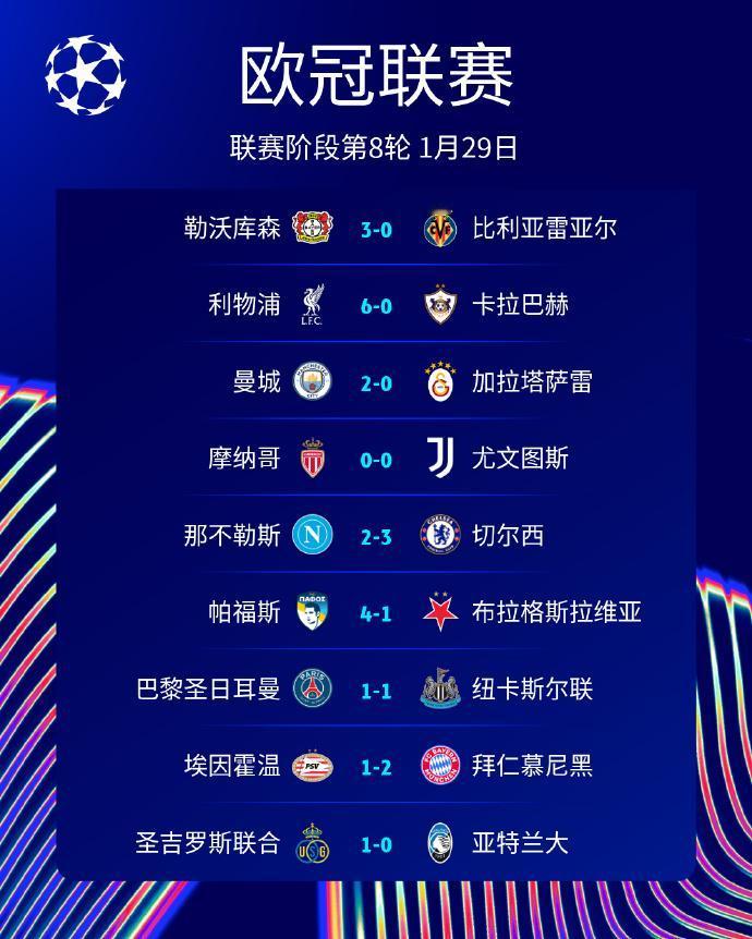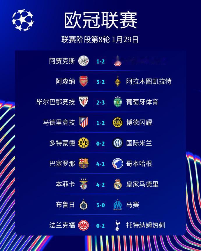 足球:2026欧冠联赛阶段第8轮赛果 8支球队直接晋级淘汰赛阶段,16支球队进入淘汰赛附加赛。