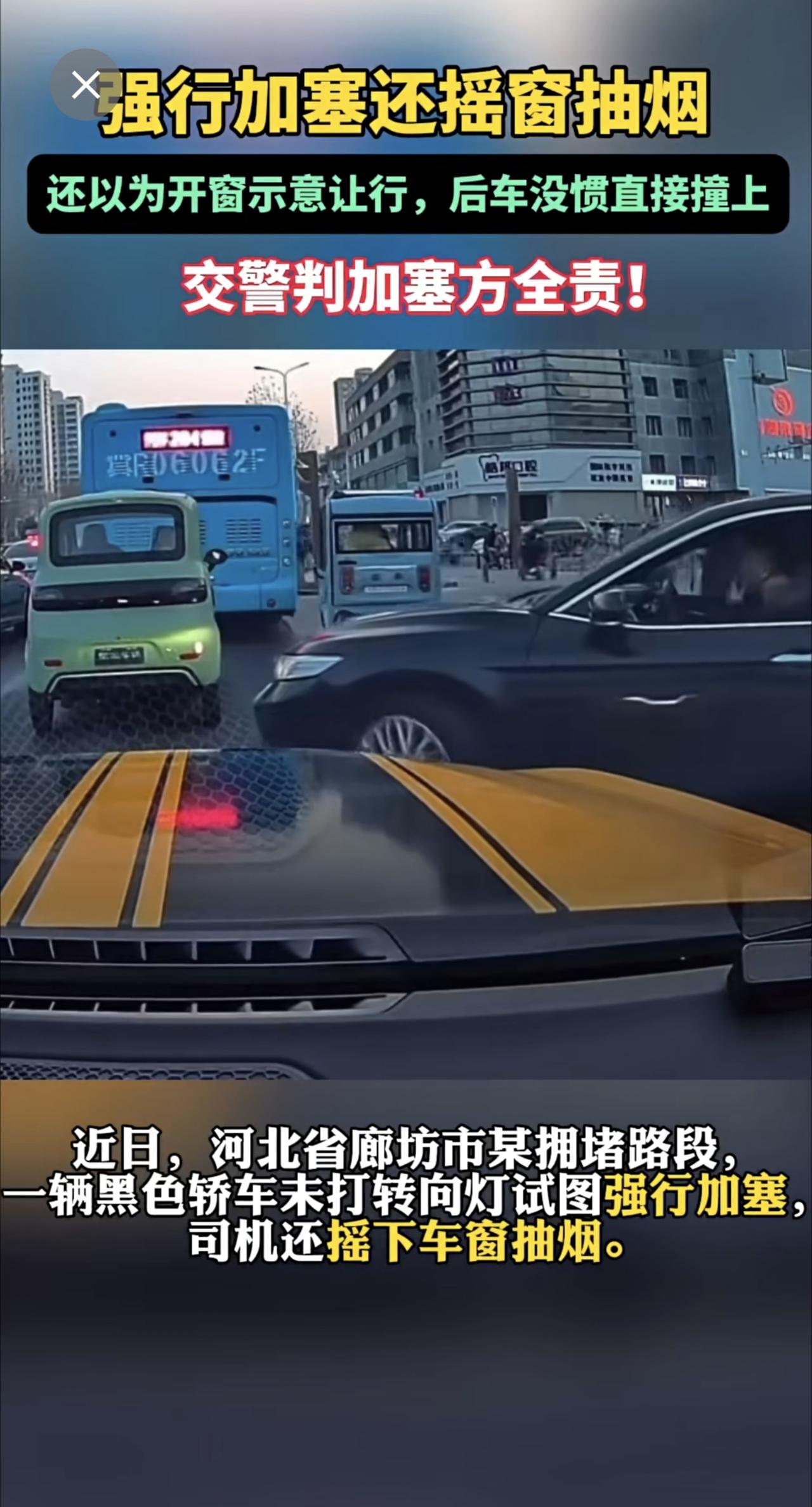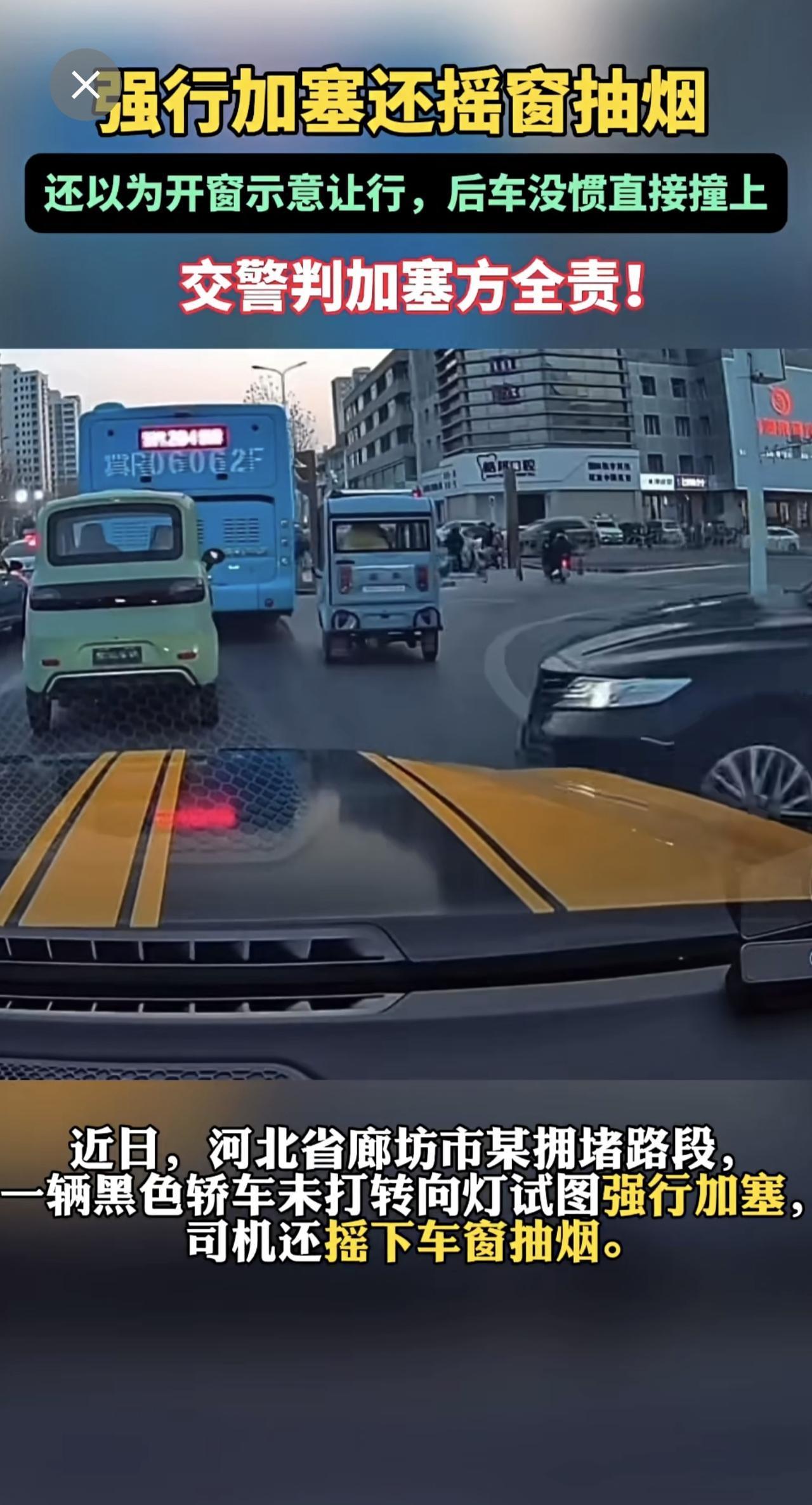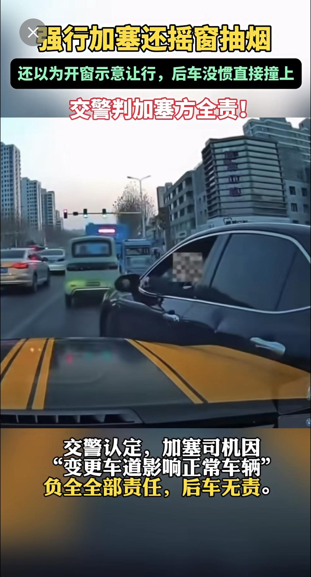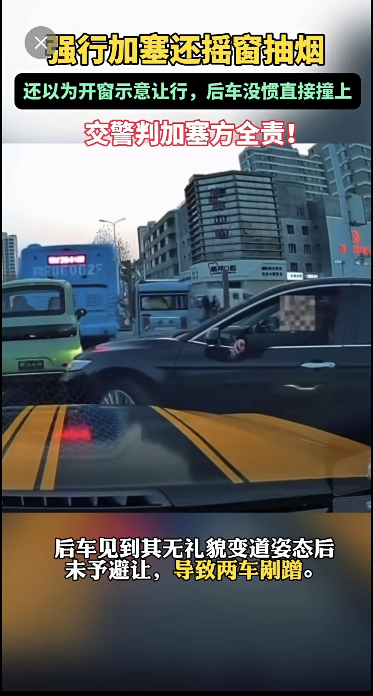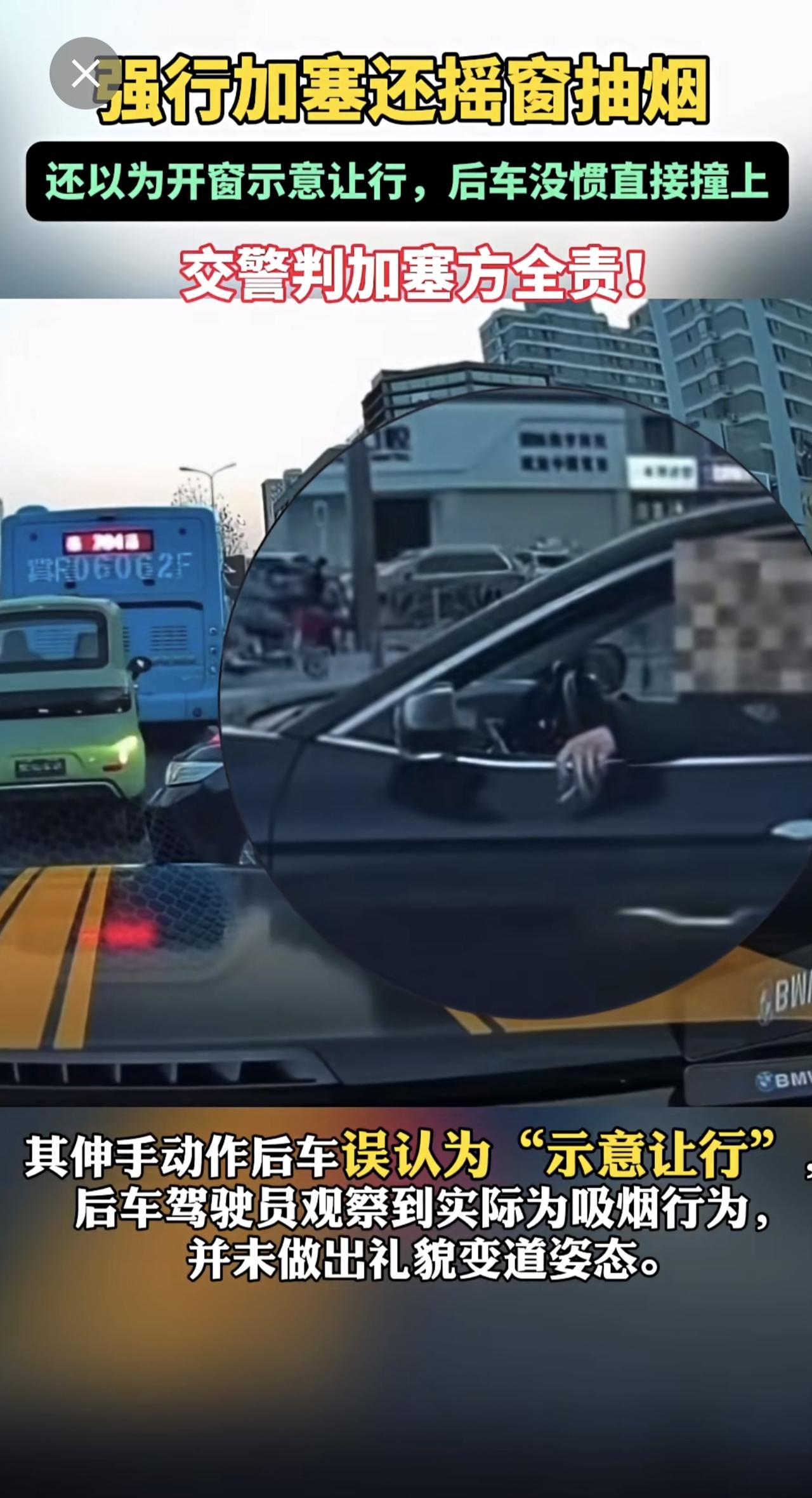 小车强行加塞还摇下车窗抽烟!还以为开窗示意让行呢,后车没惯着直接撞上