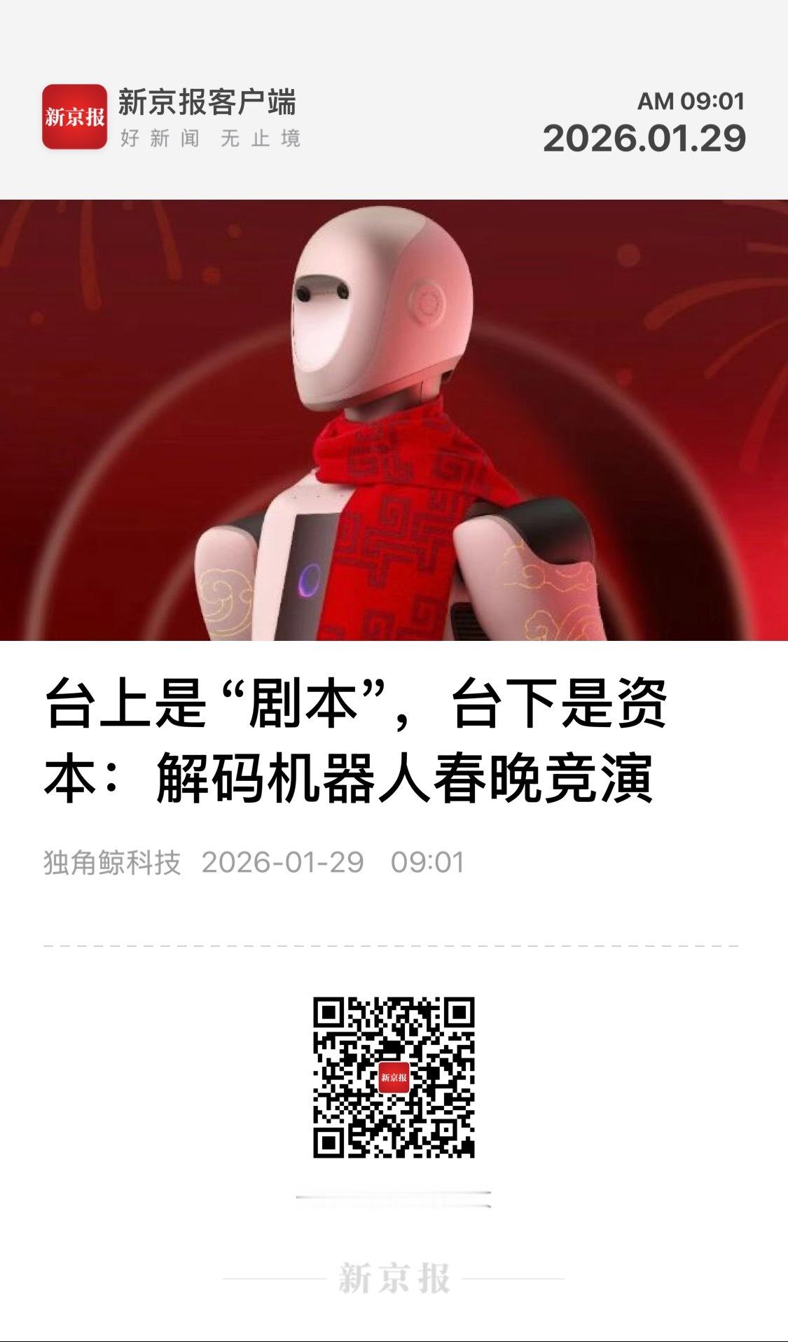 每日精选 【台上是“剧本”,台下是资本:解码机器人春晚竞演】 (新京报 2026-01-29 09:01 ) “我要上春晚”——这句口号,如今也成了人形机器人赛道扎堆竞逐、投资圈蜂拥押注的真实写照。 “对那些已有资本支撑、商业场景得到验证的公司而言,这是抢占行业先机的必然选择。”在具身智能行业增长与投资孵化合伙人老扬看来,当人形机器人渐显趋同,品牌声量便成为关键的胜负手。上春晚,不仅是表演,更是一场面向全民的“产品发布会”。 1月23日起的四天时间,魔法原子、银河通用、宇树科技三家机器人公司接连官宣,与中央广播电视总台2026年春节联欢晚会达成合作。 庚辛资本创始人张家康从中读出了更深的信号,这场集体亮相,宣告着机器人时代正式到来了。在资本眼中,这场“春晚竞演”本身就蕴藏着明确的价值预期:对一二级市场相关标的产生催化。 这样的场景似曾相识。去年,宇树机器人在春晚扭秧歌出圈,整个赛道迅速升温。彼时,宇树“老股”一股难求,不少投资人因未能入手而抱憾。 春晚悄然演变为机器人公司上市前一场超级“路演”。目前,宇树正处于冲刺上市前的关键阶段,而魔法原子在官宣上春晚的同日,释放了IPO意图,银河通用则已完成股改。机器人企业集体登场,不仅是数量增加,更意味着叙事的分化——各家公司正依托自身的技术特点,尝试在春晚讲述不同的机器人故事。 ▪️ 三家企业的“春晚剧本”: 陪伴,最强大脑,落地 一场关于人形机器人的“春晚竞演”,从幕后推至台前。从官宣内容来看,三家企业或将呈现不同的故事主线。 作为追觅科技孵化的创业公司,魔法原子是今年春晚机器人阵容中的新面孔。在官宣中,魔法原子将小型人形机器人定义为“暖心的生活伙伴”,四足机器狗则是“科技萌宠”,强调“科技与人文交融”。 有行业人士认为,这一设定与春晚蕴含的家庭、陪伴、温情等价值观高度契合。 技术上,魔法原子具备全栈自研能力,硬件自研比例超过90%,覆盖从关节模组到灵巧手的关键零部件。软件层面,其自研的“原子万象”大模型采用独特架构,支持垂直场景的快速落地。可以预见,魔法原子的春晚之旅或意在塑造“未来生活伙伴”的公众认知,完成市场启蒙。 银河通用则明确突出“具身大模型”这一技术概念。公司称,此次春晚机器人将全面呈现在复杂场景中的自主决策能力、高效协作水平与温暖服务体验,“向世界展示中国在具身智能与机器人技术领域的前沿成就”。 这也意味着,银河通用此次展示将不再局限于唱歌跳舞这类基础表演,而是重点亮相机器人的“大脑”核心能力,以及面向真实场景的任务应用落地成果,让抽象的技术转化为公众可感知、能理解的具象能力。 这与银河通用所坚持的技术路线及商业化能力有关,其自主研发的GraspVLA、GroceryVLA、NavFoM等多个涵盖操作、导航、应用等领域的端到端具身大模型,已让机器人落地零售、工业、医疗等场景“自主干活”。与百达精工合作部署超千台机器人以及在“银河太空舱”零售店自主售卖商品,这些落地案例体现了银河通用具身大模型的可用性。 宇树科技已是春晚的老朋友。从2021年的机器牛“犇犇”到2025年引爆话题的人形机器人扭秧歌,宇树凭借运动控制能力和工程化实现能力,拓宽了机器人进入人类生活的想象边界。 今年第三次登上春晚,宇树有望进一步展示其运动控制、规模化制造与场景应用能力。数据显示,宇树2025年人形机器人实际出货量已超5500台,并在科研教育、工业等领域逐步实现应用。 ▪️ 春晚舞台背后的资本推手: 一场上市前的超级路演? “我认为今年春晚的机器人表演肯定会比去年更好,因为当前机器人技术更为成熟,能呈现的表演形式也更多。”增长与投资孵化合伙人老扬常年关注具身智能领域,他参与孵化了GEIA全球具身智能加速器。 老扬向贝壳财经记者表示,此次具身智能大模型等相关技术的亮相,将为互动、任务演示等可能的表演形式提供技术支撑。 机器人在春晚的集体“竞演”,不仅是技术实力的展示,更被视作行业持续发展、吸引资本市场关注的关键信号。 老扬向贝壳财经记者表示,机器人亮相春晚具有多重意义,既体现了我国智能制造水平的提升,也为本土品牌提供了面向全球的输出窗口。此外,可以助力企业品牌出圈与出海,促进市场认知的普及。 “企业愿意投入资源上春晚,本身就说明其产品在成熟度上已达到一定阶段。对那些已有资本支撑、商业场景得到验证的公司而言,这是抢占行业先机的必然选择。”老扬表示,当前机器人产品已经开始出现同质化,如果在性能相差无几的情况下,品牌知名度越高的企业,越容易在合作选择中被选中。所以,春晚的曝光是企业品牌塑造的必经过程。 “集体亮相也宣告机器人时代正式到来了,在春晚舞台彰显中国机器人赛道的科技实力,对中国机器人行业都是利好。”张家康向贝壳财经记者表示,经历过去2-3年的持续投入,机器人赛道不管是技术、应用还是社会价值,都开始有初步的涌现,呈现很好的势头。 张家康认为,在资本层面,机器人上春晚“肯定对一二级市场相关标的会有促进”。 回顾上一轮资本热潮的直接引爆点,正是宇树机器人在春晚扭秧歌。表演之后,在资本市场,宇树“老股”一票难求,不少投资人因未能入手而抱憾,与此同时,众多机器人项目在资