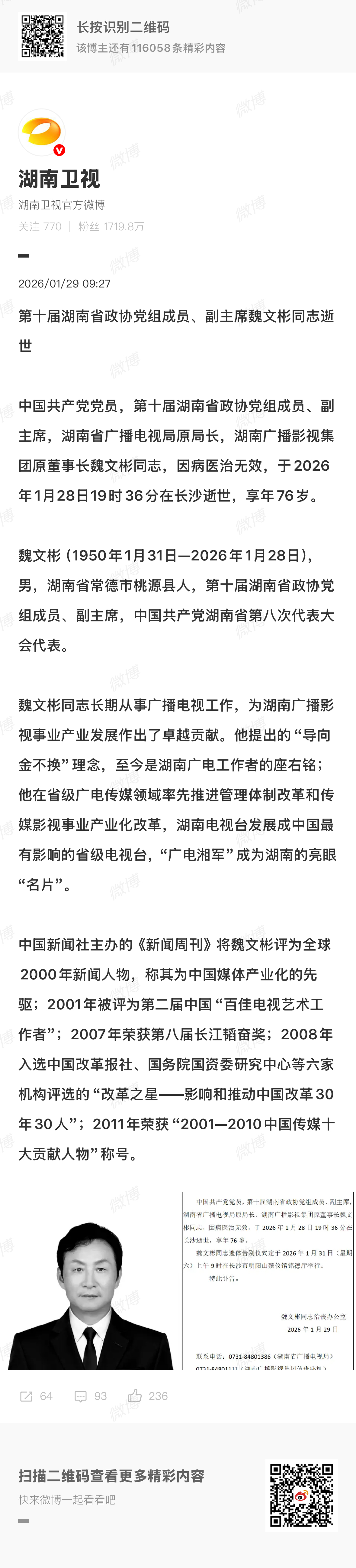 那个创办快乐大本营的人走了根据湖南卫视消息,中国共产党党员,第十届湖南省政协党组成员、副主席,湖南省广播电视局原局长,湖南广播影视集团原董事长魏文彬同志,因病医治无效,于2026年1月28日19时36分在长沙逝世,享年76岁🕯️魏文彬(1950年1月31日—2026年1月28日),男,湖南省常德市桃源县人,第十届湖南省政协党组成员、副主席,中国共产党湖南省第八次代表大会代表。也曾一手指导办了《超级女声》《快乐大本营》等经典节目。