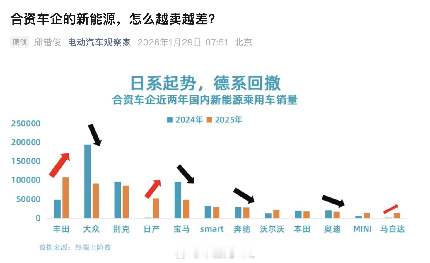 合资电车其实分成了两条路,一条路是本部开发,一条路是中国团队开发前者证明,要么平价车成本结构有问题,适应不了现在的电车平价化的趋势;要么在辅助驾驶和座舱适配性还不太够后者取得了很大的进步,主要是日产、丰田和通用三家,把主导权给了中国团队,在纯电、插电和增程都做了尝试,从账面来看销量是有破局的。2026年,哪条路能走通已经没有疑问了。大v聊车新能源汽车