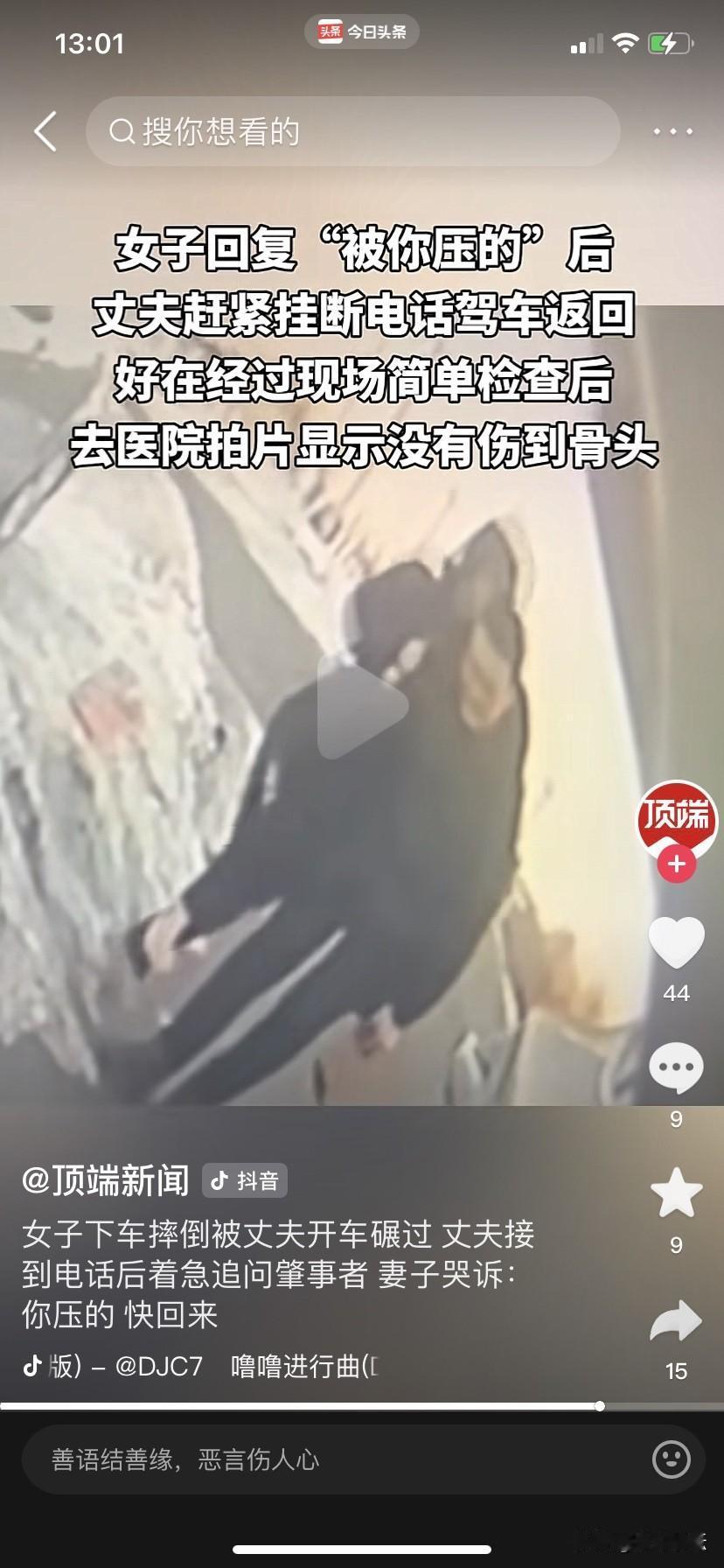 丈夫太粗心了,竟开车把自己的妻子腿部碾压了。 2026年1月28日,在辽宁刚下过一场大雪,公路上的积雪还未融化,一男子驾车到一处让妻子下车,不料妻子刚下车就滑倒了,丈夫并没有注意看后视镜,他直接开车碾压到了妻子的腿部,但他却亳不知情开车走了。妻子躺在地上不能动弹,她赶紧给丈夫打电话,丈夫迫不及待地问:谁是肇事者。妻子向丈夫哭诉:是你碾的快回来吧。丈夫闻讯后立刻驱车返回,他赶紧把妻子送到医院,所幸妻子在医院检查后没有伤到骨头。真是不幸中的万幸。 这丈夫也太粗心了,路上都是积血,应该确定妻子安全后再离开。 马上要过年了,祝各位司机朋一路顺风,开开心心过大年。[祈祷][祈祷]
