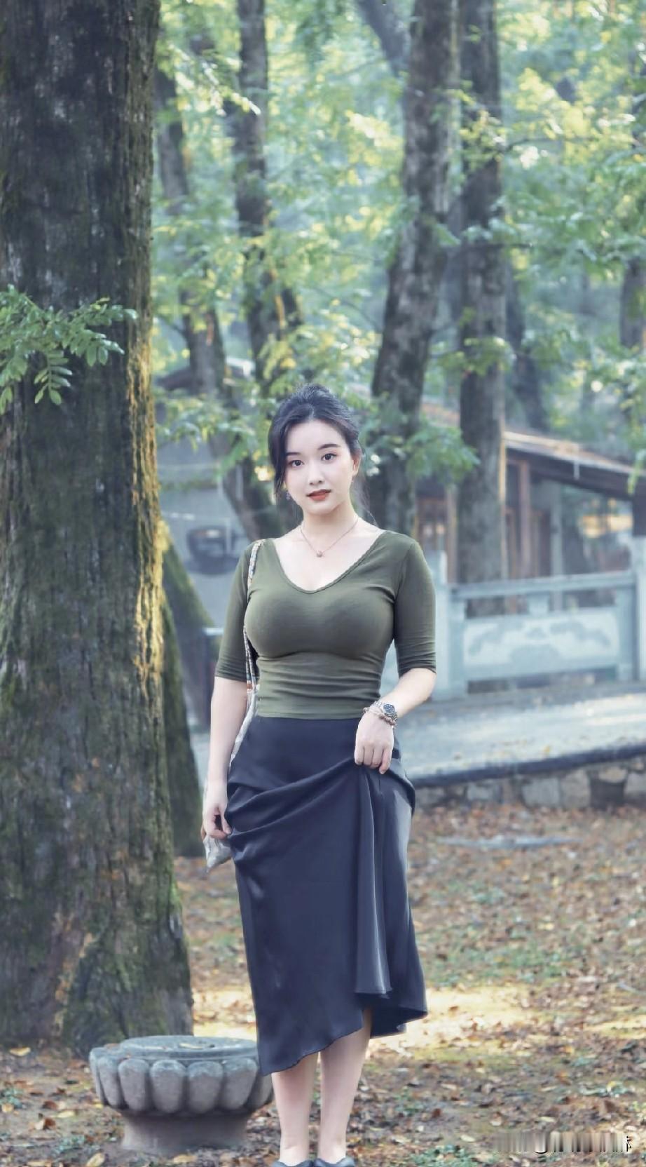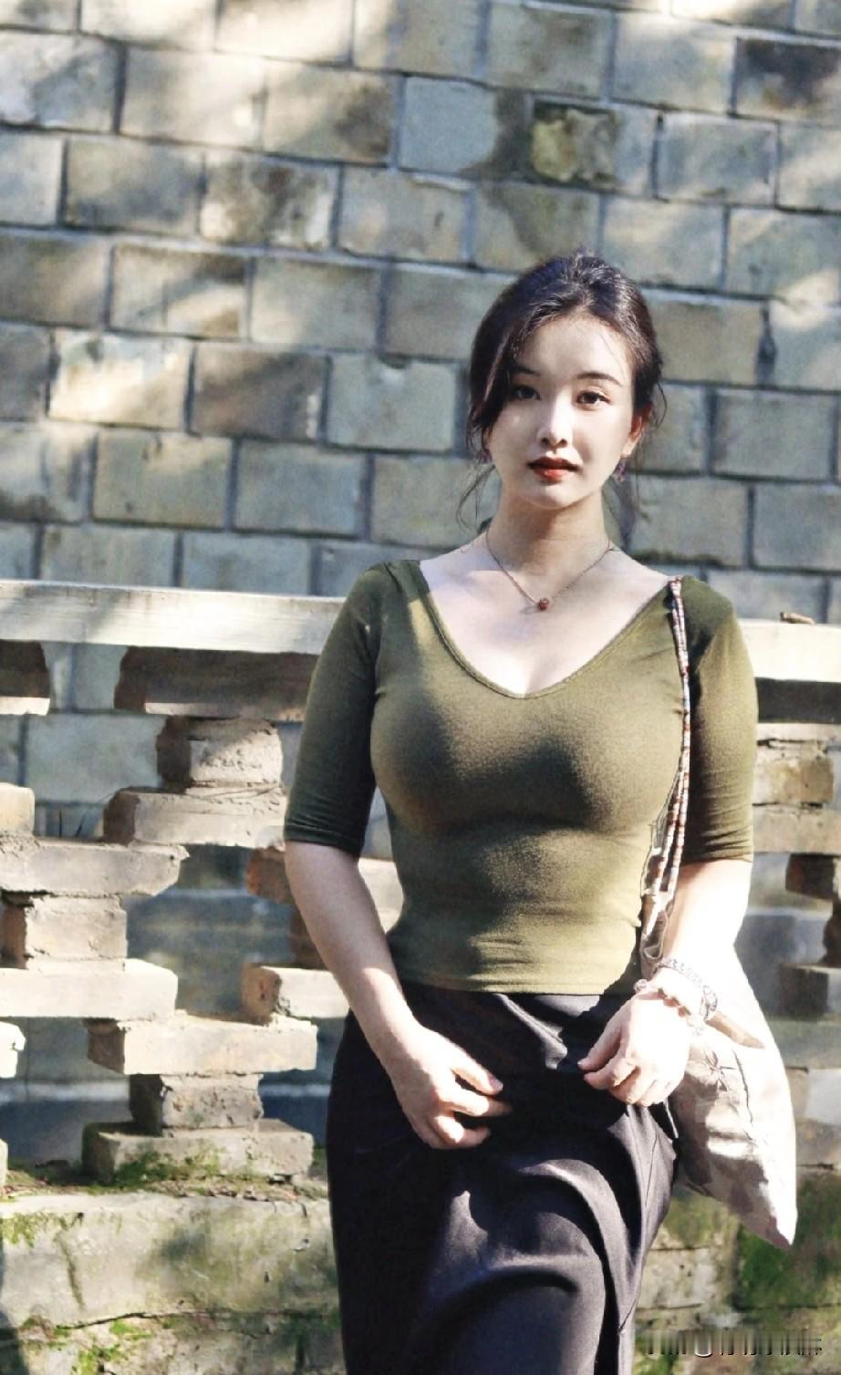 复古红墙前,优雅绿衣女子,时尚与古典的完美融合。