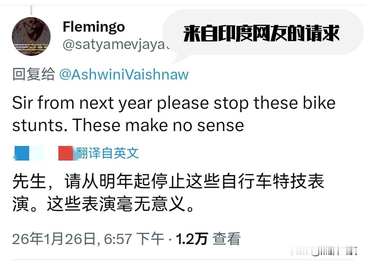 每次都玩摩托车杂耍,印度网友都无法忍受了。 印度铁道与工业信息部长发印度部队传统摩托车杂耍视频,配文【巴拉特的数字化与自研力量】,惹恼印度网友。 他们也实在受不了这种毫无意义的表演外加空洞的口号。