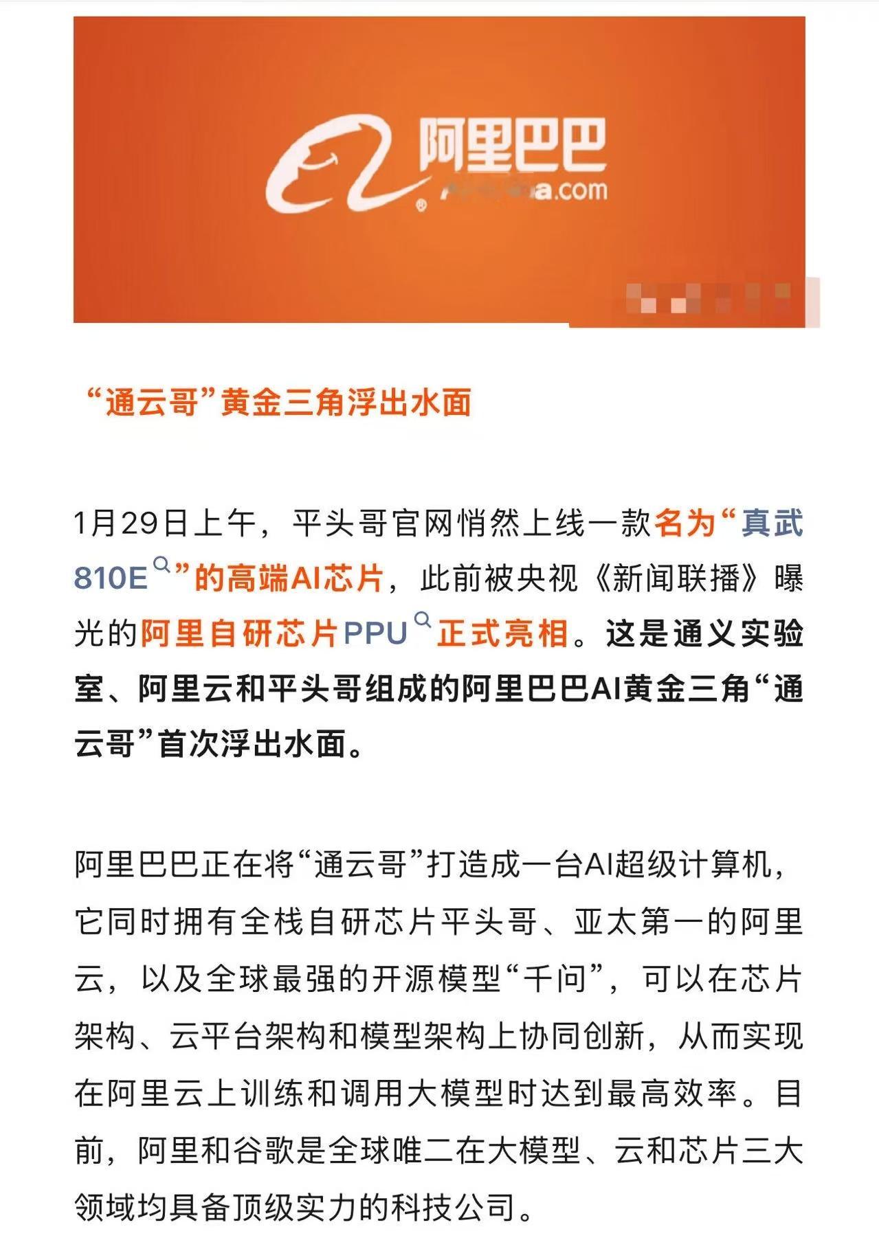 阿里通云哥浮出水面其实一开始还以为通云哥是内部人员的外号啥的,居然是阿里最硬的底牌?研究完吓我一跳,“大模型+云+芯片”,通、云、哥,自研技术突然就腾飞到这个地步,也怪我这段时间关注得少了,三件事能进入同样的协同节奏,啥概念?2026年大家都能期待一下了哈!