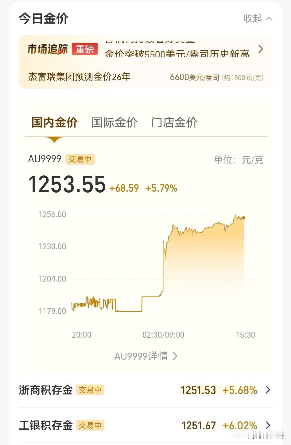 这是我观察黄金价格以来涨幅最大的一天。 如果不是因为我刚刚入手不够七天,卖出需要付0.1%的费用,我今天一定出手。 这个涨幅有点吓人,感觉要崩盘。 黄金从来都不是用来炒作赚钱的,大涨就是一个崩盘的信号,卖到手里就是钱,就具有购买力。 继续持有有可能涨,但最终是跳水下跌,而且你不知道这个跳水临界点在哪里,所以最好就是赚到就变现,稳赢。 可能你赢到的不是最多,但你赢了。想赢到最后一分钟,赢到极致,那有90%的机率就是跌下去。 如果一周后仍然在涨,我不犹豫,卖。