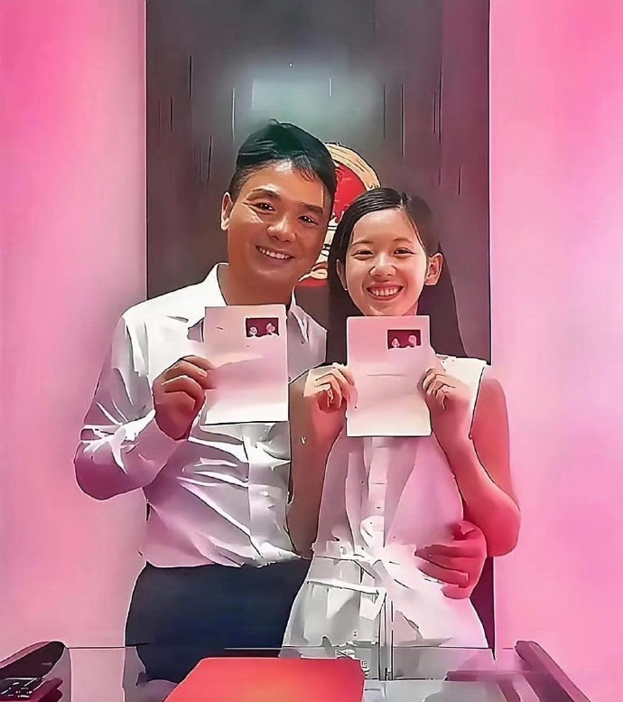 刘强东章泽天领证后合照曝光! 刘强东当时41岁,章泽天还差1个月才满22岁,年龄相差19岁,章泽天是清华学霸,当年赴哥大做交换生时结识刘强东,二人相恋后顺利领证。