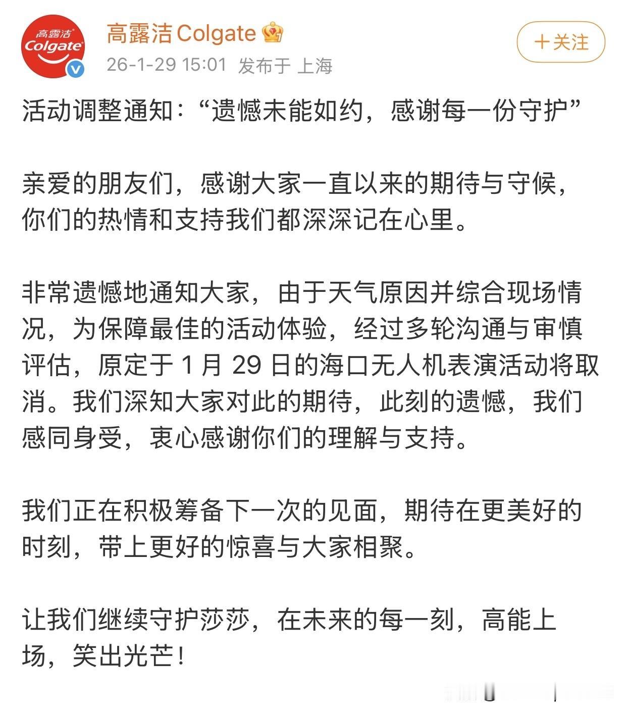 1.29日,孙颖莎现身高露洁评论区,发了一句话,还带了一个小太阳🌞 高露洁原定29日在海口有一个无人机的应援,现因天气和现场综合情况,暂时取消活动,很遗憾的通知大家。 莎莎说:“谢谢大家,回头见🌞” 莎莎说啥时候见,就啥时候见呗,回头见也行, 亚洲杯就看到了。 莎莎还会发一个小太阳,很是可爱。