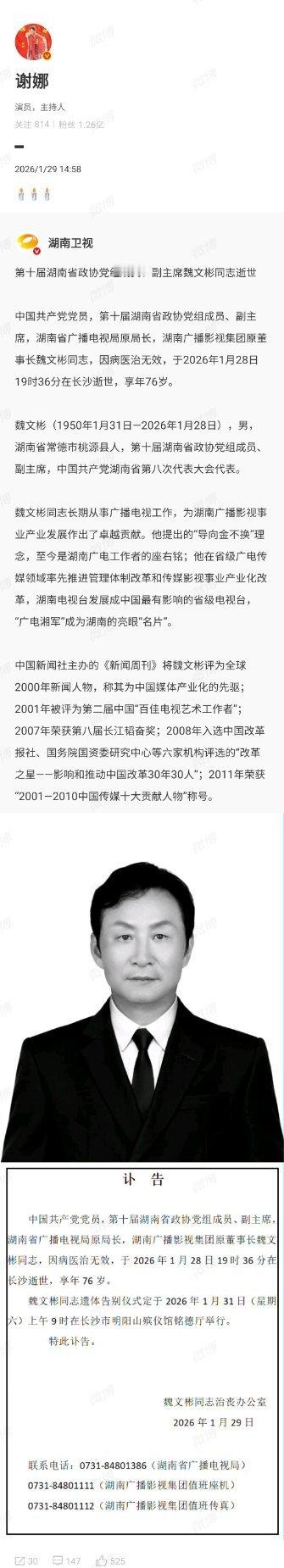 谢娜发文缅怀《快乐大本营》创办人魏文彬同志,先生一路走好谢娜发文缅怀快本创办人谢娜发文悼念快本创办人 谢娜缅怀快乐大本营创办人