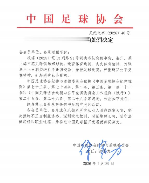 直播吧01月29日讯足协发布“假赌黑”处罚结果,原上海申花足球俱乐部球员秦升,进行不正当交易,操控足球比赛,被终身禁足。