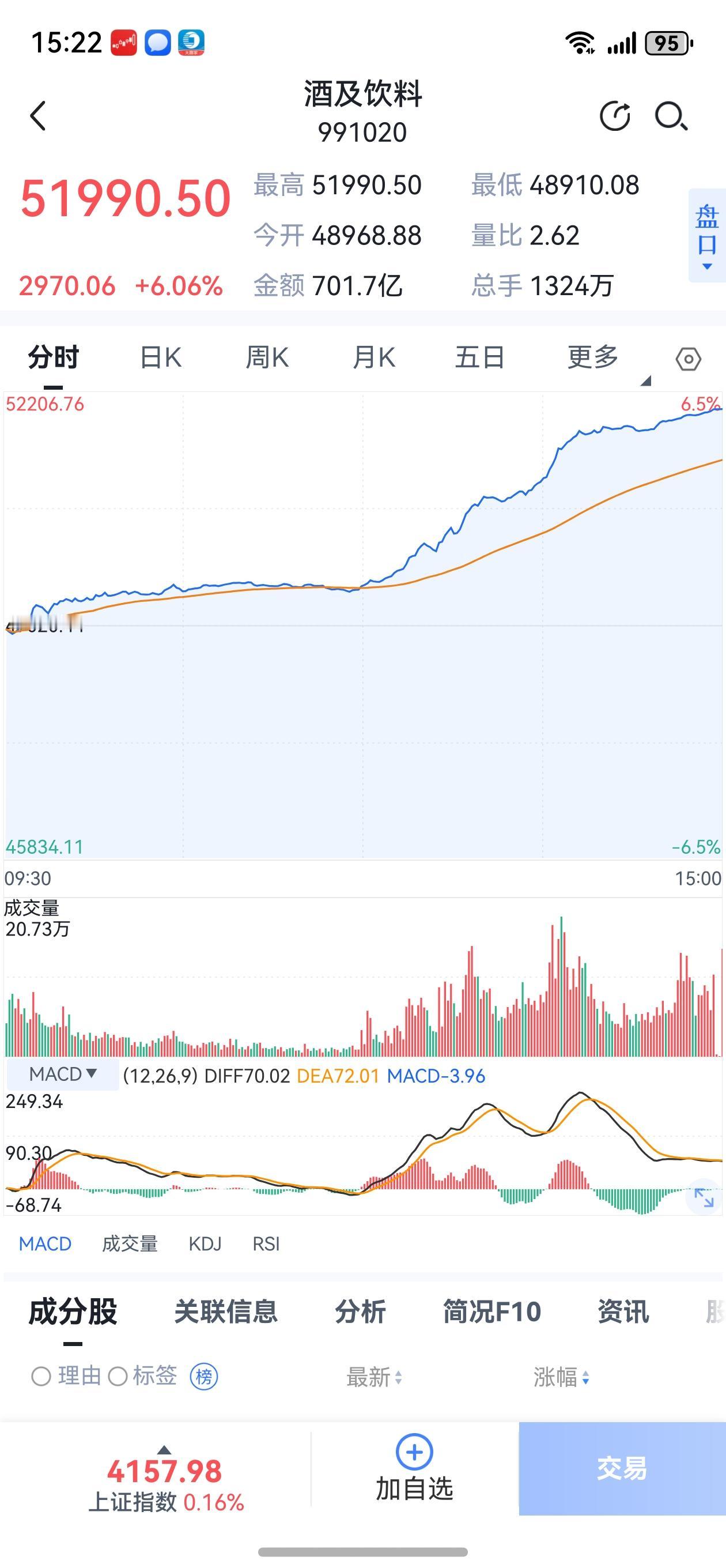 春节将至,美酒上桌。 酒香也怕巷子深,佳节将至,白酒企业集体躁动。 今天午后14时07分,白酒及饮料赛道,突然爆发,指数上涨6.06%,19只白酒股票涨停。 每年节假日,旅游酒水消费行业,总会借机表现。 距离春节还有半个多月时间,酒水饮料个股,今日联袂上涨,可以说是炒节日消费的预期。 今年A股开局火爆,前有航空航天,后有Ai有色,踏准节奏的投资者,吃的满口流油。加之茅台Ai平台上线1499元平价酒,更是调足了偏好酱香酒食客的味口。 除夕夜,品着各式美酒,收看央视春晚,抢着腾讯万元红包,感觉画面感好爽。