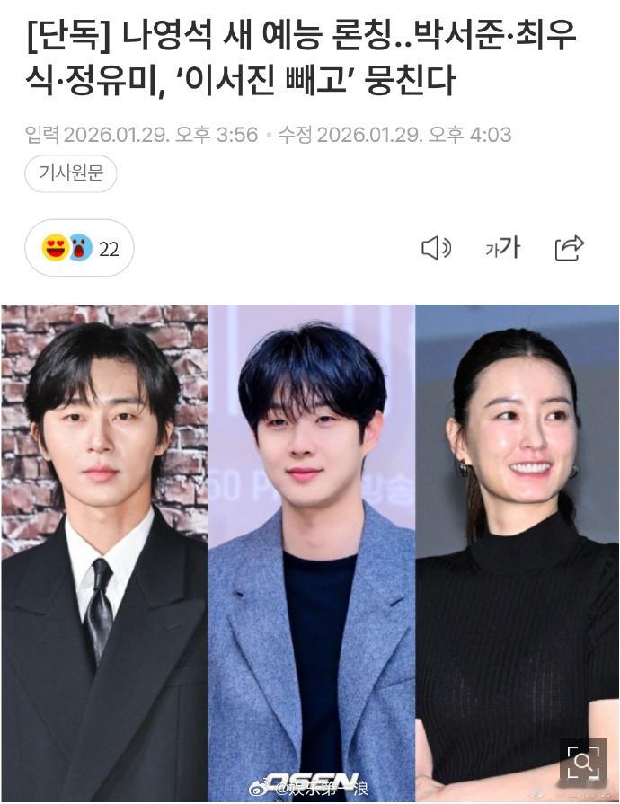 郑裕美朴叙俊崔宇植出演罗PD新综艺朴叙俊崔宇植郑裕美出演罗PD新综艺朴叙俊、崔宇植、郑裕美 出演罗英锡新综艺,他们仨没有李瑞镇社长、也没有工作、去休息旅游的综艺,一共六期 2月底韩国录制,4月底播出。
