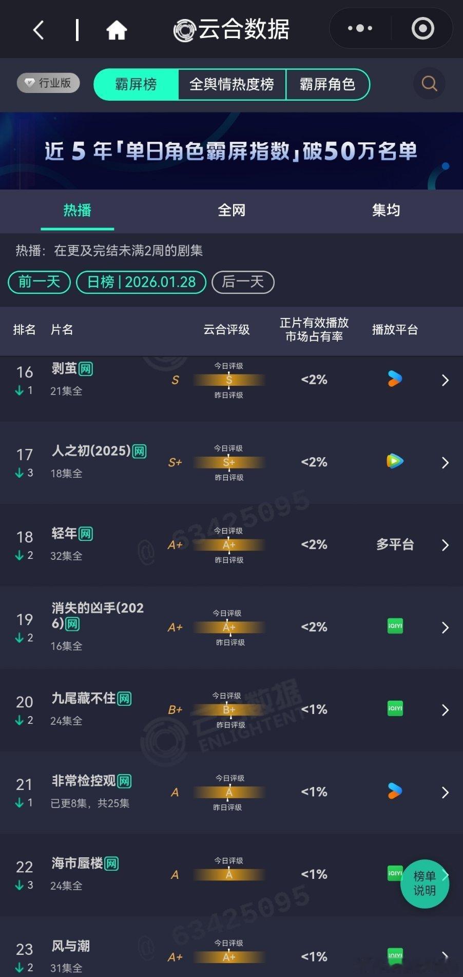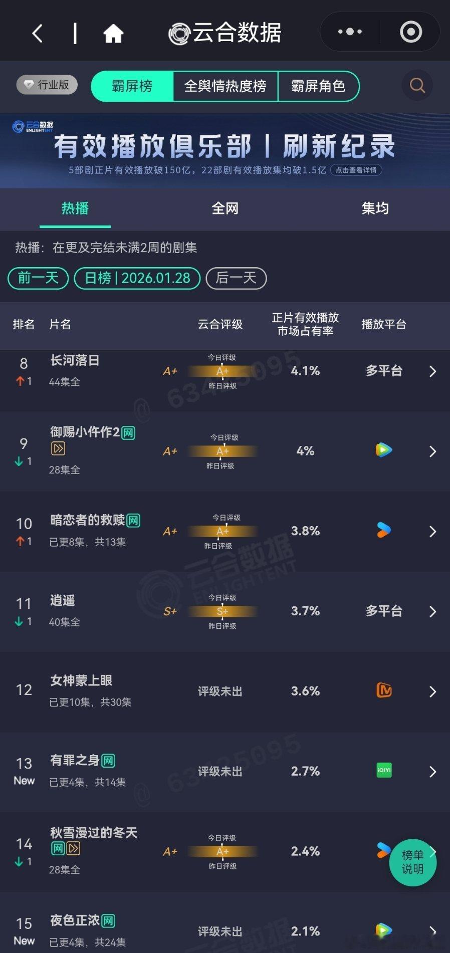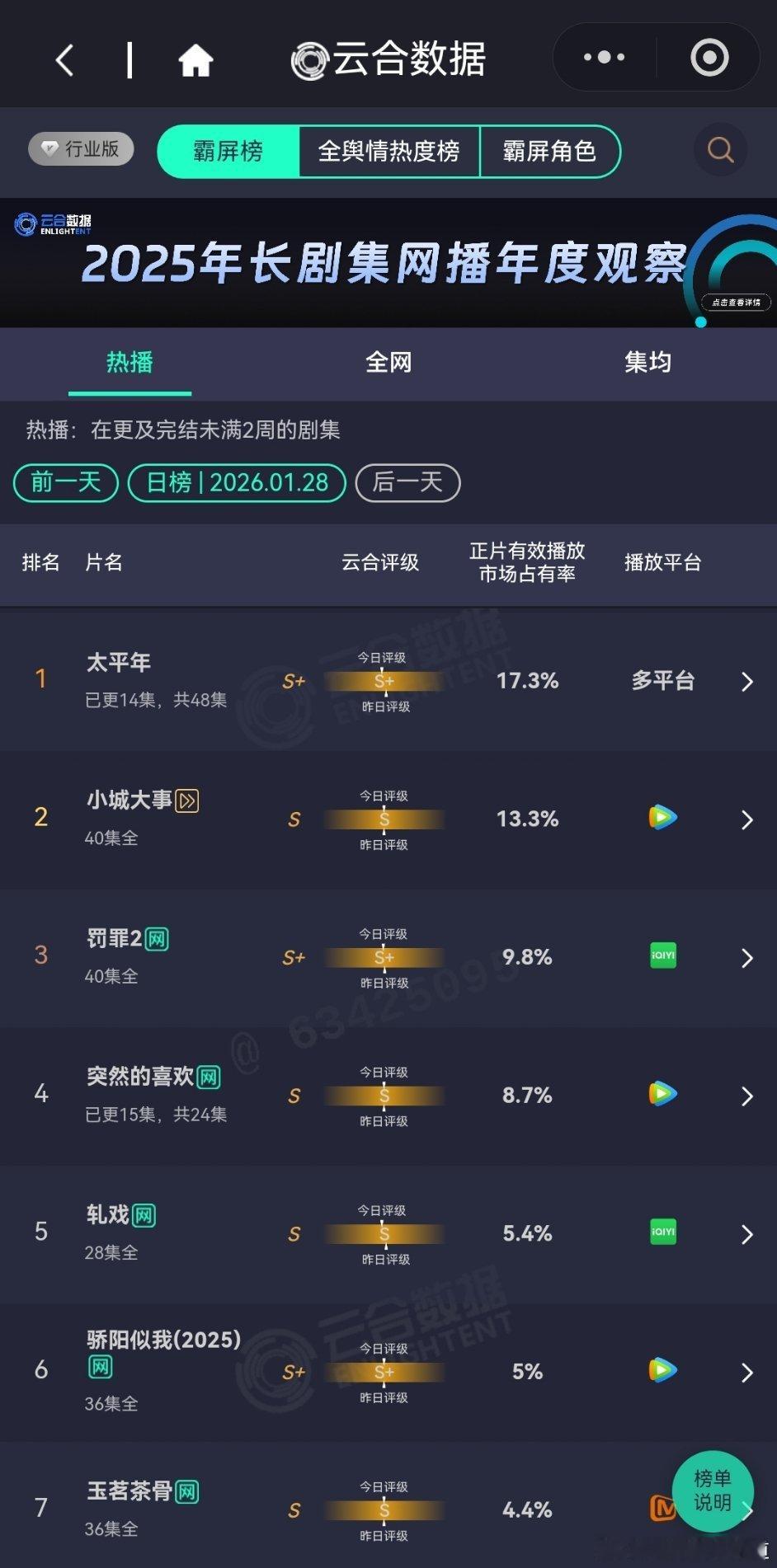 2026年1月28日云合播放占比云合 太平年17.3%新高了,但是评级降了一点小城大事13.3%有罪之身2.7%首播四集,空降这个数据还可以吧。