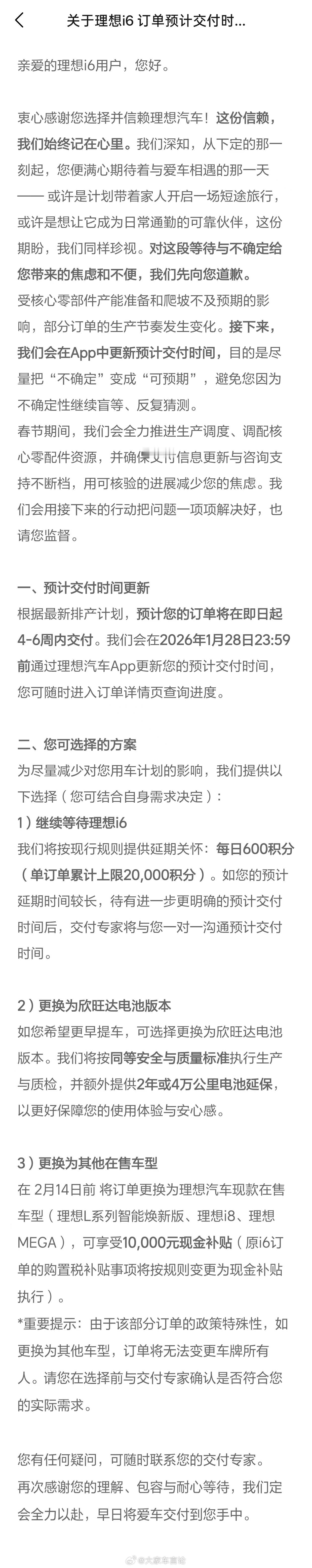 理想i6交付再次延期(受核心零部件产能爬坡影响),但提供了三种补偿方案:~ 继续等理想i6,每日600积分(订单累计上限20000积分)。~ 更换为欣旺达电池版本,提供2年或4万公里电池延保。~ 在2月14日前更换为理想L系列、i8或MEGA车型,可享受10000元现金补贴。如果是你,会选择继续等,还是换其他呢?理想i6