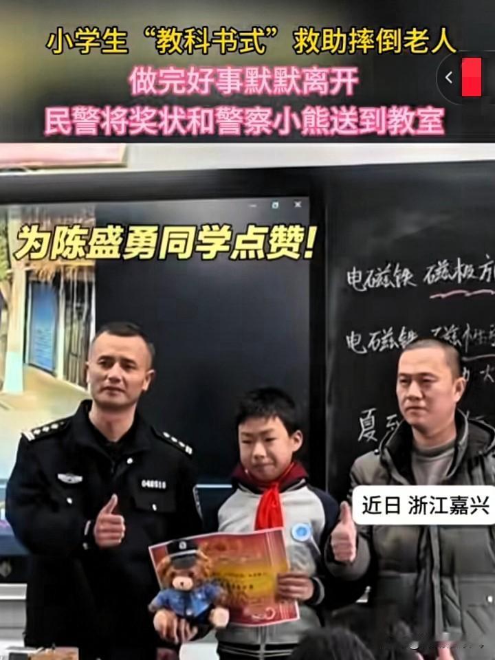 浙江嘉兴的小学生陈盛勇,上学路上悄悄做下一件了不起的事情,竟然引来警察一路追到学校。 警察不但给他送来一张奖状,还把他心心念念的警察小熊也带来了,喜的他嘴都合不拢了。 而网友们更是连连夸赞:这个小孩有出息,遇事沉稳,为人善良,最主要的是脑袋瓜子灵活,能够学以致用。 事情是这么一回事,那天早上陈同学像往常一样,背着书包、手揣在衣兜里,独自一人去上学。 陈同学走路有个习惯,他喜欢东瞧瞧西看看,留意着身边的人和事。 在走到离学校不远的那个马路丫子转弯处,揪心的一幕发生了。 他看到马路对面,有一个穿着红色衣服、瘦小的老奶奶,颤颤巍巍的去扶路边的一棵观景树。 老奶奶手伸出去那一下子,树没扶稳,而自个的身子却一个趔趄,人就栽倒在地上,没了动静。 陈同学心里又是着急,又有点小紧张。他快步从马路这边走过去,想看一看老奶奶到底咋样了? 可让人迷惑的是,走到老奶奶摔倒的地方,他只是站着看了一眼,然后就一声不响的转身离开了。 从视频里可以看到,陈同学一边快速的离开,一边又不时地扭着脖子往后面张望,他的视线好像一直都在那个倒地的老奶奶身上。 过了一会儿,视频里又出现了几个警察奔走的身影,警察的身后还跟着小尾巴陈同学。 这个时候大家才知道,原来陈同学,从老奶奶那里离开,他并不是不管老奶奶了,而是去叫帮手来帮助老奶奶。 两个警察一左一右小心翼翼地把老奶奶从地上扶起来。 陈同学站在一旁,亲眼确认老人得到妥善救助后,才放下心来。 他默默转身,按时赶往学校,没有留下姓名,也没有索要夸赞。 事后,民警通过多方寻找,终于找到了陈同学所在的学校。 为了表扬他乐于助人的精神,民警特意来到学校,为他送上奖状和警察小熊玩偶。 有记者采访陈同学,问他当时为什么不自己扶起老人,而是选择跑去找警察。 陈同学认真地回答:“老奶奶摔倒后,我走到她面前看了一下。 奶奶看着很瘦,可冬天天气冷,穿的衣服又厚又重,我觉得凭自己的力气,根本没办法把奶奶扶起来。” “这时候我突然想起老师在课堂上反复叮嘱的话,遇到自己解决不了的问题,一定要找警察叔叔帮忙。 刚好距离老奶奶摔倒的地方不远处,就有派出所,我就立刻跑过去求助了。” 据了解,陈同学的学校平日里,也常开展应急安全教育课。 教导孩子们量力而行,遇到危险和困难,科学寻求帮助。 孩子的这番回答,也让大家读懂了他冷静行为背后的原因。 对于陈同学帮助老奶奶这件事,我觉得他在以下3个方面做的非常好。 老奶奶摔倒后,在别人都不上前的情况下,陈盛勇同学没有丝毫犹豫,第一时间跑到老人身边查看情况。 他的这份不假思索的善意,说明他是一个善良有爱心的好孩子,他没有做一个事不关己高高挂起的冷漠之人。 面对老奶奶摔倒的突发意外,他没有莽撞施救,而是结合自身情况,迅速做出理智判断:自己力气不够,立刻去找民警求助。 当他带着民警赶回现场后,他没有像完成任务一样立刻离开,而是亲眼确认老人平安后,才默默转身离去。 他人虽小,但做事有始有终,不图名利、不贪夸赞,也充分显露了少年的责任与担当。 陈同学做的这件事,看似很普通,却在寒冬里温暖了很多人。 不少成年人面对类似场景,都会因为各种顾虑,常常陷入纠结,甚至选择回避。 可是陈同学,却用最稳妥、最理性的方式,给出了最好的答案。 他没有盲目冲动,也不冷漠旁观。 课堂上学到的安全知识、师长的谆谆教诲,没有变成纸上的文字,也没有一听而过,而是化作了他在遭遇意外事情时的行动准则。 这正是教育最动人的模样,也是学以致用最好的证明。 所以说,学习知识的意义,从不在于试卷上的分数是高还是低。 而是在关键时刻,是否能够以所学为凭借,既保护得了自己,又能伸出援手帮助别人。 这种双赢的智慧与勇气,才是真正的知识。 少年自有少年智,学以致用方为真;心怀善意有分寸,便是人间好少年,你们说是不是? 素材来源网络侵删 好人好事