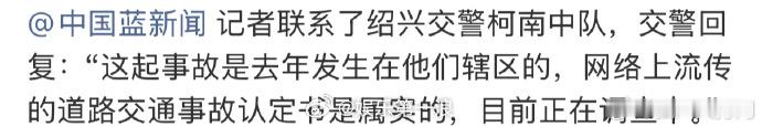 交警称道路交通事故认定书属实 记者采访当地交警,称:“这起事故是去年发生在他们辖区的,网络上流传的道路交通事故认定书是属实的,目前正在调查中。”