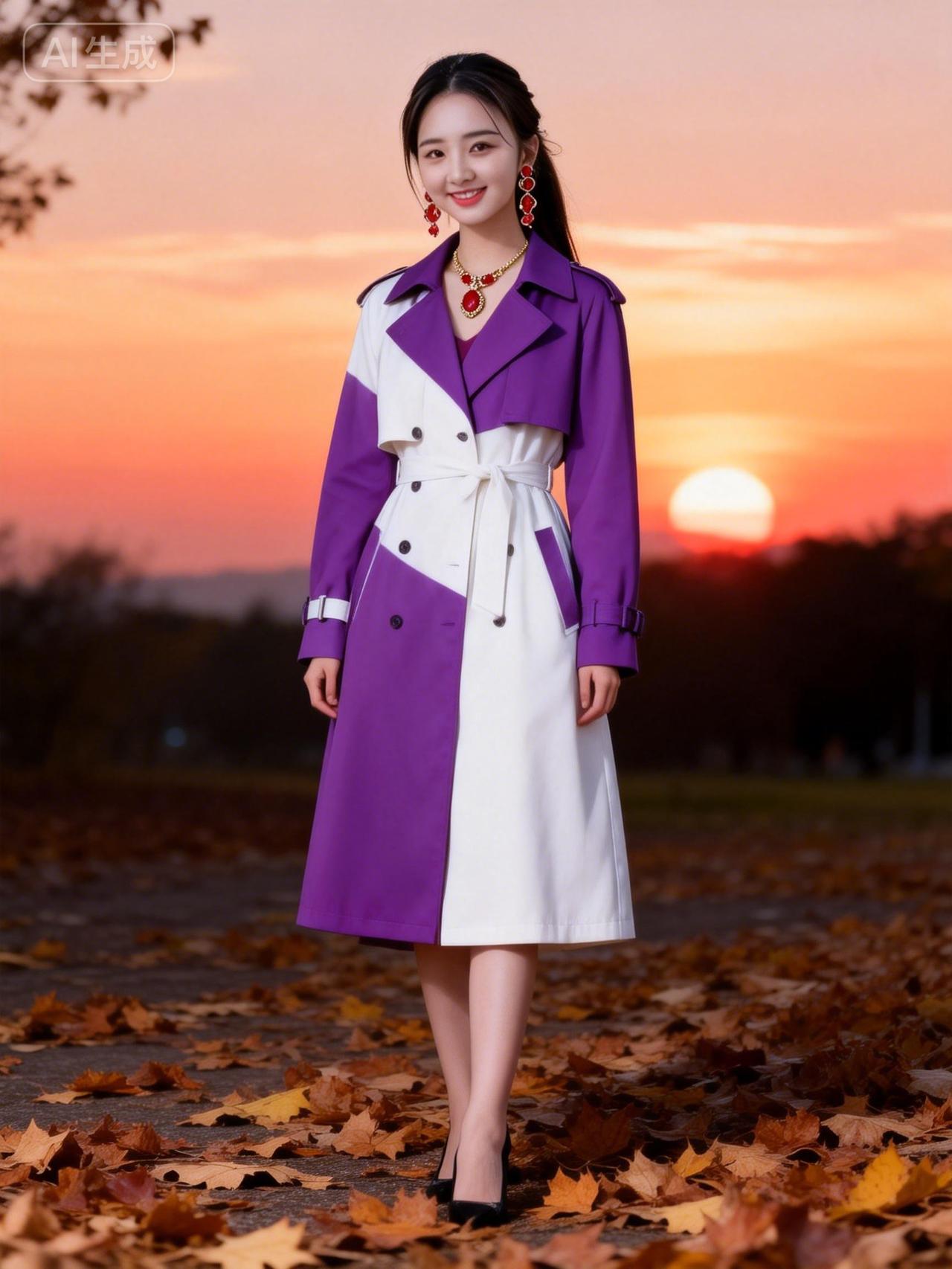 秋日穿搭指南:紫色与白色拼接风衣,搭配红色耳环,尽显时尚与优雅。
