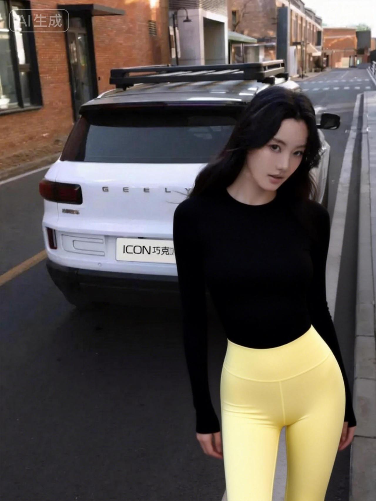 都市街头穿搭指南:黑色上衣+亮黄色紧身裤,时尚又显身材!