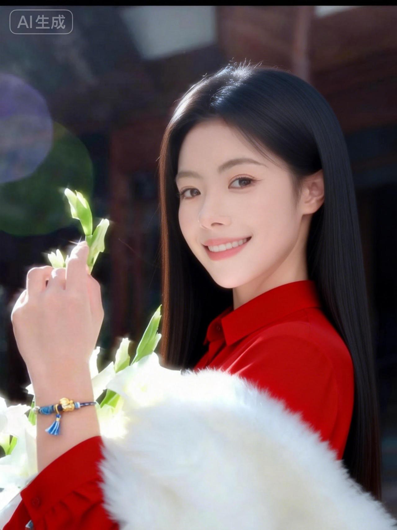 红衣美人笑,花枝拂面来。