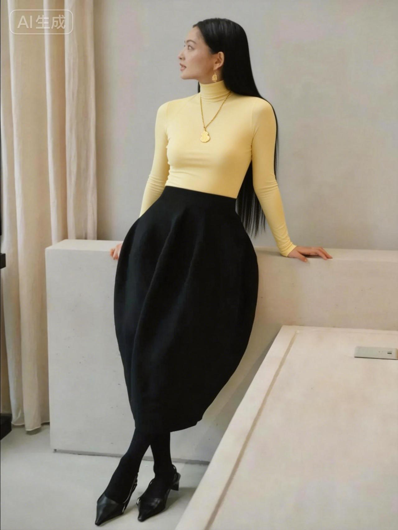 优雅黑裙搭配亮黄色高领衫,尽显时尚气质!