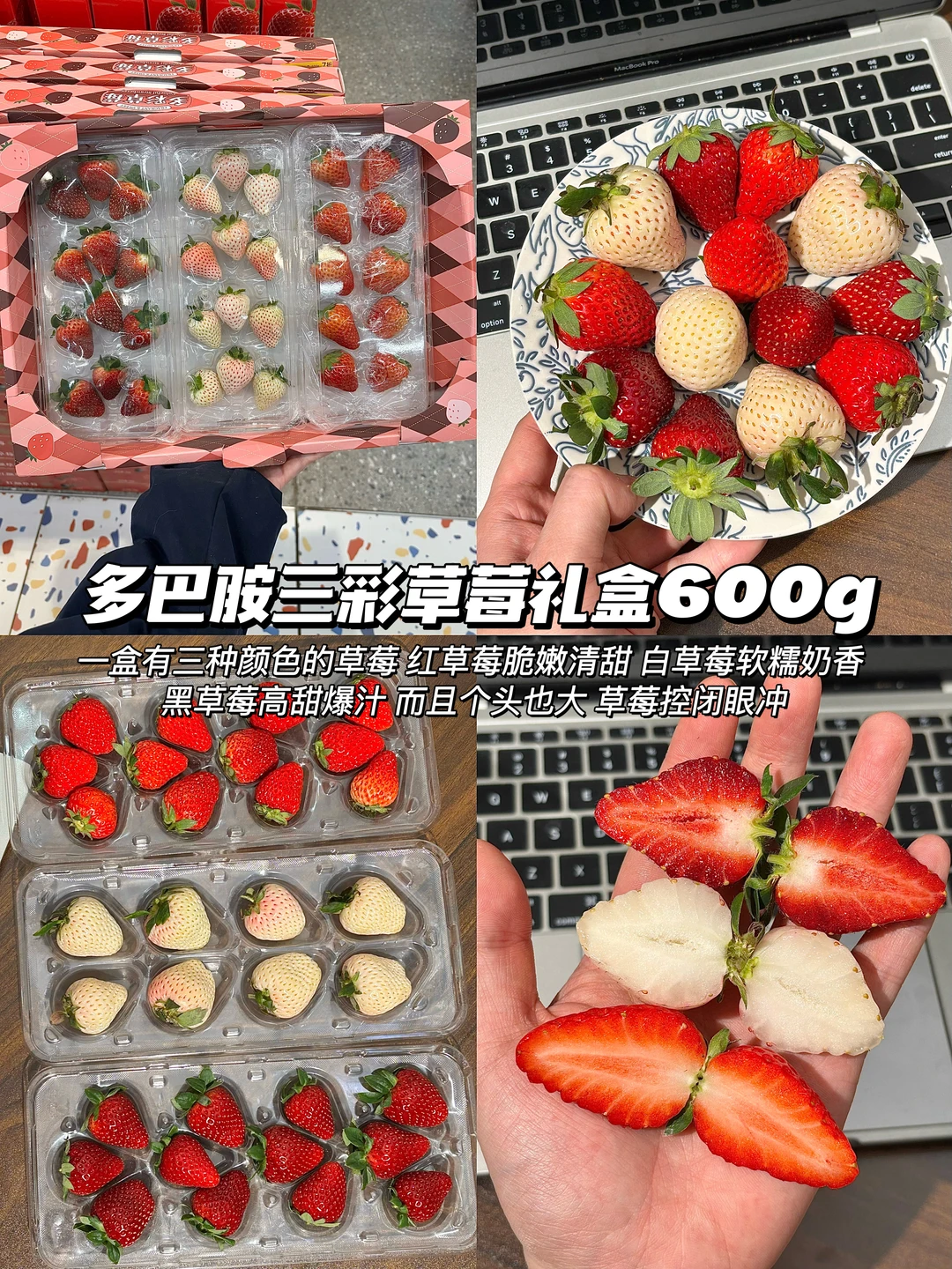 一盒有三种颜色的草莓 红草莓脆嫩清甜 白草莓软糯奶香 黑草莓高甜爆汁 而且个头也大 草莓控闭眼冲