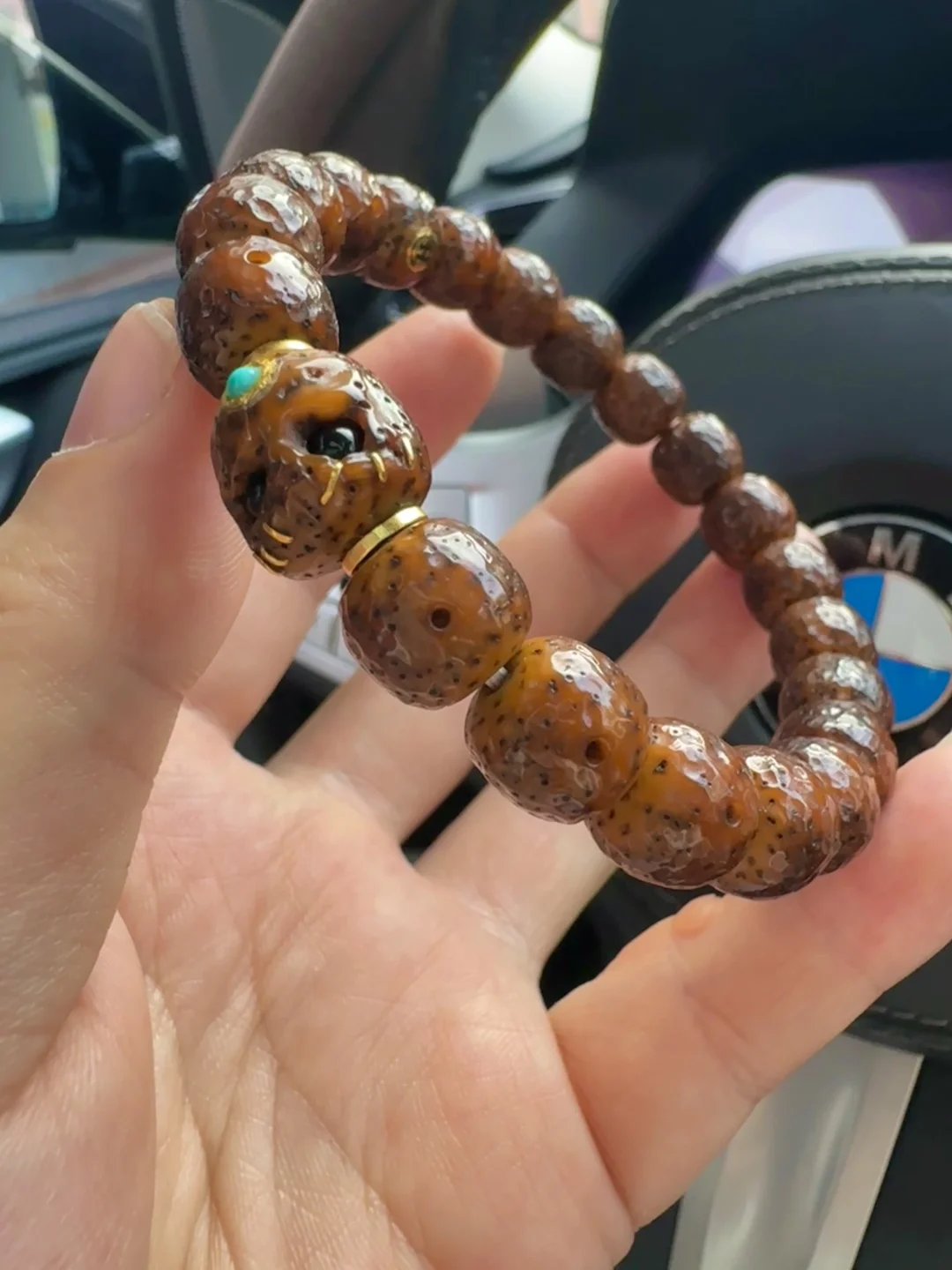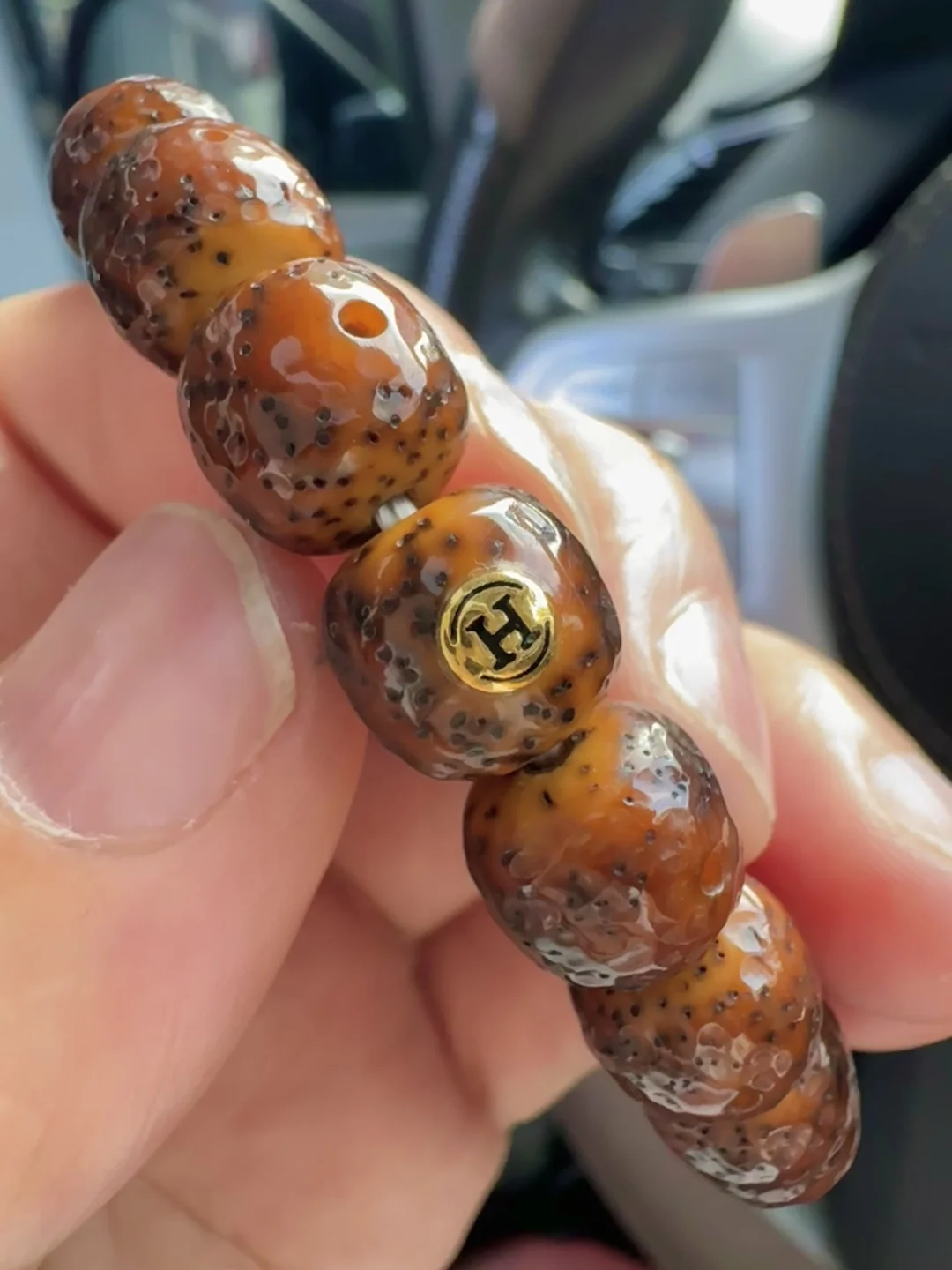 照片这条串盘玩好多年了,连阿呆都玉化了,第一条星月就是他,刚开始不懂盘玩,有些浸汗了!这条星点挺粗,就是比较稀疏那种!