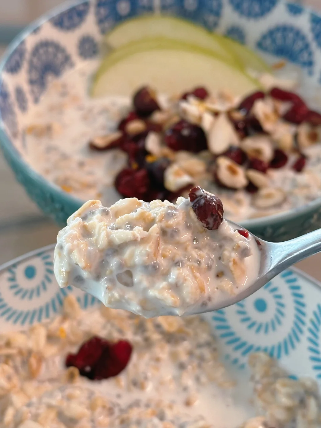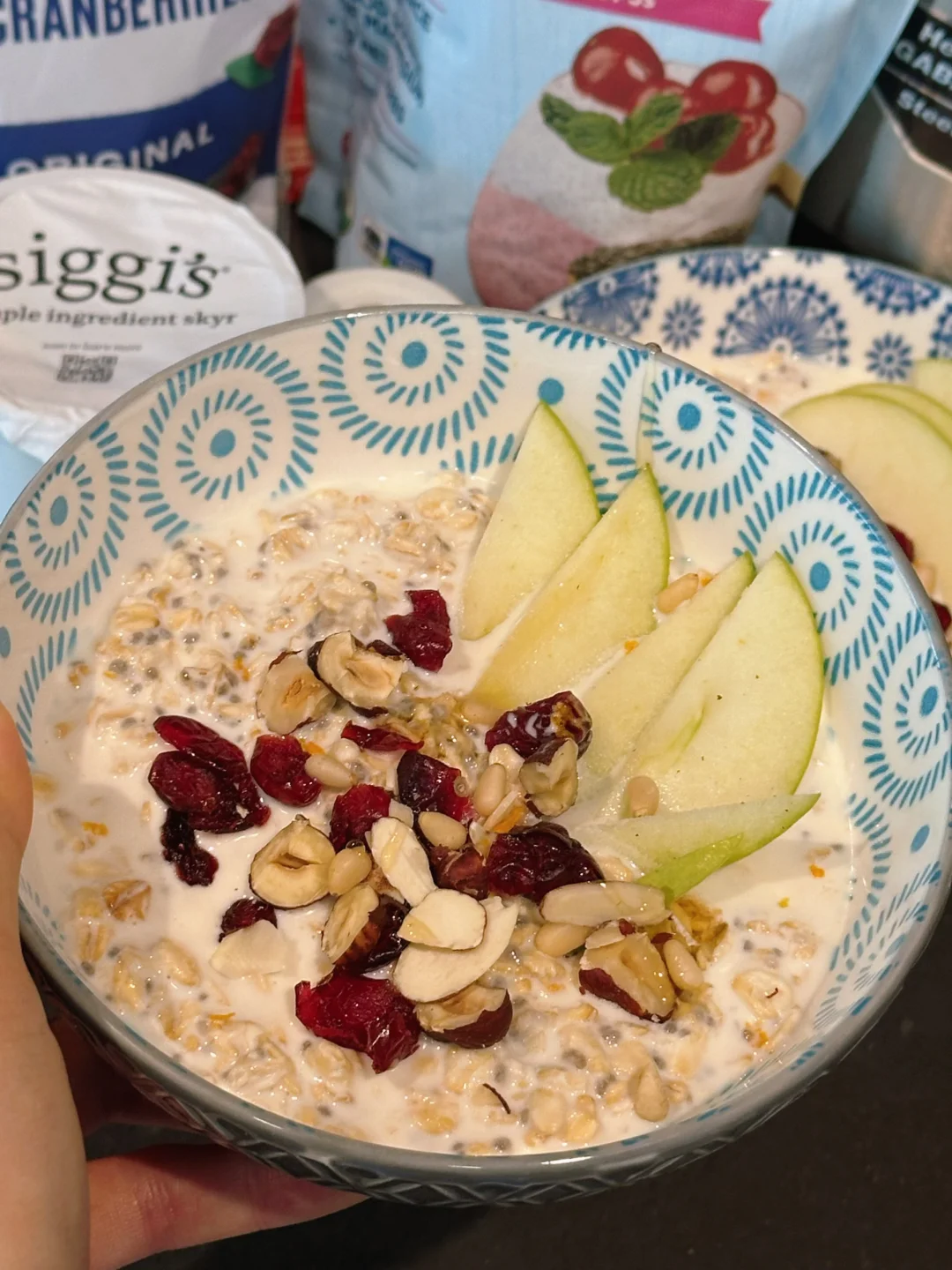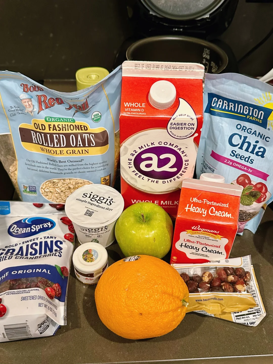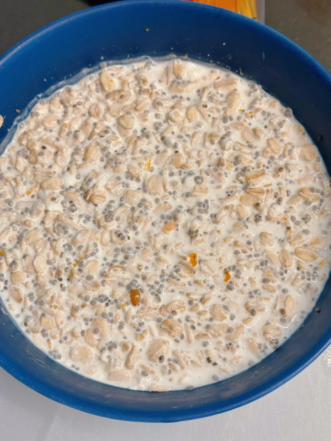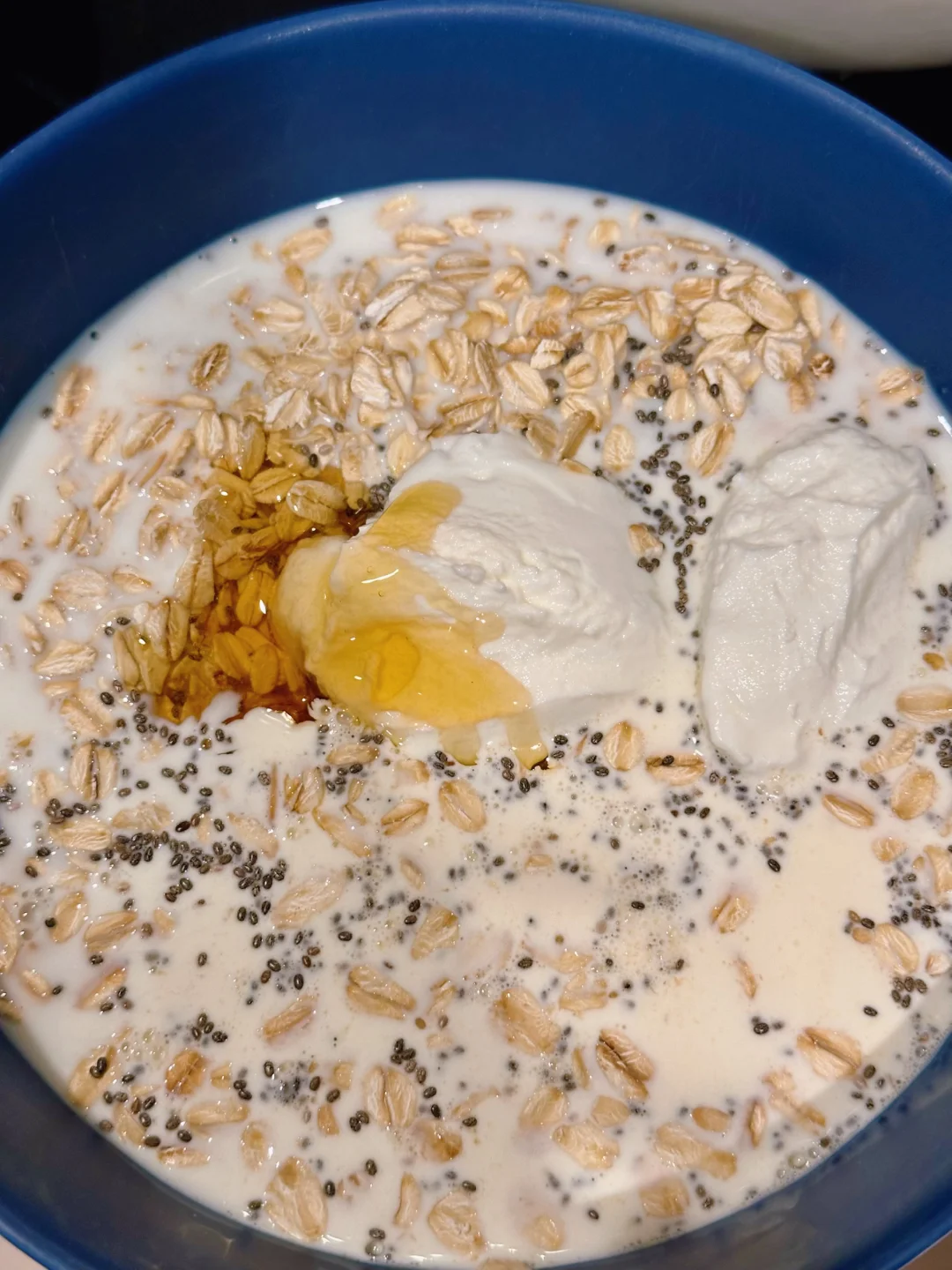 隔天准备:燕麦100g(用rolled oats,泡了刚好软糯有嚼劲,quick oat太软了),全脂牛奶250g,全脂无糖希腊酸奶50g,奶油20g(前面用了全脂奶,奶油可以不放),蜂蜜20g,奇亚籽20g,橙皮屑。