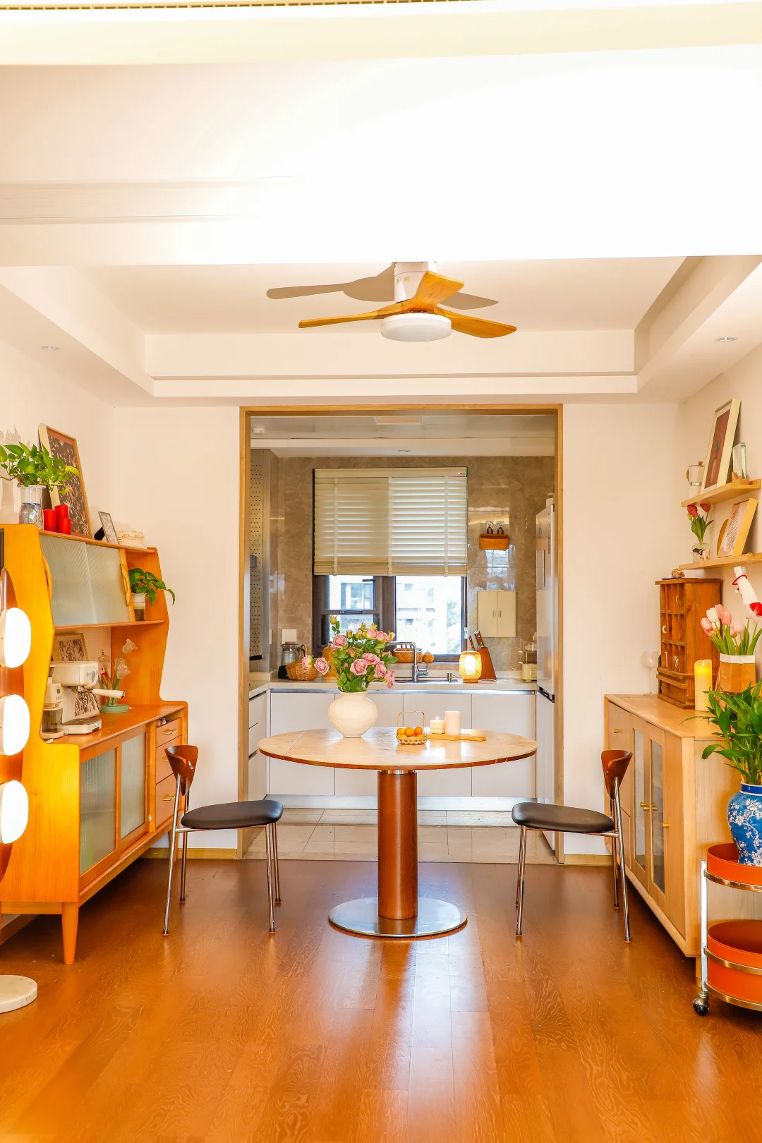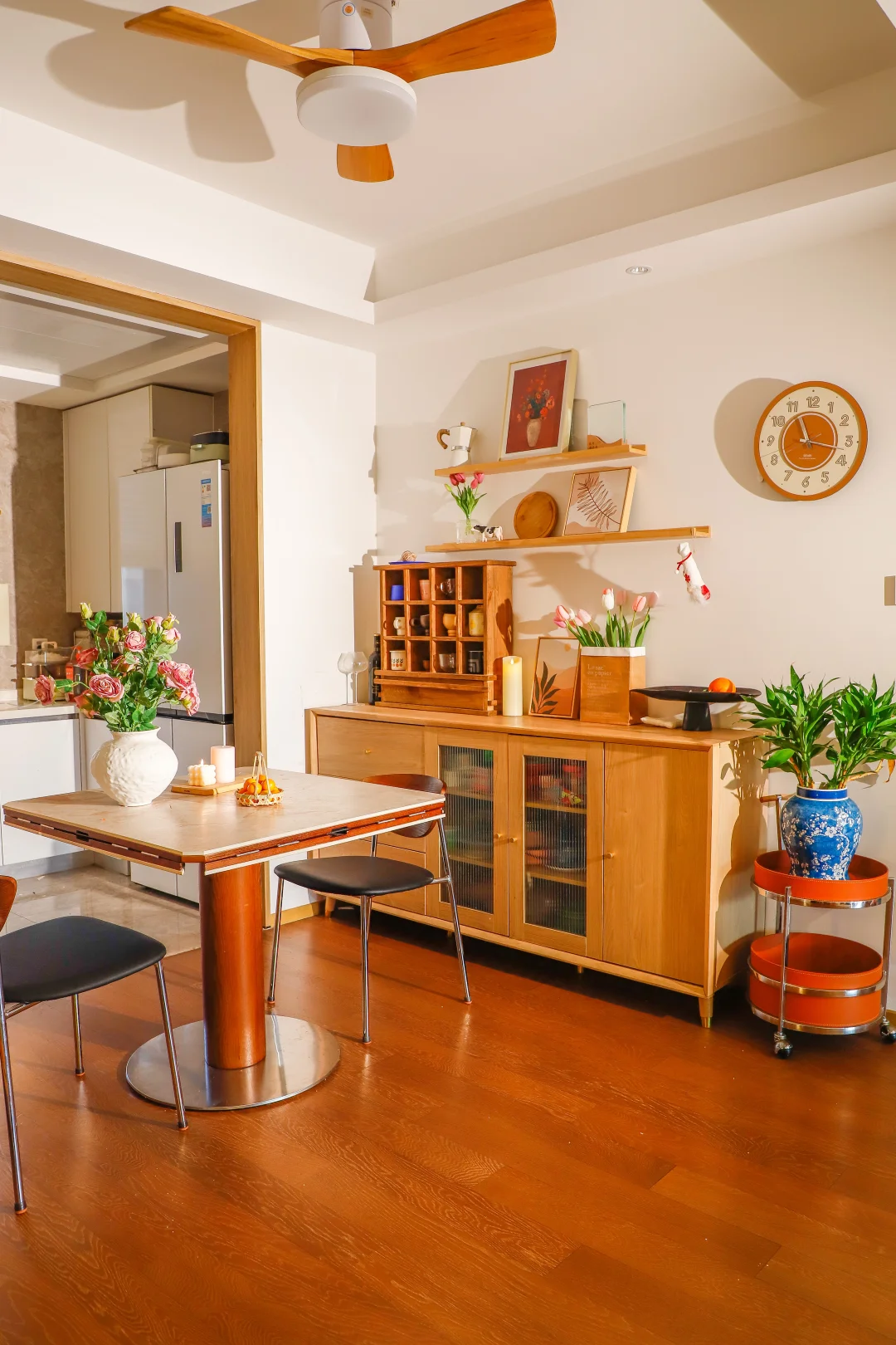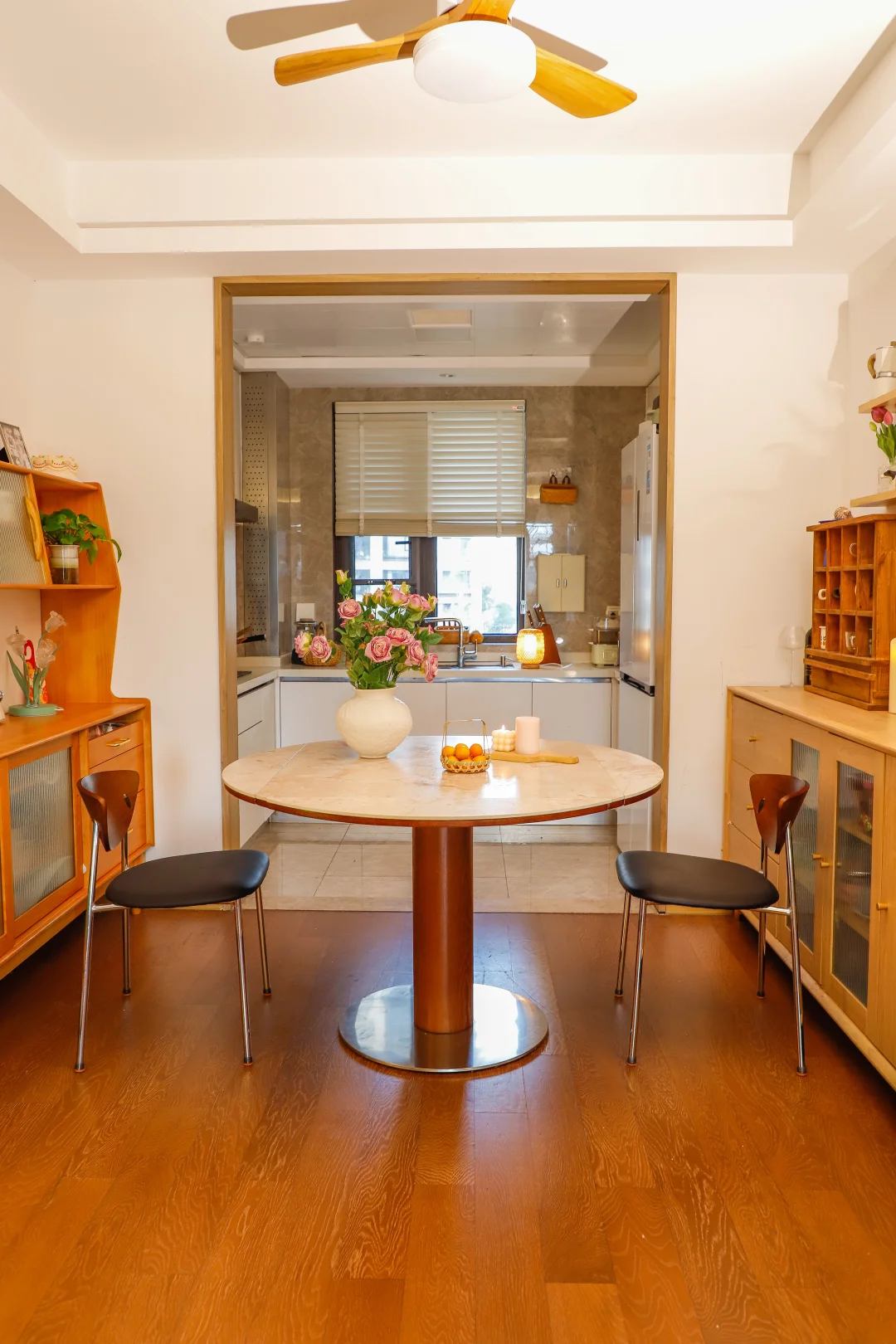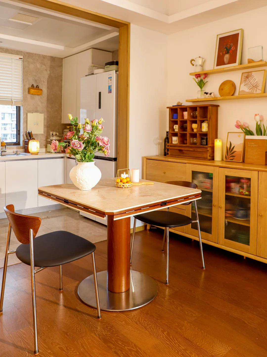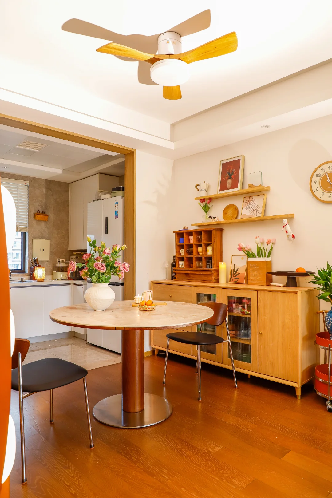 我家是餐厨开放式的设计,顶部用了原木风的电扇灯,地上是原木的地板,浅原木纹理温润治愈,两边橱柜,清爽又能装🥰 原木餐桌稳稳立在中央,可以收成四方桌,打开就是大圆桌了,家庭聚餐时,10个人吃饭不成问题,桌上摆着简约陶瓷花瓶颜值很在线,氛围感拉满✨✨✨ 绿植🌳角落点缀,每一次吃饭,都是与自然的温柔相拥~