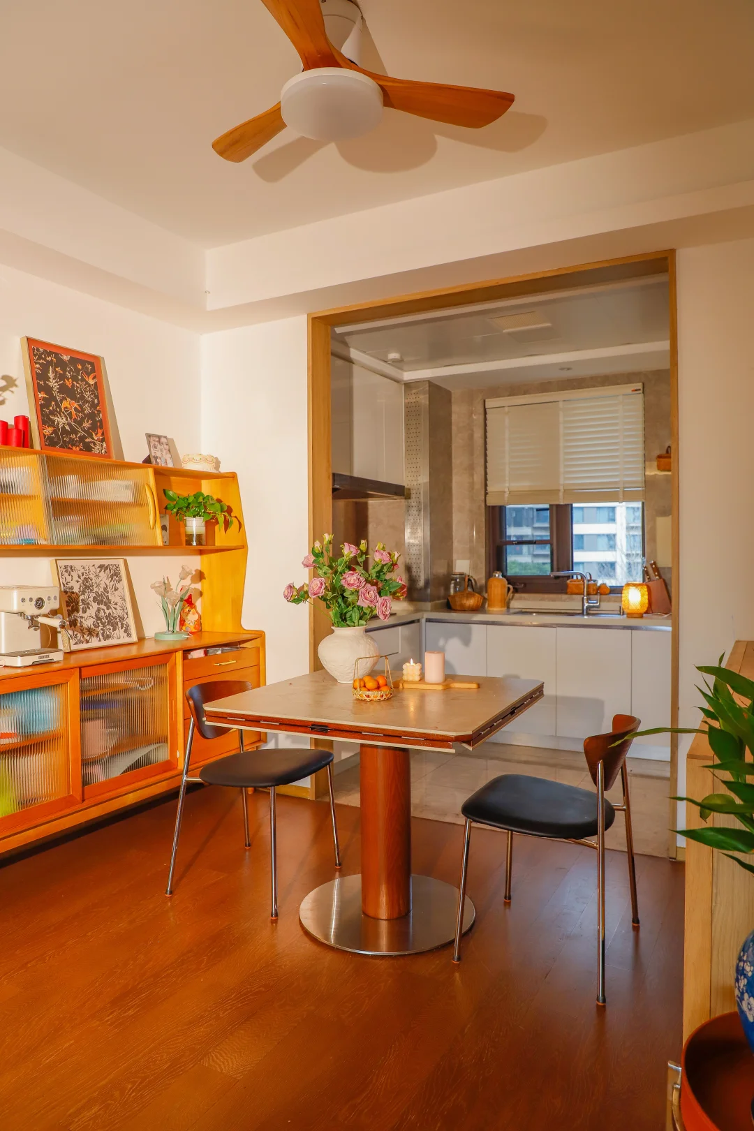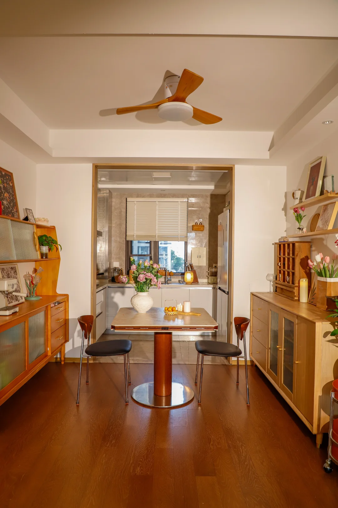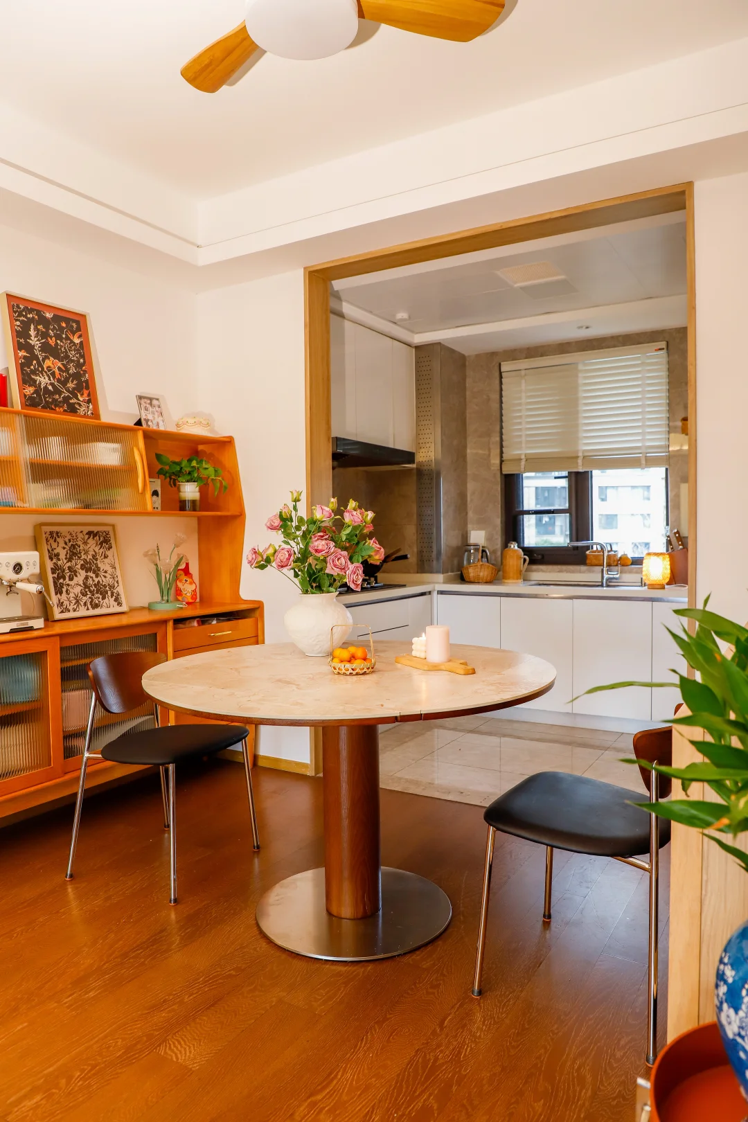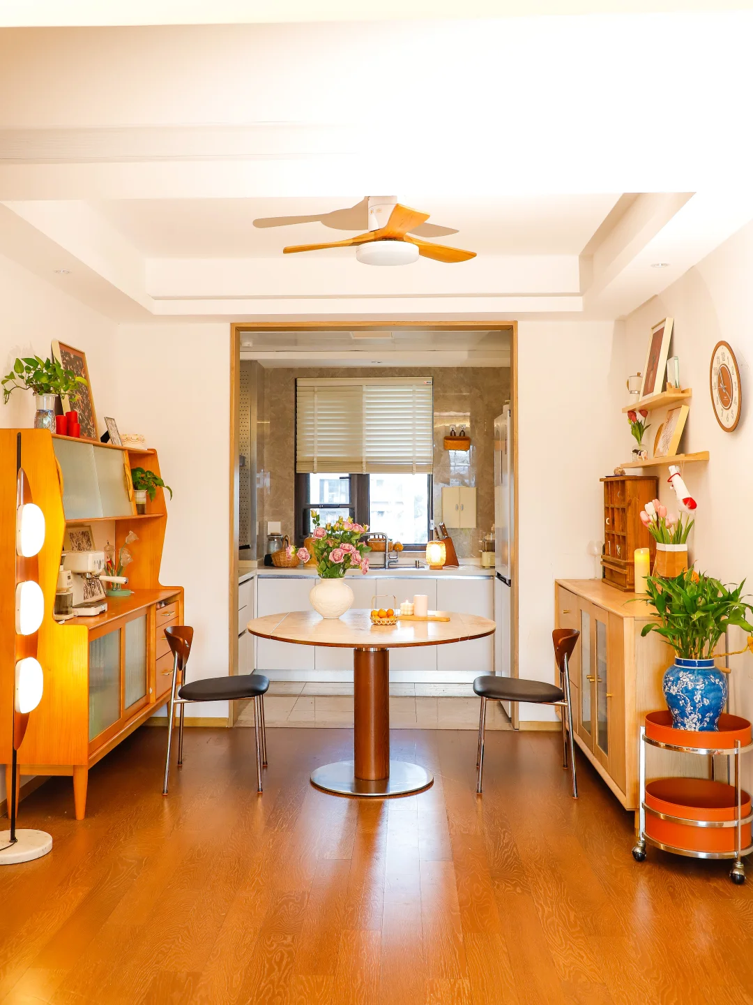 我家是餐厨开放式的设计,顶部用了原木风的电扇灯,地上是原木的地板,浅原木纹理温润治愈,两边橱柜,清爽又能装🥰 原木餐桌稳稳立在中央,可以收成四方桌,打开就是大圆桌了,家庭聚餐时,10个人吃饭不成问题,桌上摆着简约陶瓷花瓶颜值很在线,氛围感拉满✨✨✨ 绿植🌳角落点缀,每一次吃饭,都是与自然的温柔相拥~