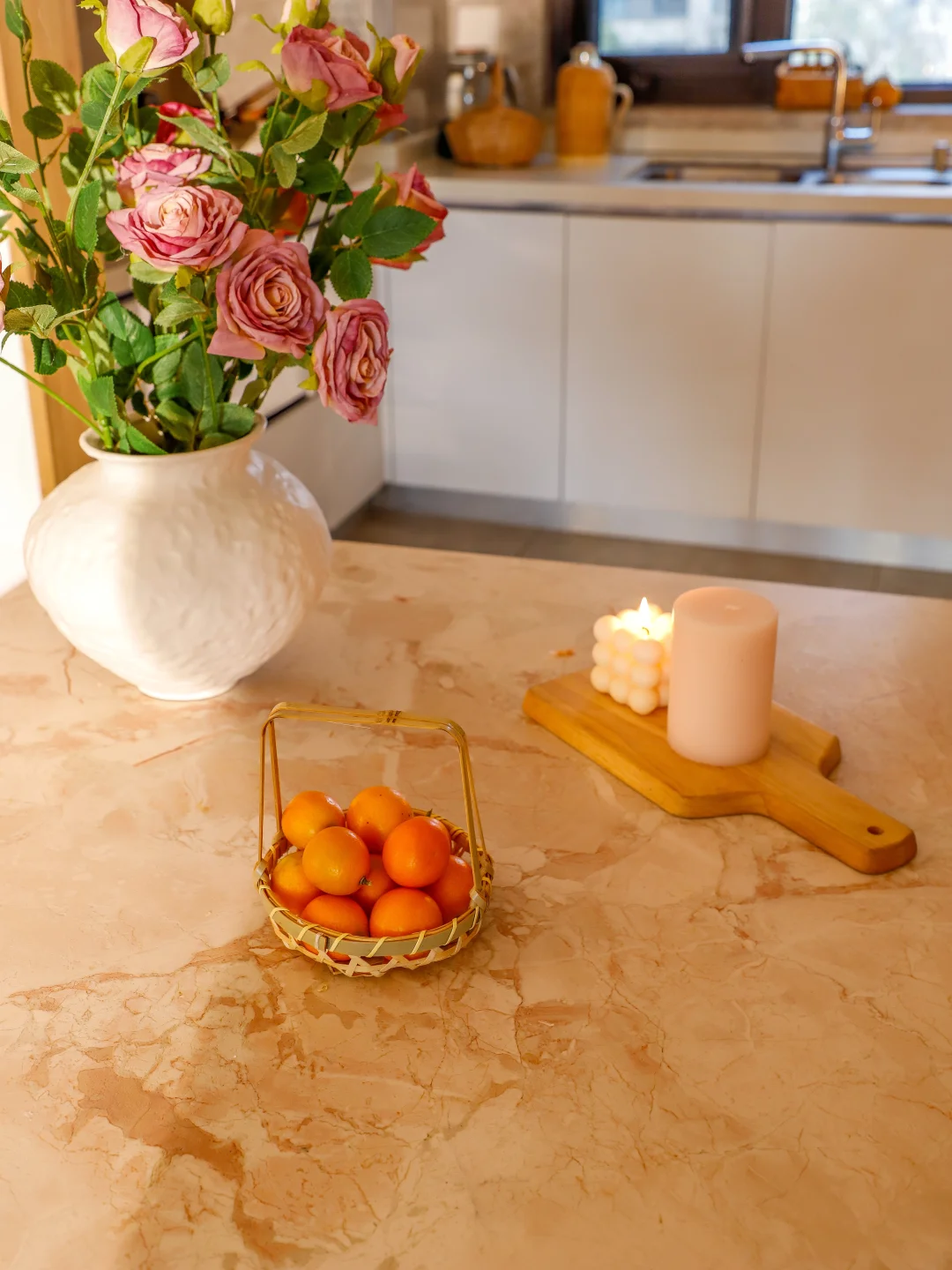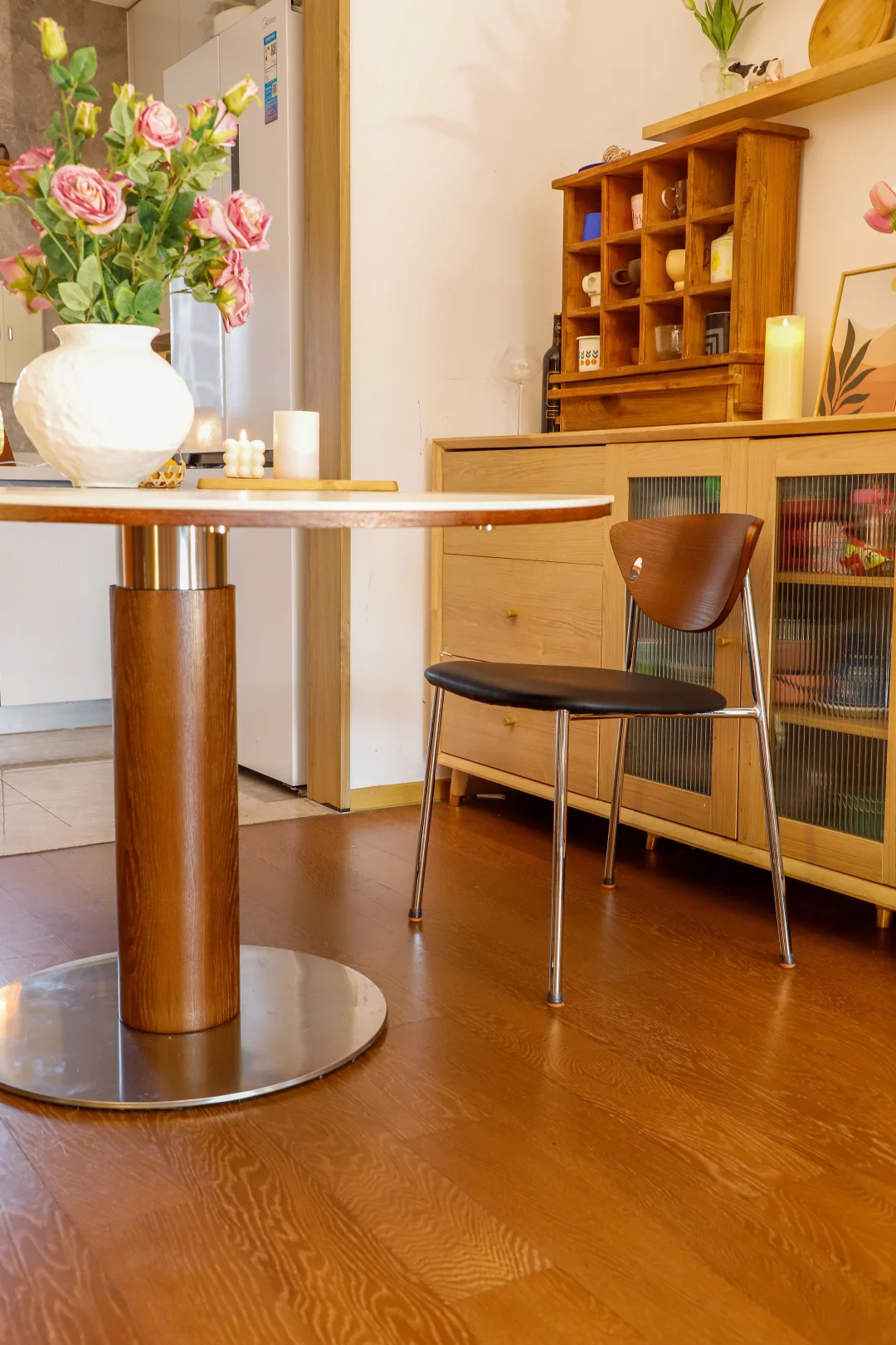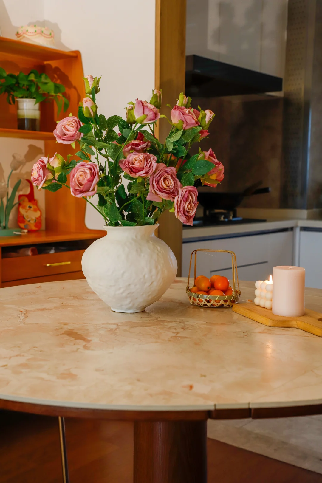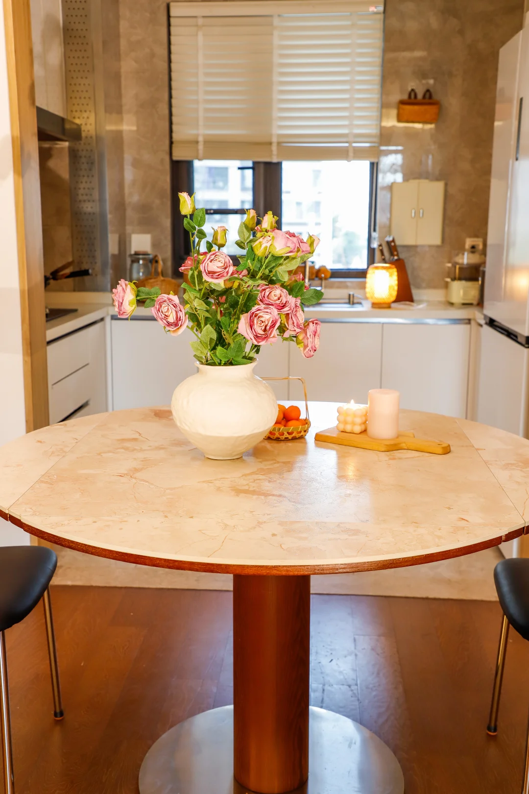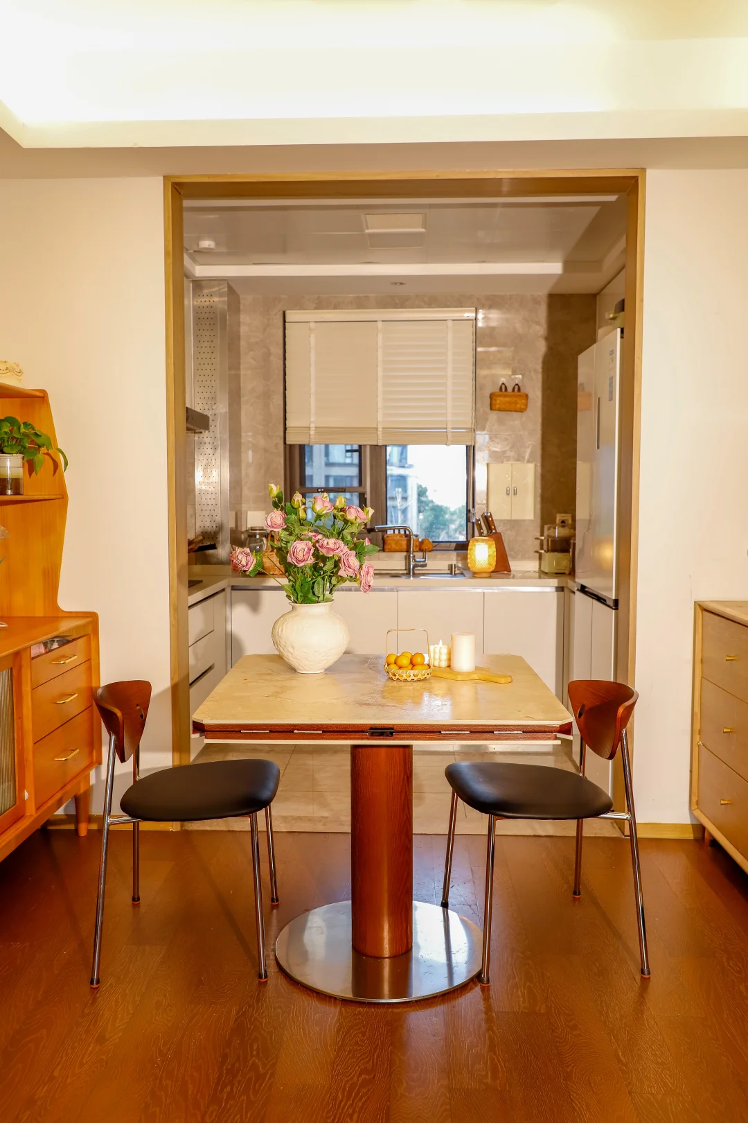 我家是餐厨开放式的设计,顶部用了原木风的电扇灯,地上是原木的地板,浅原木纹理温润治愈,两边橱柜,清爽又能装🥰 原木餐桌稳稳立在中央,可以收成四方桌,打开就是大圆桌了,家庭聚餐时,10个人吃饭不成问题,桌上摆着简约陶瓷花瓶颜值很在线,氛围感拉满✨✨✨ 绿植🌳角落点缀,每一次吃饭,都是与自然的温柔相拥~