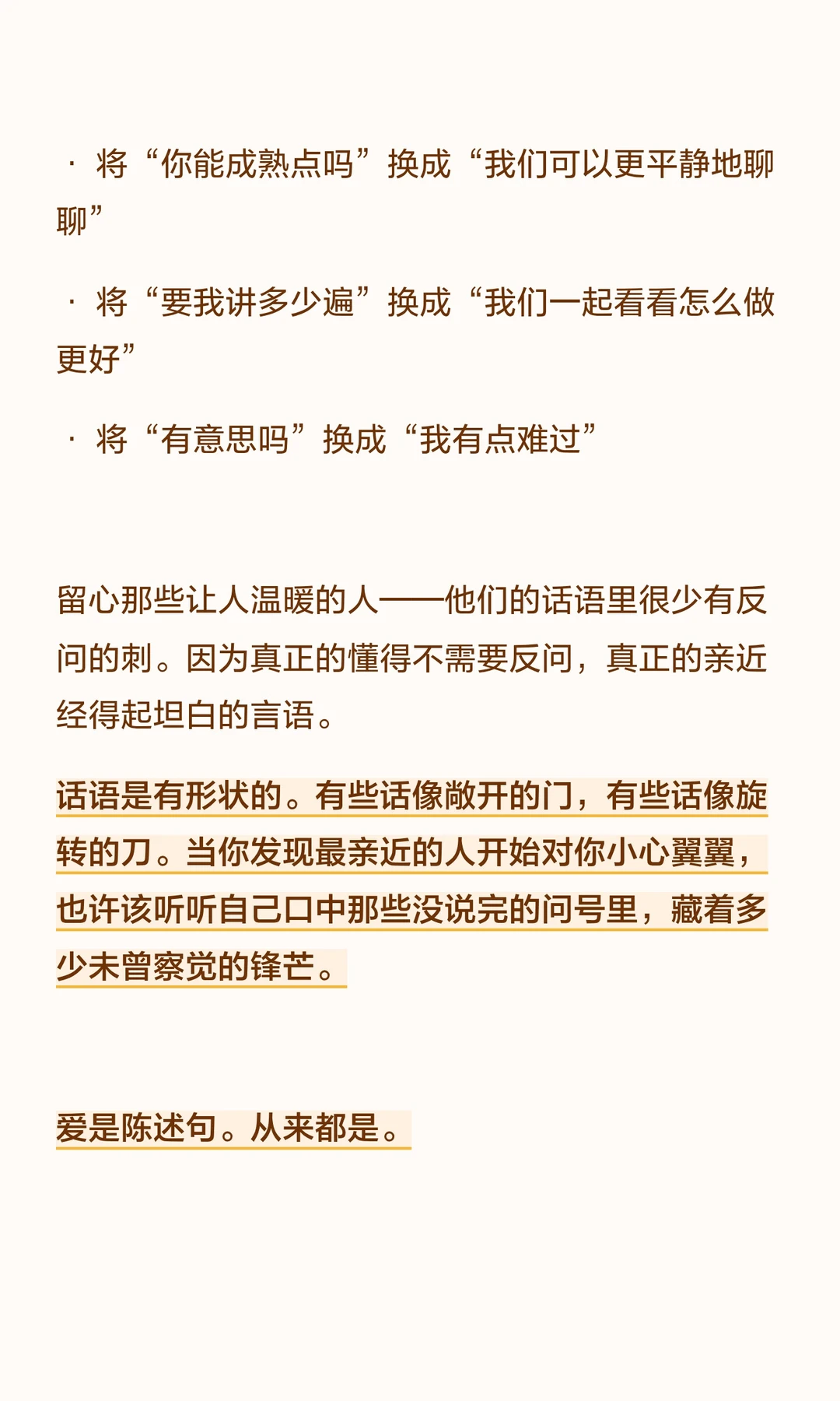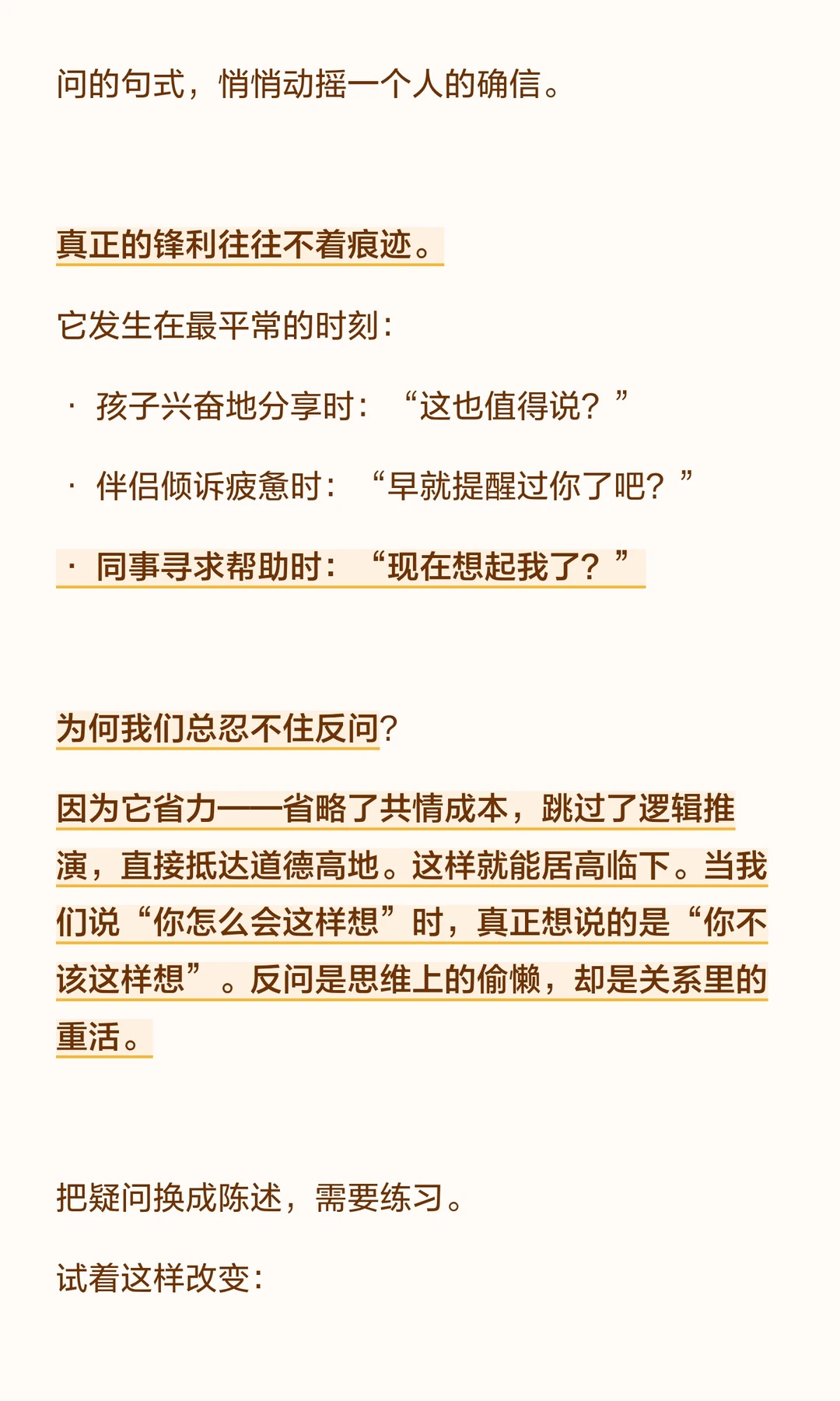 “你怎么这都不懂?” “难道又是我的错?” 有些话天生带着细小的刺。它们看似在问,实际却像一把把小刀——每当你试图靠近,就被看不见的锋刃轻轻划伤。在亲密的关系里,这种伤口最难愈合。 反问从不寻求答案,它终结对话。 开口的瞬间,判断已经落下:你错了,而你不该错。那个上扬的尾音里藏着双重否定——既否定对方的理解,也确认自己的正确。这像一种温和的操控:用疑问的句式,悄悄动摇一个人的确信。 真正的锋利往往不着痕迹。 它发生在最平常的时刻: · 孩子兴奋地分享时:“这也值得说?” · 伴侣倾诉疲惫时:“早就提醒过你了吧?” · 同事寻求帮助时:“现在想起我了?” 为何我们总忍不住反问? 因为它省力——省略了共情成本,跳过了逻辑推演,直接抵达道德高地。这样就能居高临下。当我们说“你怎么会这样想”时,真正想说的是“你不该这样想”。反问是思维上的偷懒,却是关系里的重活。 把疑问换成陈述,需要练习。 试着这样改变: · 将“你能成熟点吗”换成“我们可以更平静地聊聊” · 将“要我讲多少遍”换成“我们一起看看怎么做更好” · 将“有意思吗”换成“我有点难过” 留心那些让人温暖的人——他们的话语里很少有反问的刺。因为真正的懂得不需要反问,真正的亲近经得起坦白的言语。 话语是有形状的。有些话像敞开的门,有些话像旋转的刀。当你发现最亲近的人开始对你小心翼翼,也许该听听自己口中那些没说完的问号里,藏着多少未曾察觉的锋芒。 爱是陈述句。从来都是。