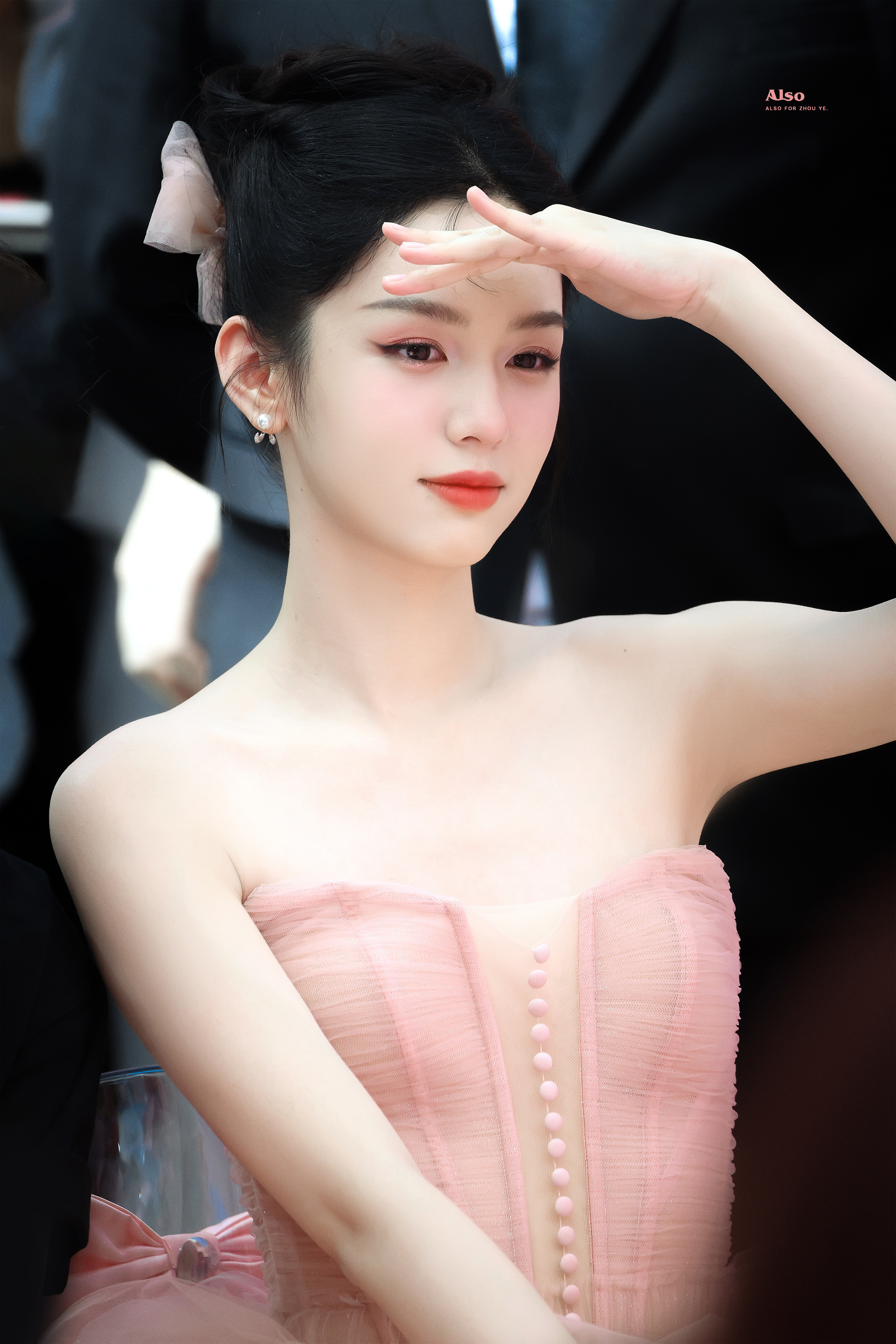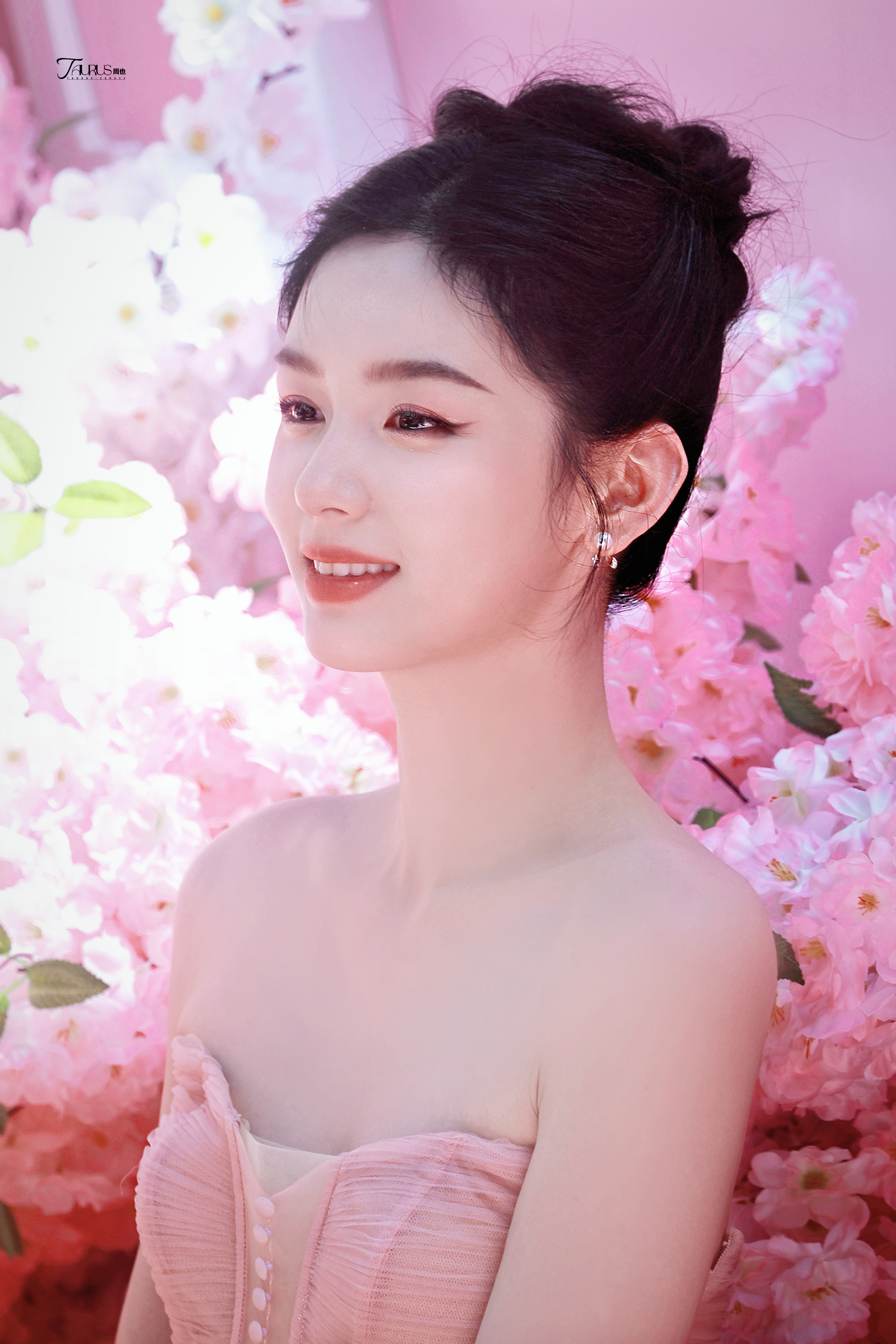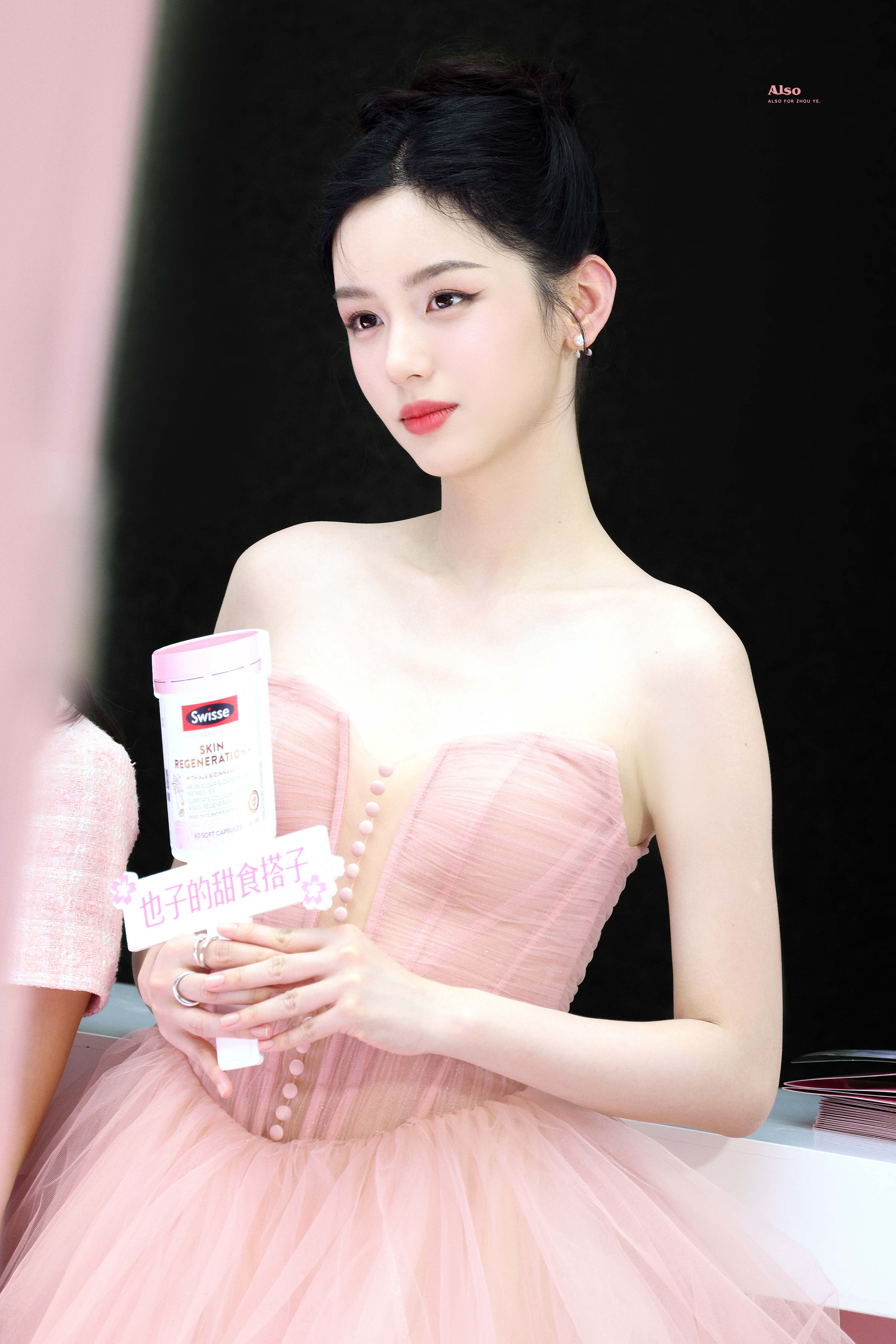 周也 粉色抹胸裙,肩颈线条如天鹅般优雅。