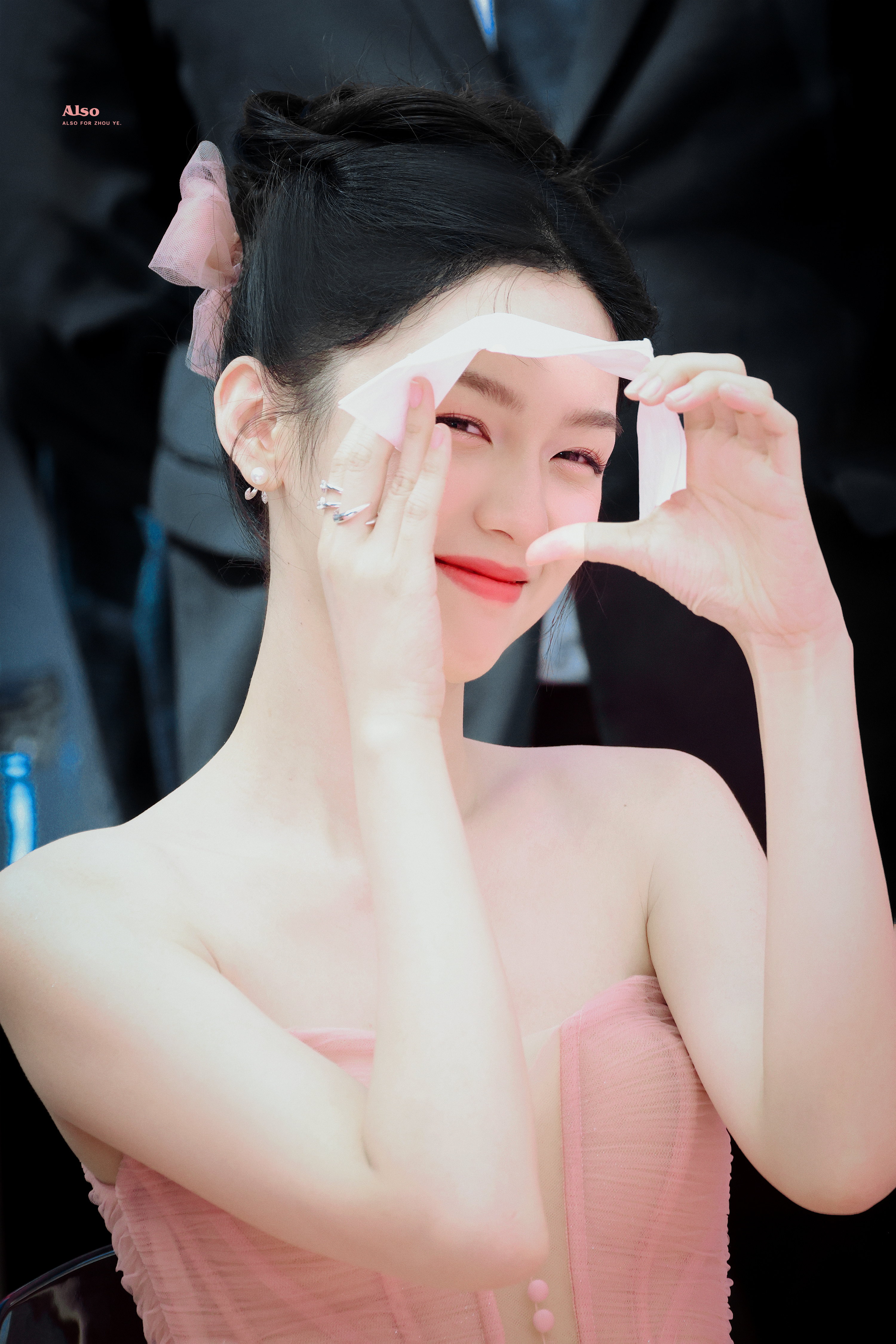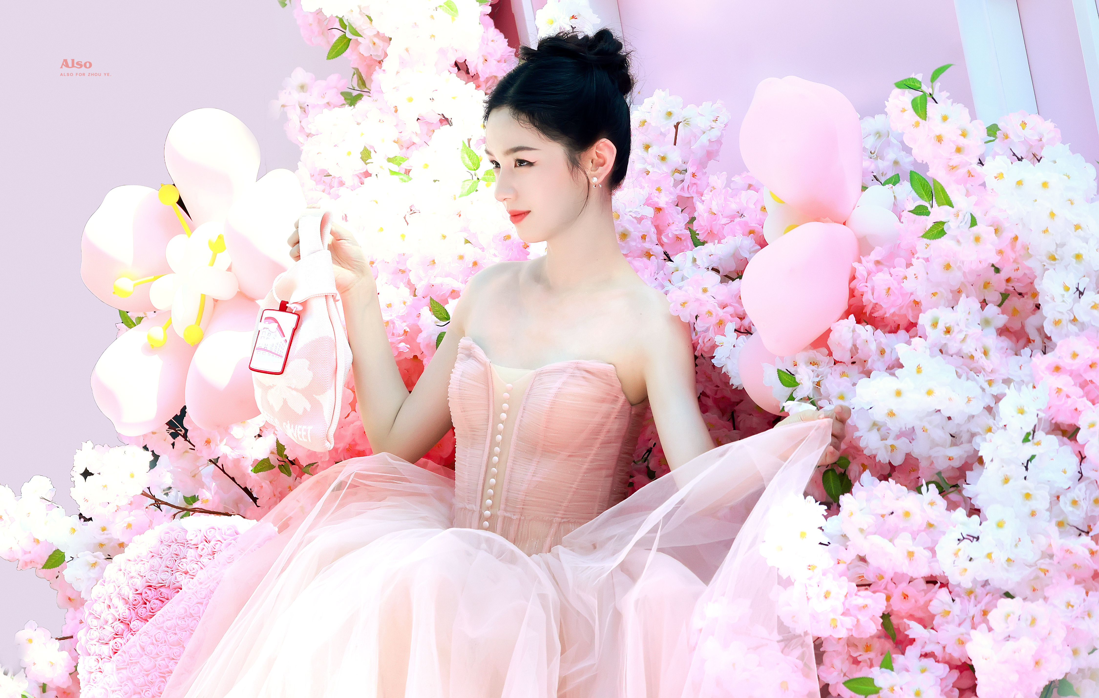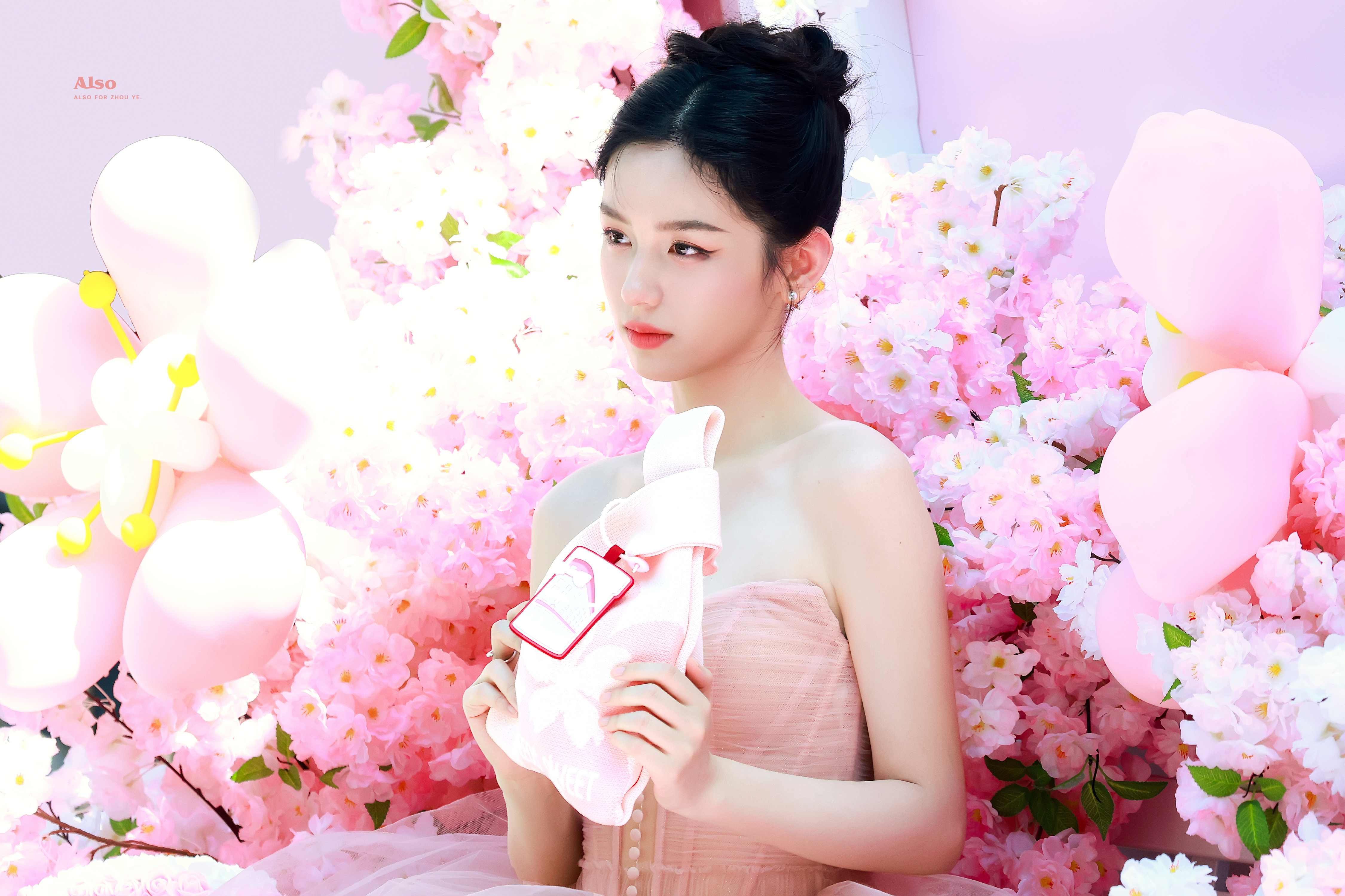 周也 粉色抹胸裙,肩颈线条如天鹅般优雅。