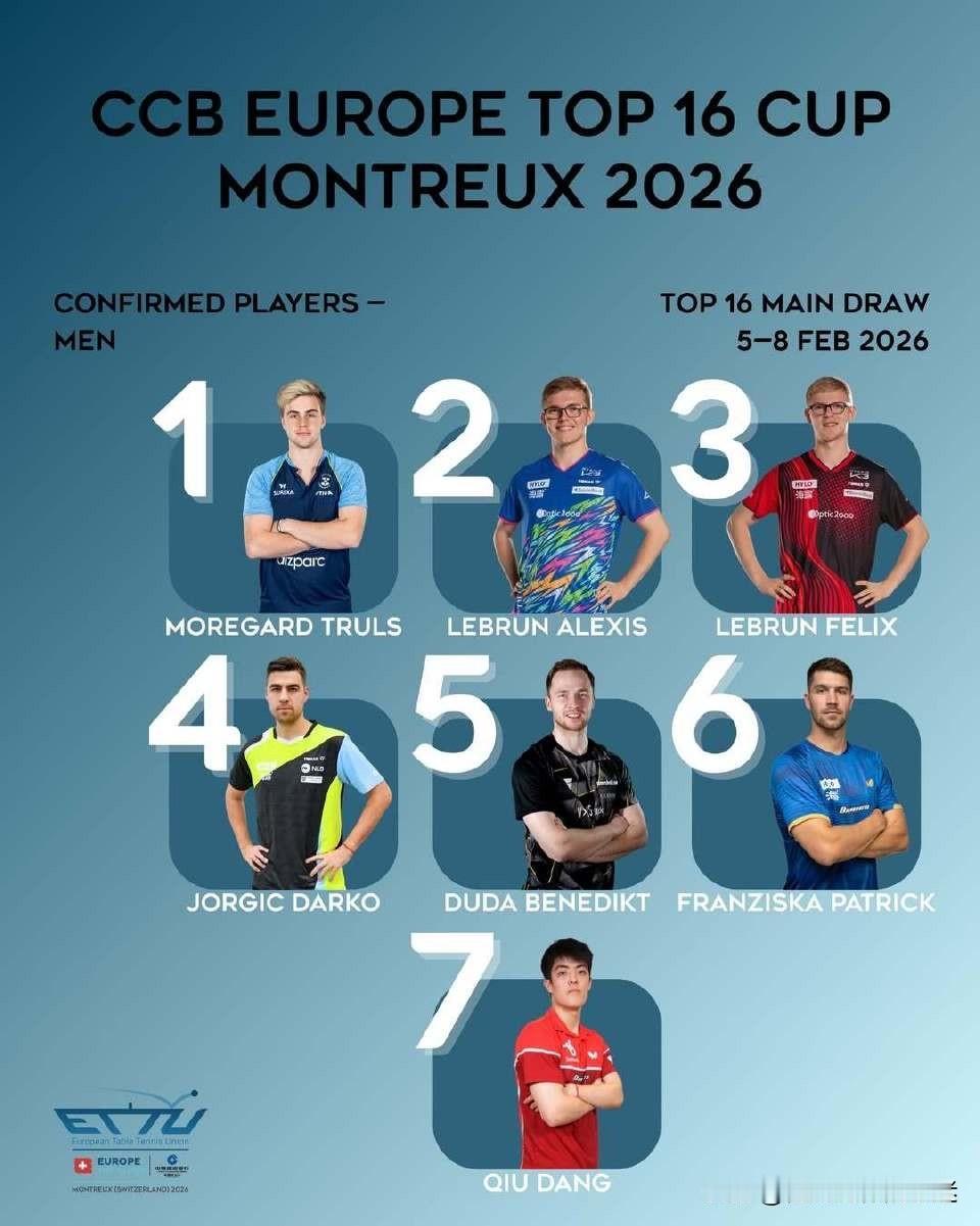 乒乓球欧洲16强赛:男单各国球员分布 1、瑞典🇸🇪2人参赛:莫雷加德(1号种子)、卡尔伯格 2、法国🇫🇷3人参赛:勒布伦兄弟、西蒙.高茨 3、德国🇩🇪4人参赛:杜达、弗朗西斯卡、奥恰洛夫、邱党 4、丹麦🇩🇰2人参赛:林德、格罗特 5、斯洛文尼亚🇸🇮1人参赛:达科.约奇克 6、葡萄牙🇵🇹1人参赛:弗雷塔斯 7、罗马尼亚🇷🇴1人参赛:约内斯库
