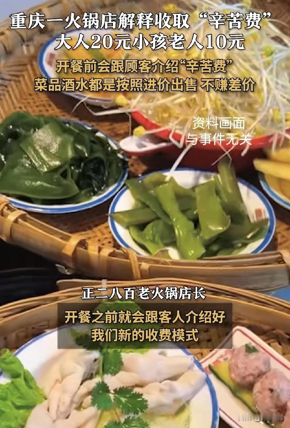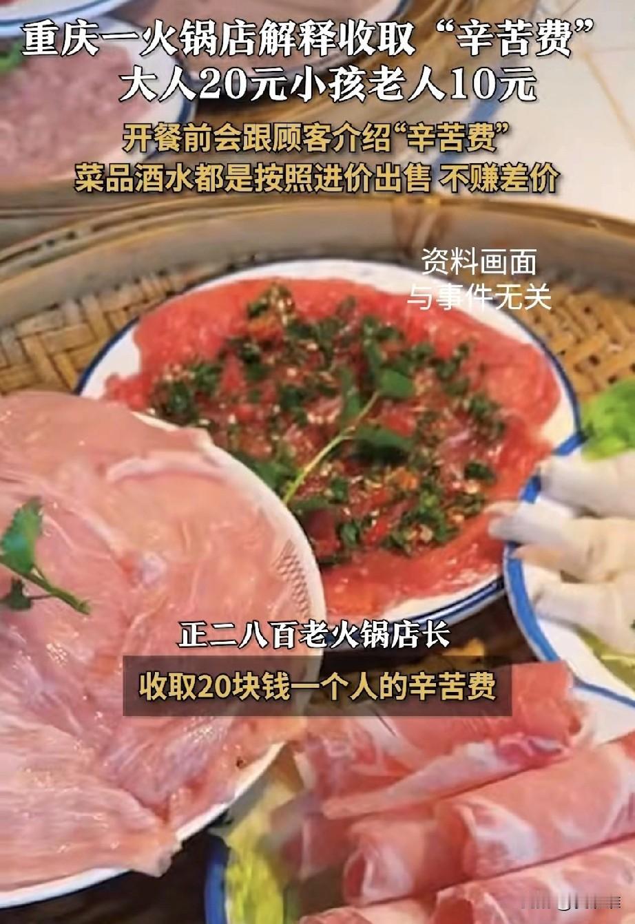 重庆一女子带家人吃火锅,结账时傻眼了,账单上竟有一项“辛苦费”,大人20元、老人小孩10元,一顿饭总共被收70元,女子当场质问,店方解释:菜品酒水都是按进价卖的,所以额外收辛苦费抵人工成本,门口有提示,接受不了可以免单。 女子却觉得离谱:服务员干活不是应该老板付工资吗?再说也没人事先明确告知,这不成了“强制小费”?事情传到网上,吵翻了天有人批评这是变相乱收费,欺负消费者;也有人认为明码标价,嫌贵可以不去。你怎么看?吃饭收“辛苦费”,这钱该不该付?