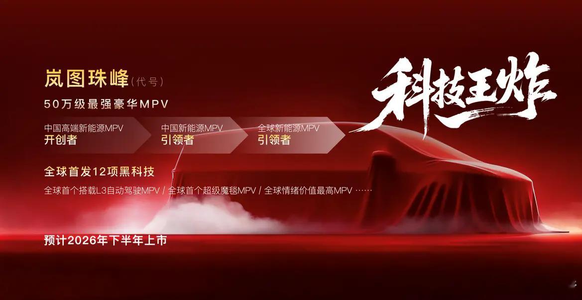 哦,这是属于官方直接预告“打明牌”?算上岚图泰山Ultra版本,今年要安排的四款新车。信息大家都看图片吧,其实岚图的打法挺密集的,每一款车都挺有特点,有做家用空间的、有玩驾驶乐趣的、有做行政旗舰的......比较好奇“王炸”的珠峰MPV,首发12项新技术,全球首个搭载L3级自动驾驶MPV,配备超级魔毯系统等,定位科技王炸,就看国家队怎么出力了。岚图汽车大v聊车