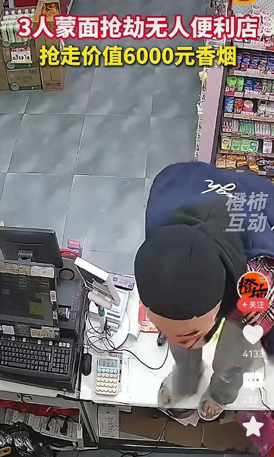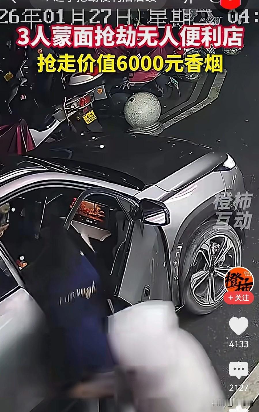 1月27日,湖南永州,3名貌似20来岁的年轻人,头上戴了个蒙面的头套,就敢凌晨4点勇闯五家无人超市,太狠了。 监控画面记录下令人错愕的一幕,三人中其中两人穿着拖鞋,竟熟练地通过扫码开门进入店内,同行的女子则负责徒手阻挡自动闭合的店门,三人分工明确地展开“扫货”行动。 他们前后三次往返,将货架上的香烟尽数装入随身物品,在警报声突然响起时慌忙逃窜,慌乱中甚至遗落了一只拖鞋,最终扬长而去。据商店老板事后统计,当晚包括其店铺在内的五家无人超市遭窃,仅香烟损失就达6000元人民币。 随着案件发酵,网友热议的焦点成了这到底是偷还是抢啊?简单说,他们没动手打人,也没威胁谁,就是趁没人偷偷拿东西,这在法律上就是盗窃。而且6000块钱已经不算小数了,再加上是团伙作案、一晚偷了五家,胆子太大了。 再说无人超市,这两年确实方便,24小时营业不用排队,但安全问题也一直让人操心。之前也有地方发生过无人超市被偷、被砸的事儿,有的是用工具撬门,有的就像这仨人一样,钻了扫码开门的空子。 永州凌晨的这起盗窃案,以一种荒诞的方式提醒我们,技术的进步可以改变消费模式,却无法替代规则的约束与法治的威严。