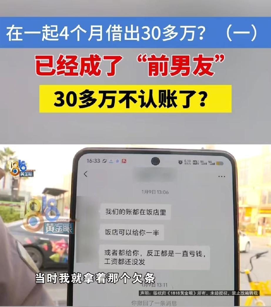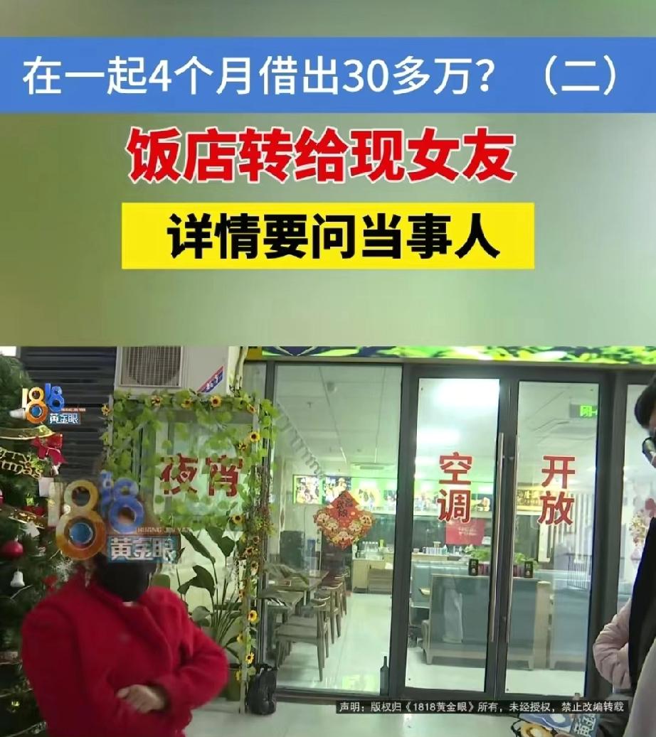 浙江杭州,女子路上偶遇一名饭店老板,两人熟悉之后,女子便到男子店里干兼职,最后还当了店长。期间,男子对女子嘘寒问暖,让夫妻感情不合的女子瞬间心动,两人谈起了恋爱。事后,男子以各种名义找女子借钱,四个多月,女子共借出30多万。后来,两人感情不和不手,女子要求对方尽快还钱,谁知,男子竟翻脸不认账,一口咬定这钱是她给饭店投资买股份的,并非借款。两人为此争执不下。 刘女士和范老板之间的纠葛,得从去年三月说起。 那天刘女士下班走在路上,范老板拎着东西往家走,两人迎面碰上。范老板主动搭话,刘女士起初没理,对方又问了一遍,她才答自己是做人力资源的。 范老板随即说,自己开了家饭店,正需要人手,能不能加个微信帮忙推荐员工。刘女士想着或许能谈成合作,便通过了验证。 之后刘女士推荐了几个人过去,但都没应聘上,两个人熟悉起来后,刘女士下班后开始去他店里帮忙,还逐渐当上了店长。 两人感情突飞猛进,范老板对她格外照顾,送花、转账520,这些“情侣式”表达没断过。 当时刘女士和丈夫感情不和,虽未离婚但已分居,感情空虚时遇上猛烈追求,她渐渐动了心。 去年4月19日,两人正式确定恋爱关系。 但这段时间里,范老板陆续向她借钱,第一笔2万,理由是去提车,接着一笔10万,说是饭店合伙人要撤资,急需补上,其余还有零零散散的转账,加起来足有23万。 刘女士也说不清为什么如此信任他,就感觉他说话办事挺靠谱的,无条件给他借钱。 4月19日,范老板还正儿八经写下一张借条,写明借款23万。 之后,刘女士还继续转钱给他,有时是借款,有时是垫付店里开支,前前后后她又掏了18万左右。 本以为两人可以修成正果,谁知8月份,两人感情急转直下。 刘女士伤心的表示,范老板开始因各种小事责骂她,她心凉离开,当时对方承诺,会将借的钱慢慢还给她加利息也行。 可一个多月后,刘女士奶奶生病急需用钱,联系他结账时,对方却变了脸,一口咬定她的钱都投在饭店里了,店里现在不赚钱,跟他无关。 刘女士拿出借条照片质问,范老板承认是他写的,但坚持说那笔钱是投资,不是借款。 刘女士气得发抖,这30多万里不少是她从别处借的,如今只能靠打零工过日子。 无奈之下,她找到媒体求助。记者陪她去找范老板时,一位张女士站出来,自称是范老板现任女友,两人已准备领证结婚。 她表示,范老板去年八月末就和刘女士断了联系,欠条也早已撕掉,他们俩谁也不欠谁,就是感情纠纷。 刘女士立刻反驳,之前他们双方在派出所对账,算到一半范老板就跑了,她自己仔细算过,刨除所有红包、日常往来,对方至少还欠二十三万左右。。 退一万步讲,就算真钱真是投资,店怎么悄无声息转让了?不告知她这个股东吗? 关于撕欠条一事,刘女士解释说,出于信任,第一张确实撕了,后来范老板又重写了一张,拍照发给她,自己手头没有原件。 对此,范老板的说法完全不同。 他强调,自己离异带娃,当初以为刘女士也单身才在一起,本来已经到了谈婚论嫁的地步,可万万没想到,后来他竟发现刘女士根本没离婚,所以果断分开。 那10万块钱,是刘女士自愿买股份的钱,都是躺在床上说的话,所以并没有文字记录。 此外,刘女士曾经自己开了家美容店,他帮忙付过加盟费、房租和装修,大概18万,这些都能查。 最后转的六万,其实是品牌方退的加盟费,经过她手转交而已。 他两确实在派出所对过账,经过计算,她转我24万9,我转她23万,基本持平。 本以为这就是一两万的事情,但让他接受不了的是,刘女士曾去他母亲家和孩子学校找人闹事,把老人孩子吓得不轻。 但他仍表示愿意再对一次账,如果自己欠她,他愿意还,如果她欠自己的,他就不要了。 刘女士听完更加激动,她承认对方帮她开过店,但绝不认可10万是买股份的钱。 两人各执一词,最后都表示,愿意再坐下来,把账一笔笔算清楚。 眼下,饭店早已转给现任张女士,刘女士仍在打零工还债。感情散了,信任没了,只剩下一堆说不清的数字,和两颗互相怨怼的心。