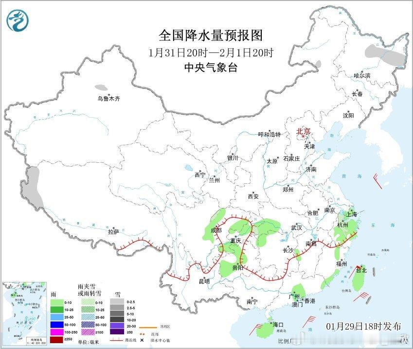【大范围雨雪】昨晚到今天,新疆西藏青海甘肃陕西山西河南湖北部分地区出现降雪。今晚到明天降水范围达到鼎盛阶段。从华北到长江中下游沿线有降雪,其中西藏东部、陕西南部、河南西南部等地局地有大到暴雪(10~18mm)。湖北西部、湖南中部局地有冻雨。后天北方降雪总体缩减,长江中下游地区可能还有降雪、雨夹雪。湖南部分地区可能还有冰粒、雨夹雪或冻雨。合肥一带未来雨雪相态多变,30日凌晨和31日凌晨有可能短暂降雪,白天还是降雨为主。另外2026年还没下过雨的广州、佛山、中山、珠海、东莞、厦门等城市,在月底2天有望迎来今年首场降雨。2月1日我国降水明显缩减。我国大部地区又将开启3-4天少雨的模式,降水主要在西藏。2月4日晚-5日,南方降雨会再次发展增多。
