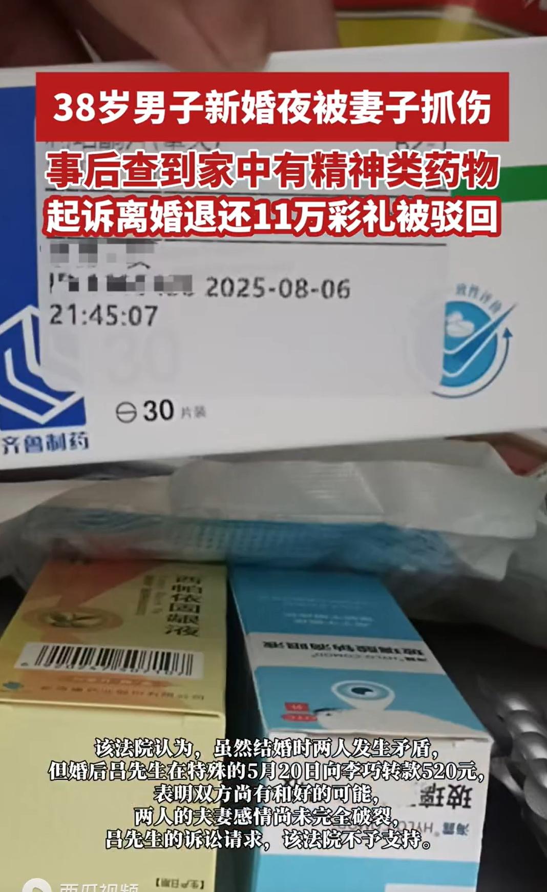 四川宣汉,一货车司机经媒人牵线与妻子相识,短暂相处后结婚。婚礼当晚,夫妻即发生激烈冲突,司机面部被妻子抓伤出血。事后,司机虽为顾全面子对外谎称摔伤,但裂痕已生,更在自家柜中发现妻子名下的精 神类药物“利培酮片”,购药时间显示在婚后,男子由此强烈怀疑对方婚前隐瞒病情。一怒之下,男子将妻子及其家人告到法院,要求离婚并追回为结婚所付的11万余元彩礼,称其中大部分是借贷。法庭上,妻子否认隐瞒,强调婚姻有效,并指出男子曾转账“520”元示好,证明感情未彻底破裂。岳母更称,病情“婚前男子是知道的”。法院审理后,认为双方感情基础虽弱,但仍有和好可能,一审判决不准离婚。男子不服,本打算提起上诉,奈何无力支付律师费。 据悉,吕先生年近四十,是个货车司机,常年在广东各地跑车,经济上并不宽裕,一直未婚。 为了早日结婚,吕先生咬牙在县城买了房并着手装修,还购置了一辆小轿车,让媒人介绍姑娘。 2024年秋天,吕先生接到了老家同村媒人传来的一个消息,说有位条件不错的本地姑娘,可以介绍认识。 9月23日,吕先生回到宣汉,在媒人陪同下先见了女方的母亲,对方对他有房有车、踏实肯干的印象不错,便把女儿李巧的微信推给了他。 两天后,吕先生驱车前往重庆李巧姐姐家,见到了李巧“戴着眼镜,比较斯文、内向”,初次见面感觉良好。 两人一同逛了重庆地标,当天便返回了宣汉。 为了增进了解,10月初,吕先生带着李巧回到了广东佛山的租住处。 在约20天的共同生活里,他们分床而居,之后,李巧返回重庆,双方主要通过微信和电话联系。 这期间,吕先生通过转账等方式,向李巧及其母亲支付了共计1.4万元。 随后,两人拍了婚纱照,于2025年1月13日做了婚检并领取了结婚证。 而为了凑齐礼金,吕先生通过借贷和信用卡透支,给李巧父母的彩礼68000元、“祝神封”13776元,以及为李巧购买的金饰价值18370元。 1月21日,两人举办了婚礼,召集了亲朋好友,摆了约40桌的酒席。 然而,新婚当晚10点多,回到装修一新的婚房后,妻子李巧突然用双手抓伤了他的脸,致使出血。 一段视频显示,躺在贴着“喜”字的婚床上的吕先生,脸上带着血迹,质问李巧“你是不是有喜欢的人?” 李巧则两次反问“你还录了音的啊?”。 次日,按照习俗“回门”,吕先生为了顾全双方颜面,对岳母谎称伤是自己摔的,还因此收到了岳母给的2000元“医药费”。 吕先生称,几天后因争执盖被子,他再次被抓伤,但他均未报警处理,选择了“家丑不外扬”。 新婚不久,吕先生便返回广东继续打工,两人聚少离多。 2025年5月20日,吕先生还曾为维系关系做出努力,通过网络给妻子送花并转账520元。表面看来,婚姻仍在维持。 2025年10月,吕先生在壁柜中发现了一盒写有李巧名字的“利培酮片”,药盒显示购于2025年8月6日,而该药品用于精 神分裂症治疗。 这个发现对吕先生而言犹如晴天霹雳,他怀疑妻子婚前隐瞒了重大疾病,甚至产生了遭遇“婚骗”的念头。 尽管他多次询问,但未获对方明确解释,信任彻底崩塌。 2025年11月,吕先生卖掉小轿车筹集律师费,向法院提起离婚诉讼,同时请求李巧返还结婚时支付的彩礼,总计约11万余元。 法庭上,李巧给出了完全不同的版本,她否认吕先生所称的“无夫妻生活”,强调自己是“明媒正娶”,双方办理了合法登记并举办了酒席。 李巧认为两人结婚时间短,并未发生不可调和的重大矛盾,感情尚未破裂,期间,自己一直住在婚房内,双方并未分居,且吕先生在起诉前的5月20日还有示好转账行为。 对于彩礼,李巧认为依法不应返还,且数额没有吕先生说的那么多。 法院会如何判决呢? 《民法典》第一千零七十九条规定,法院判决离婚的法定标准是“感情确已破裂”。 法院指出,李巧与吕先生系短暂相识后结婚,婚姻基础薄弱,虽在新婚夜发生抓伤冲突,但吕先生并未及时通过报警等方式固定“感情彻底破裂”的证据。 关键是,在冲突发生数月后的2025年5月20日,吕先生主动向李巧转账520元并赠送鲜花,这一具有特定寓意的行为,在法律上构成了其曾意图维系、修复夫妻关系的直接证明。 法院认为,这难以认定双方感情已彻底、不可逆转地破裂。 关于隐瞒疾病的指控。 《民法典》第一千零五十三条规定,一方行使撤销权需证明对方婚前患有重大疾病且未如实告知。 法院进一步指出,吕先生仅能提供李巧婚后购药证据,无法证明李巧婚前已知悉患病并故意隐瞒。 相反,双方自愿婚检并登记,吕先生对此主张举证不足,谁主张,谁举证,其应承担举证不利后果。 最终,法院判决驳回了吕先生的离婚诉求,而退还彩礼的前提是双方离婚,自然也无法获得支持。 对此,您怎么看?
