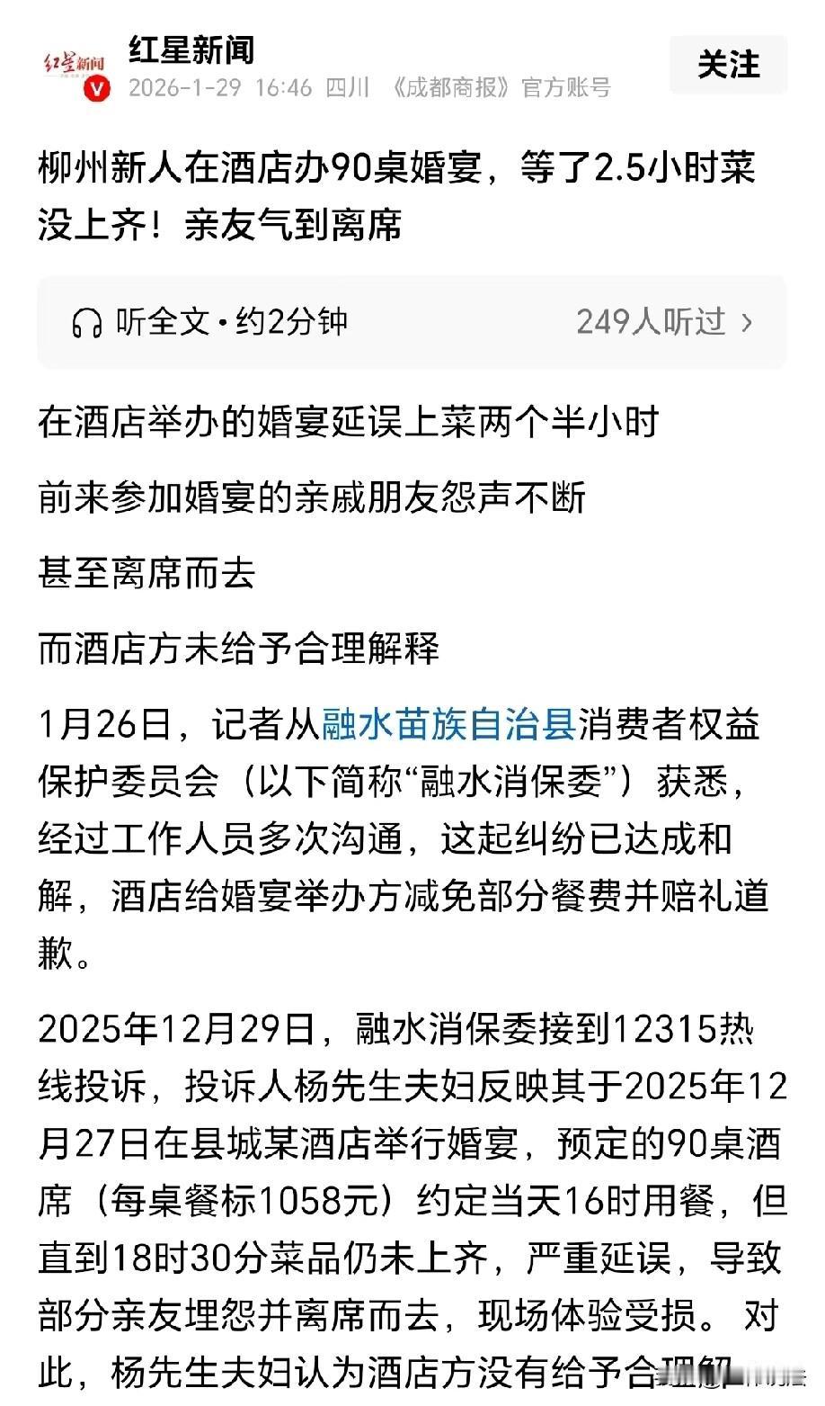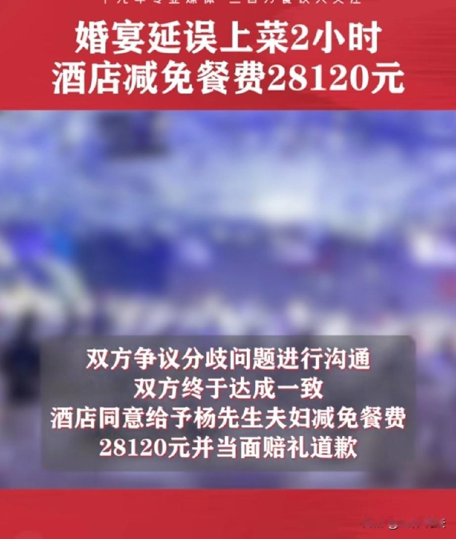 太闹心了!广西柳州,新人结婚预订了90桌酒席,本想着热热闹闹大办一场,可谁知,酒店却在关键时刻掉链子,亲朋好友们坐在餐桌等了两个半小时,菜都没上齐,气得不少亲友当场离席。新人的脸面也荡然无存,要求酒店赔偿并赔礼道歉,酒店竟认为新人的要求不合理,拒绝协商。 2025年12月27日,对于杨先生夫妇来说,本该是人生中最幸福、最难忘的日子,他们在县城某酒店举办婚宴,预订了90桌酒席。 为了能让这场婚礼倍有面子,杨先生夫妇特意选择了每桌1058元的餐标,还特意提前约定好用餐时间,只盼着能热热闹闹、顺顺利利地完成这场人生大事。 婚宴开始前,杨先生乐呵呵的迎接着亲朋好友们的到来,想着让亲朋好友们都吃得开心,见证他们的幸福时刻。 杨太太也满心期待,精心打扮,就等着在婚礼上绽放光彩。 然而,现实却给了他们沉重的一击。 开席后,酒店的菜品迟迟上不来,稀稀拉拉的根本赶不上吃席的速度,开席两个半小时后,菜品竟然还没上全。 亲朋好友们坐在餐桌前,左等右等,渐渐的没了耐心,开始怨声载道,吐槽这酒店不靠谱,更暗含着杨先生夫妇婚宴的失败。 杨先生夫妇急得像热锅上的蚂蚁,催了酒店好几次,就是没有进展,菜品迟迟不来,他们俩更是尴尬的要命,恨不得找个地缝钻进去。 更糟糕的是,由于上菜严重延误,部分亲友实在等得不耐烦,直接离席而去。 杨先生夫妇看着离去的亲友,只觉得脸上火辣辣的,脸面荡然无存。 更气人的是,发生这样的婚宴事故,酒店方连个合理的解释都没有,这让杨先生更加气愤,只能毫不犹豫地拨打了12315热线投诉。 接到投诉后,消保委高度重视,马上组织工作人员到酒店了解情况。 面对调解,杨先生夫妇表示:因为酒店延误上菜,服务态度还差,严重影响了我们婚宴的顺利进行,我们要求酒店减免部分餐费,书面赔礼道歉,还要给予精神损失赔偿。 酒店方却觉得杨先生夫妇提出的诉求不合理,不就是上菜上慢了点嘛,至于这样嘛,又是投诉,又是要求赔偿,脸可真大。 酒店拒绝了杨先生夫妇的要求,双方都调解陷入了僵局。 第一次调解失败后,消保委工作人员没有放弃,又多次就双方争议的分歧问题进行沟通。 经过消保委工作人员的不懈努力,双方终于达成了一致。酒店同意给予杨先生夫妇减免餐费28120元,并当面赔礼道歉。 事后,有人觉得,就算酒店减免了餐费,杨先生夫妇的面子也早就丢大了,这心理阴影估计一时半会儿都消不了。 这酒店肯定是自身接待能力不足,根本忙不过来,才会出这么大的纰漏,只是害苦了杨先生夫妇。 杨先生夫妇虽然得到了酒店的赔偿和道歉,但这场婚宴带来的不愉快回忆,却不知道什么时候才能彻底消散。