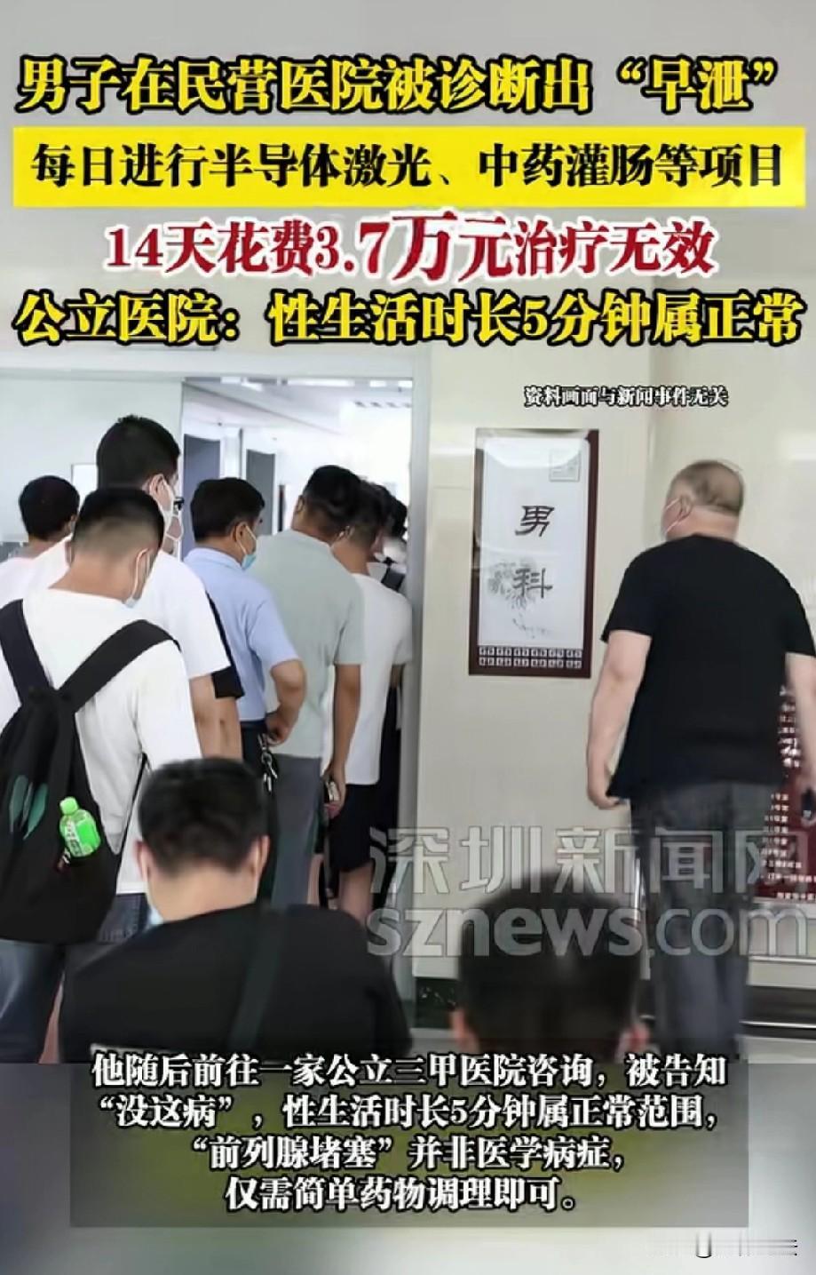 被坑惨了!山东青岛,38岁男子正值壮年,但夫妻生活时间太短,让他非常困扰。情急之下,他在网上找了家私立医院去看,每天都进行半导体激光和中药灌肠等项目,14天就花了3.7万余元,但一点效果都没有。费用太贵,男子负担不起,又找了家公立三甲医院,谁知医生表示:你根本没病,性生活5分钟就属于正常。男子一听这话,感觉自己被坑惨了,马上将私立医院投诉。 38岁的孙先生正值壮年,本该是夫妻和睦,生活幸福的时候,谁知,夫妻生活方面的事儿却让他头疼。 他觉得,他们两口子夫妻生活时间太短,妻子不满意,自己也挺焦虑的,就想着找个医院好好看看。 偶然间,他在网上看到青岛某私立医院的宣传,说能解决他这类问题,他就像抓住了救命稻草一样,赶紧去了这家医院就诊。 到了医院,医生给他诊断了一番,说他患有早泄,还有前列腺堵塞,需要马上治疗。 孙先生没有多想,马上同意,当天,医院就给他施打了三针降敏针,还进行了腺体疏通,这一套下来,花了7000多块钱。 一次就花这么多,孙先生着实有点心疼,但想着只要能治好病,花就花吧。 接下来的14天里,孙先生每天都按照医院的要求,进行半导体激光腔道介入和中药灌肠等项目。 这期间,钱像流水一样花出去,总共花费达到了3.7万余元。 可让孙先生崩溃的是,花了这么多钱,症状却一点儿都没有改善,时间还是那么短。 更让他生气的是,医院从头到尾都没给他提供诊断证明和检查报告,他不禁怀疑,这医院到底靠不靠谱。 因为实在无力承担后续的费用,孙先生只好终止了治疗。 但他还是不甘心,就又去了一家公立三甲医院咨询,到了公立三甲医院,医生的话让他彻底懵了。 医生表示,他这种情况根本不叫病,夫妻生活时长5分钟就属于正常范围,而且前列腺堵塞并不是医学上的病症,只需要简单药物调理一下就行。 孙先生一听,顿时火冒三丈,他意识到,自己被那家私立医院给骗了。 花了那么多冤枉钱,丝毫不见效,他越想越气,马上就向卫生部门投诉了这家私立医院。 但卫生部门介入调解后,依然没能给孙先生一个满意的答复。 私立医院一口咬定,他们的诊断是合规的,诊断用语只是形象化表述,收费也是透明的,还可以适当减免费用。 可孙先生根本无法接受这个说法,他觉得私立医院就是在狡辩,不想承担责任。 现在,孙先生心里特别憋屈,他正在考虑通过法律途径来维护自己的权益。 正值壮年遇夫妻生活困扰本就闹心,却因为轻信私立医院宣传又踩了大坑,换谁都生气。 这事也给大伙提了醒,私密健康问题别羞于启齿更别病急乱投医,看病首选公立三甲,专业靠谱不花冤枉钱。