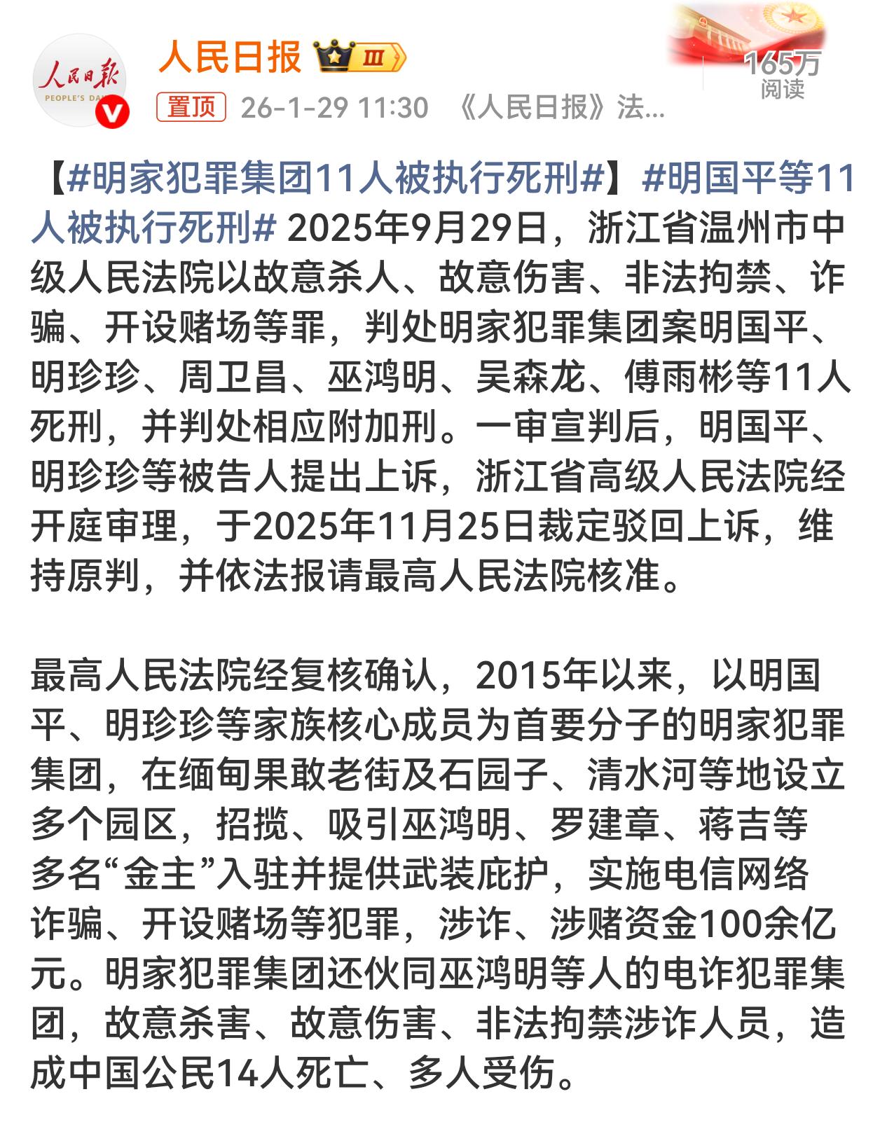 截至2026年1月29日,缅北四大家族中已有16人被判处死刑,其中明家11人已于今日被执行死刑,白家5人死刑判决尚待复核与执行,魏家、刘家相关案件处于公诉阶段,暂无死刑判决信息。 一、明家(明学昌家族) 2025年9月29日,温州中院一审宣判明国平、明珍珍等11人死刑。 2026年1月29日,经最高法核准,该11人被执行死刑。 二、白家(白所成家族) 2025年11月4日,深圳中院一审对白所成、白应苍等5人判处死刑,目前案件在死刑复核阶段。 三、魏家、刘家 相关案件已提起公诉,进入司法程序,暂无死刑判决结果公布。