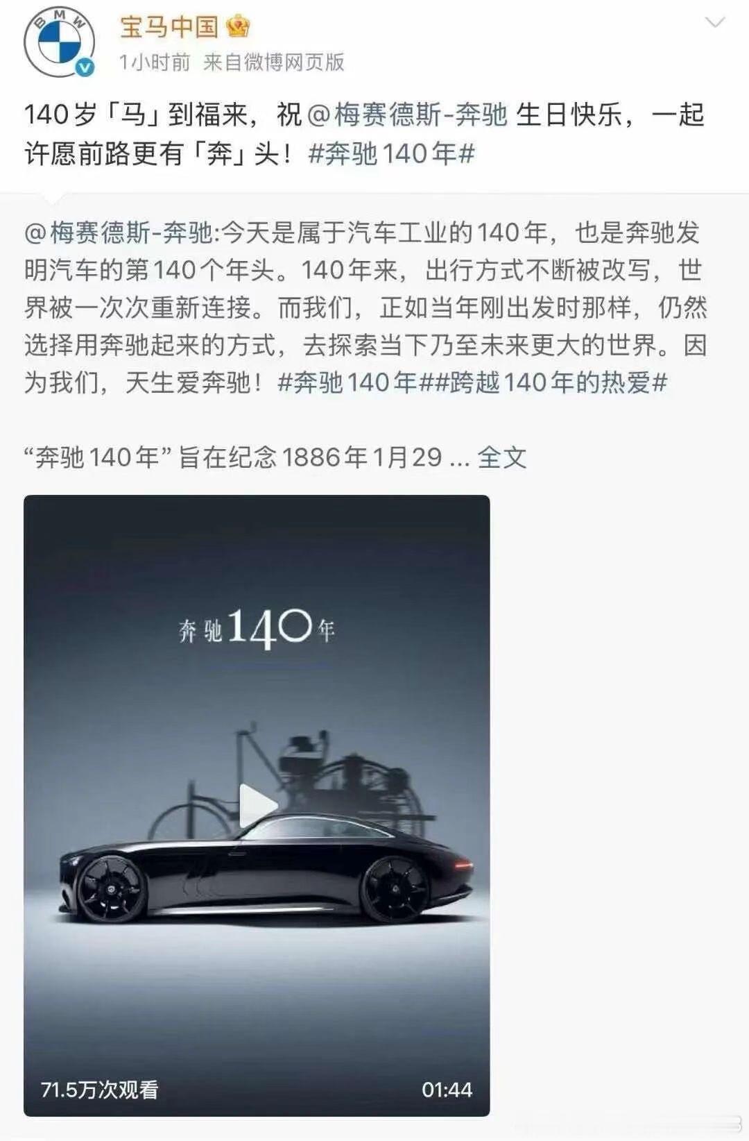 奔驰140年生日快乐惺惺相惜,宝马和奔驰就是这样微妙的关系。只有这样的微妙平衡才能真正成就百年车企。啥时候国内汽车市场上疯狂内卷,不是你死就是我活,非黑即白的舆论环境能变好呢?