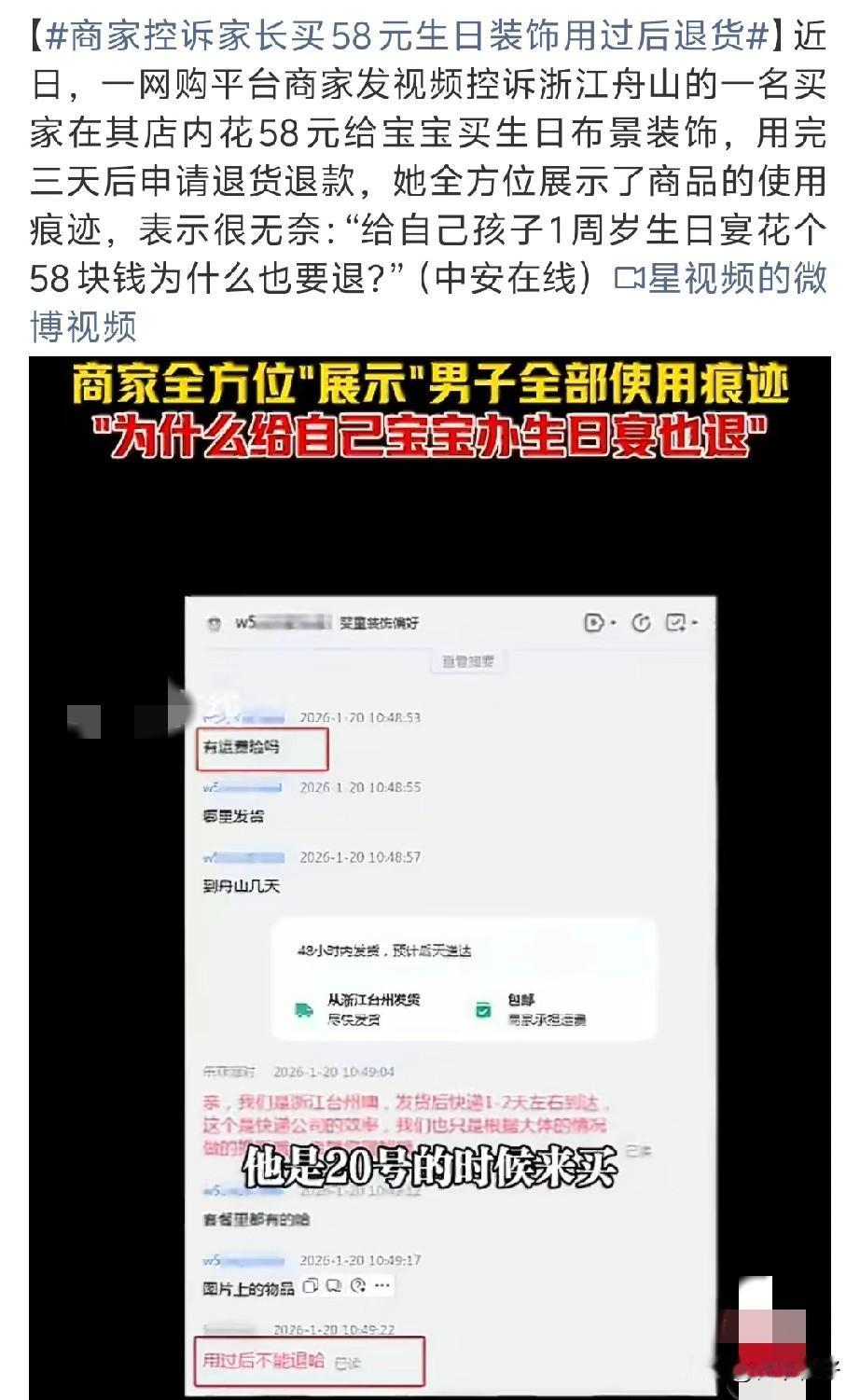 近日,一网购平台商家发视频控诉浙江舟山的一名买家在其店内花58元给宝宝买生日布景装饰,用完三天后买家以“质量问题”为由成功退款退货,商家拆包视频显示气球充气变形、丝带穿孔等明显使用痕迹。 真服了这种占小便宜的人,不能理解这是怎么想的,就58块钱你都用了还退什么?气球都吹过了怎么退,感觉拆起球比打气球还累,这人真的是不怕麻烦,一般这些都是一次性使用的,服务员打扫的时候都是扎破,太碍事不可能一个个拆,他还一个个拆了退。 可能这种人并不是买不起,就是享受占便宜带来的快感,这就是病…当然我们不应用单一事件标签化一个群体(如“舟山家长”),个体行为不能代表地域或身份。